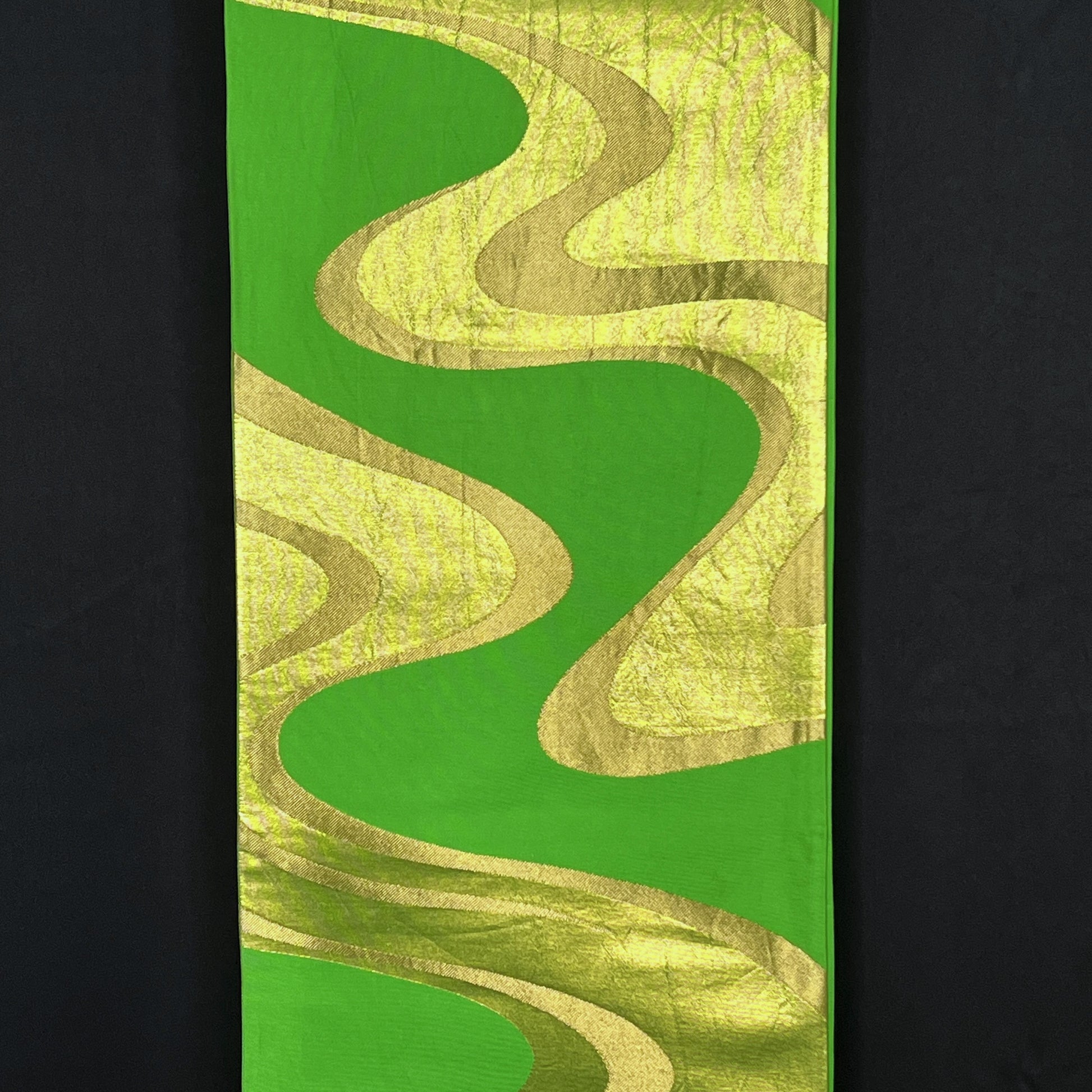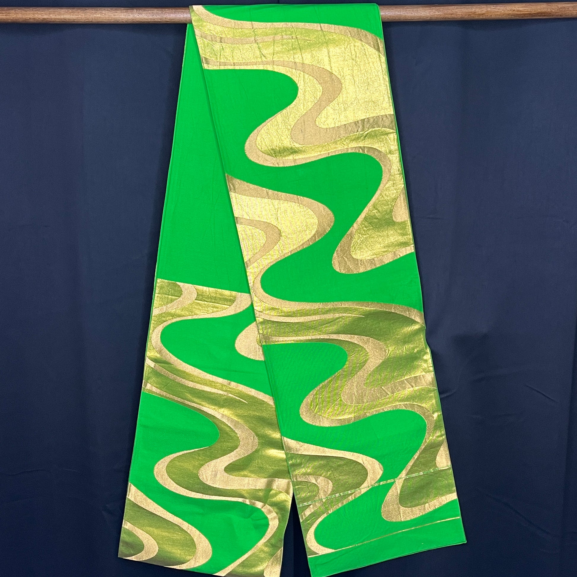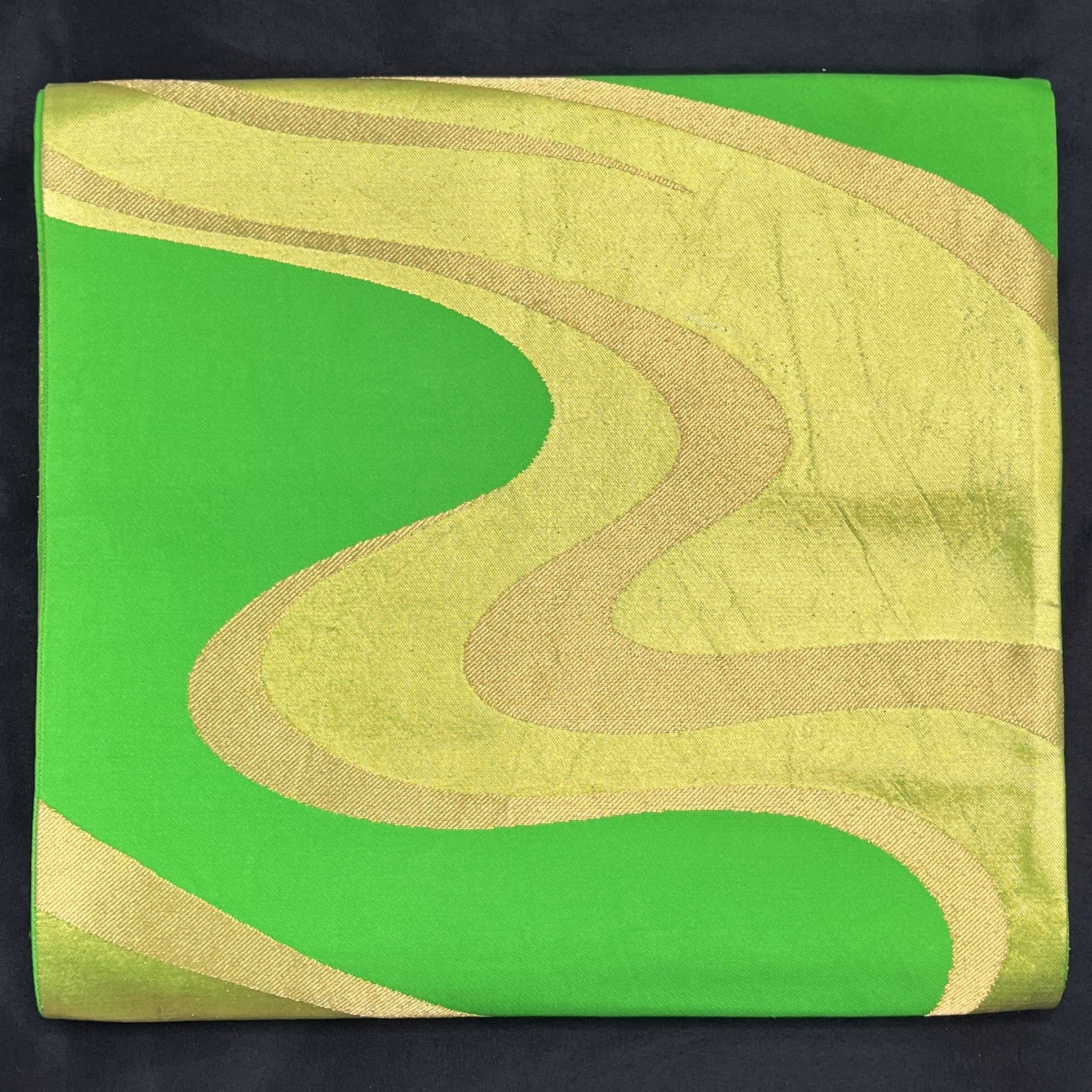 This listing is for a traditional fukuro style obi that features an eye-catching design of a meandering bright gold stream set against a lime green background. The design is nicely balanced between the two colors, ebbing and flowing as it travels along the length.