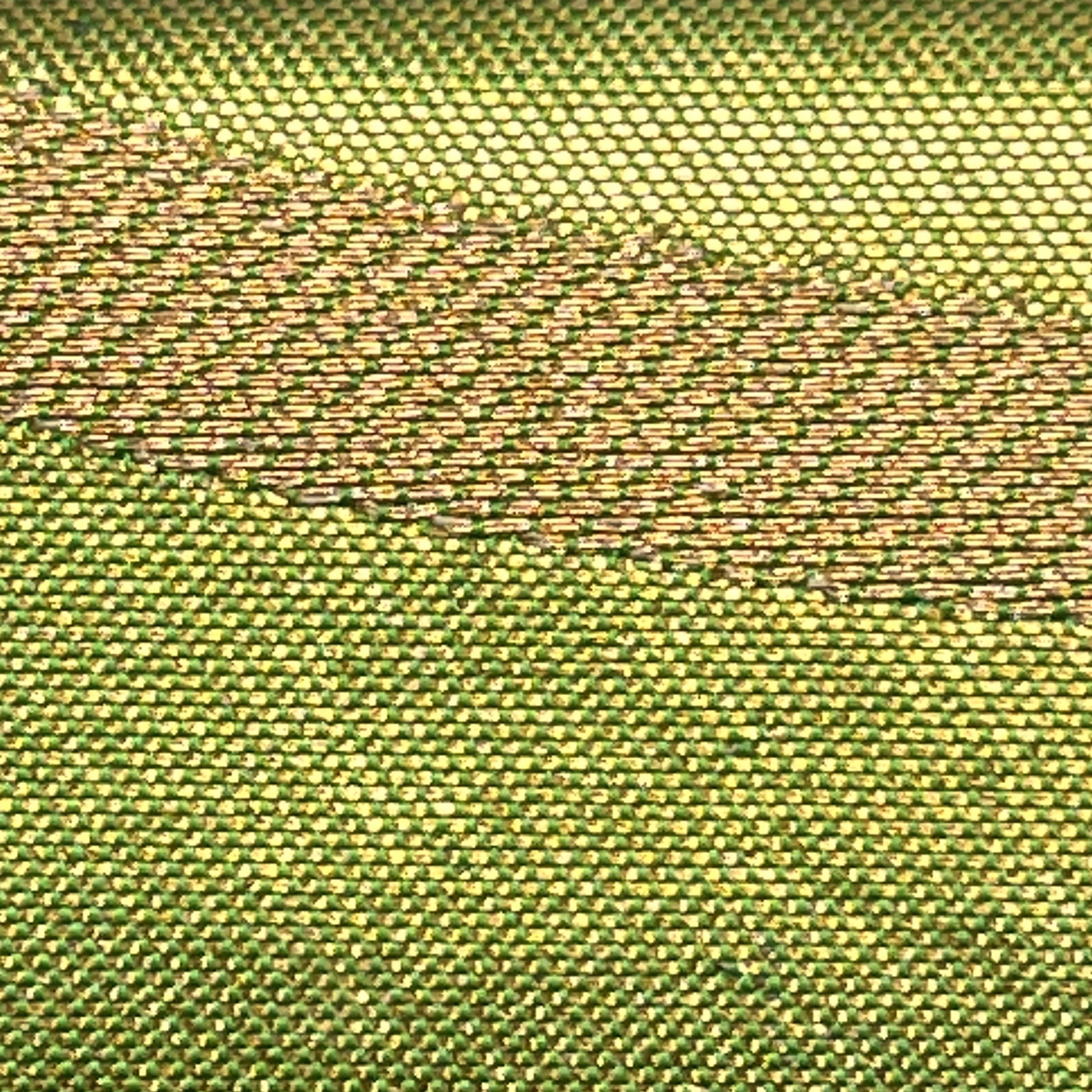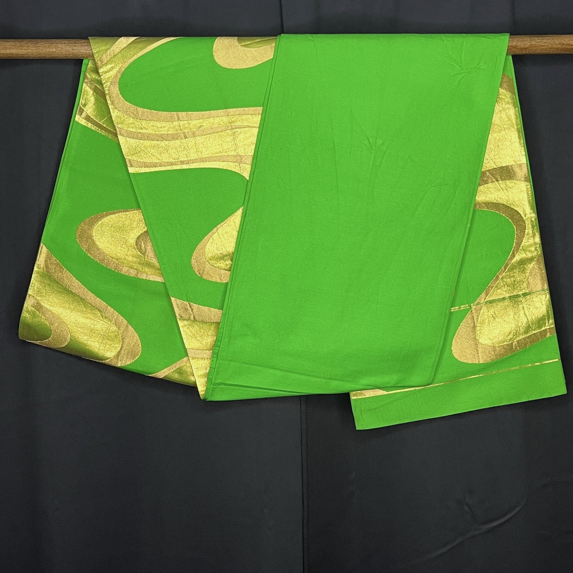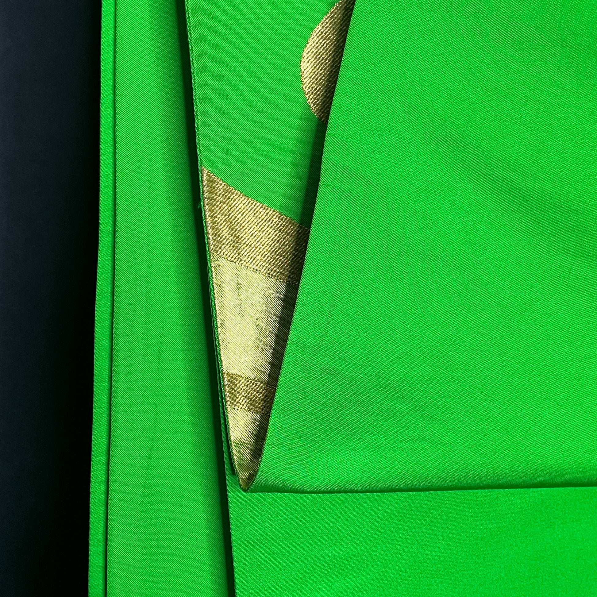 This listing is for a traditional fukuro style obi that features an eye-catching design of a meandering bright gold stream set against a lime green background. The design is nicely balanced between the two colors, ebbing and flowing as it travels along the length.