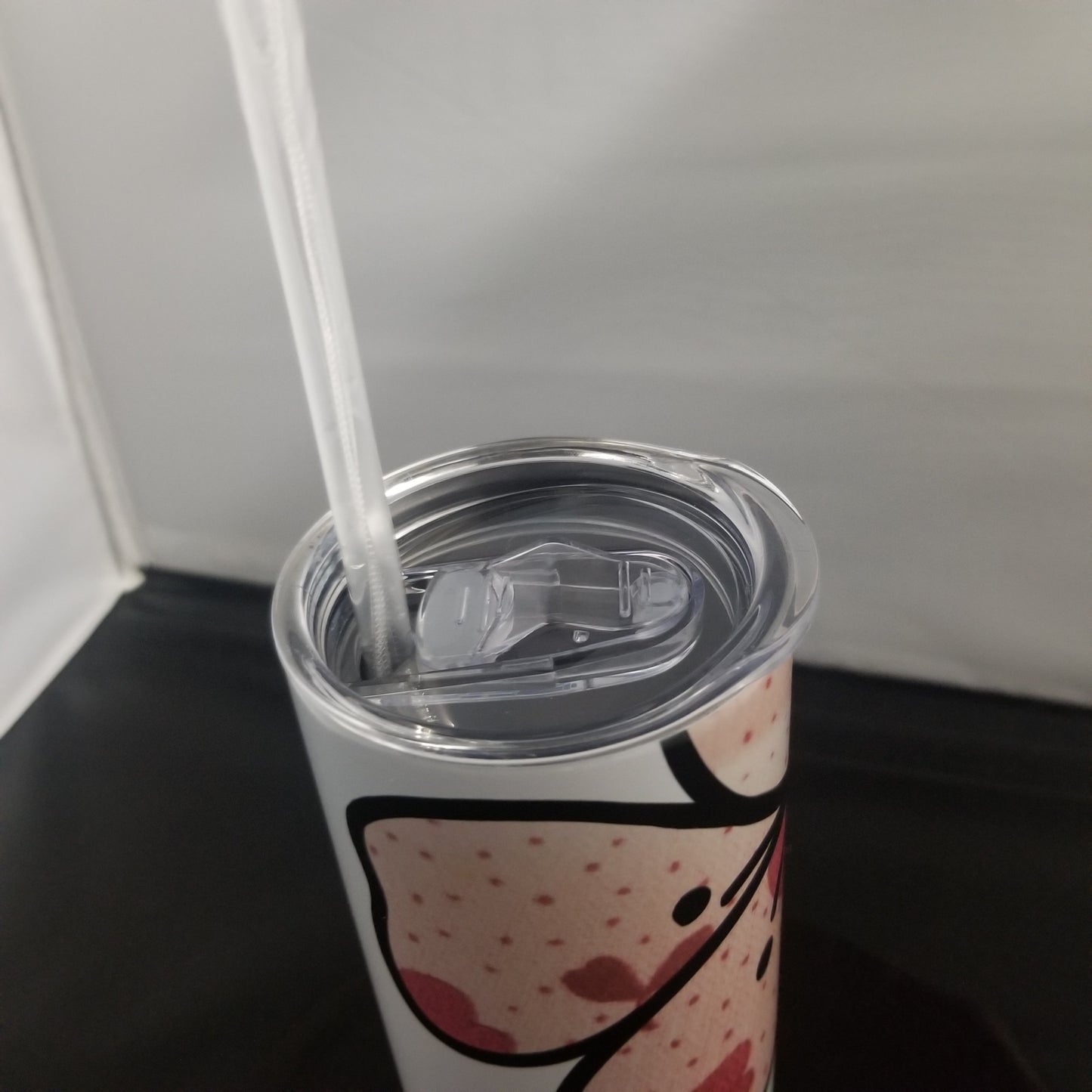 This 20oz tumbler is stainless steel, double-walled, and insulated with a snap-on top with a sliding cover for the opening. These are made-to-order and will ship within four business days.