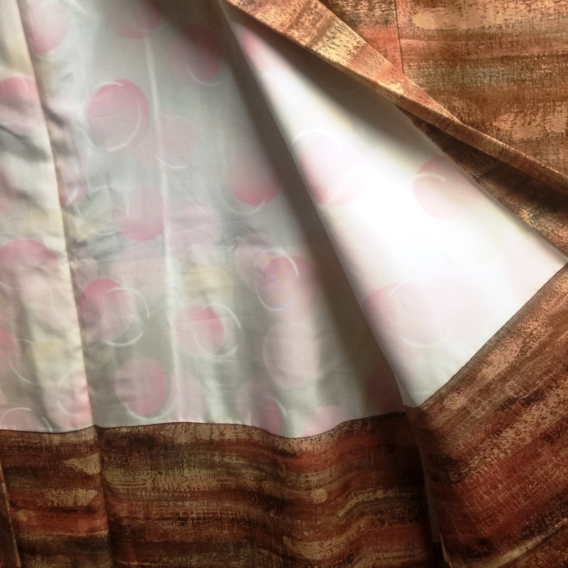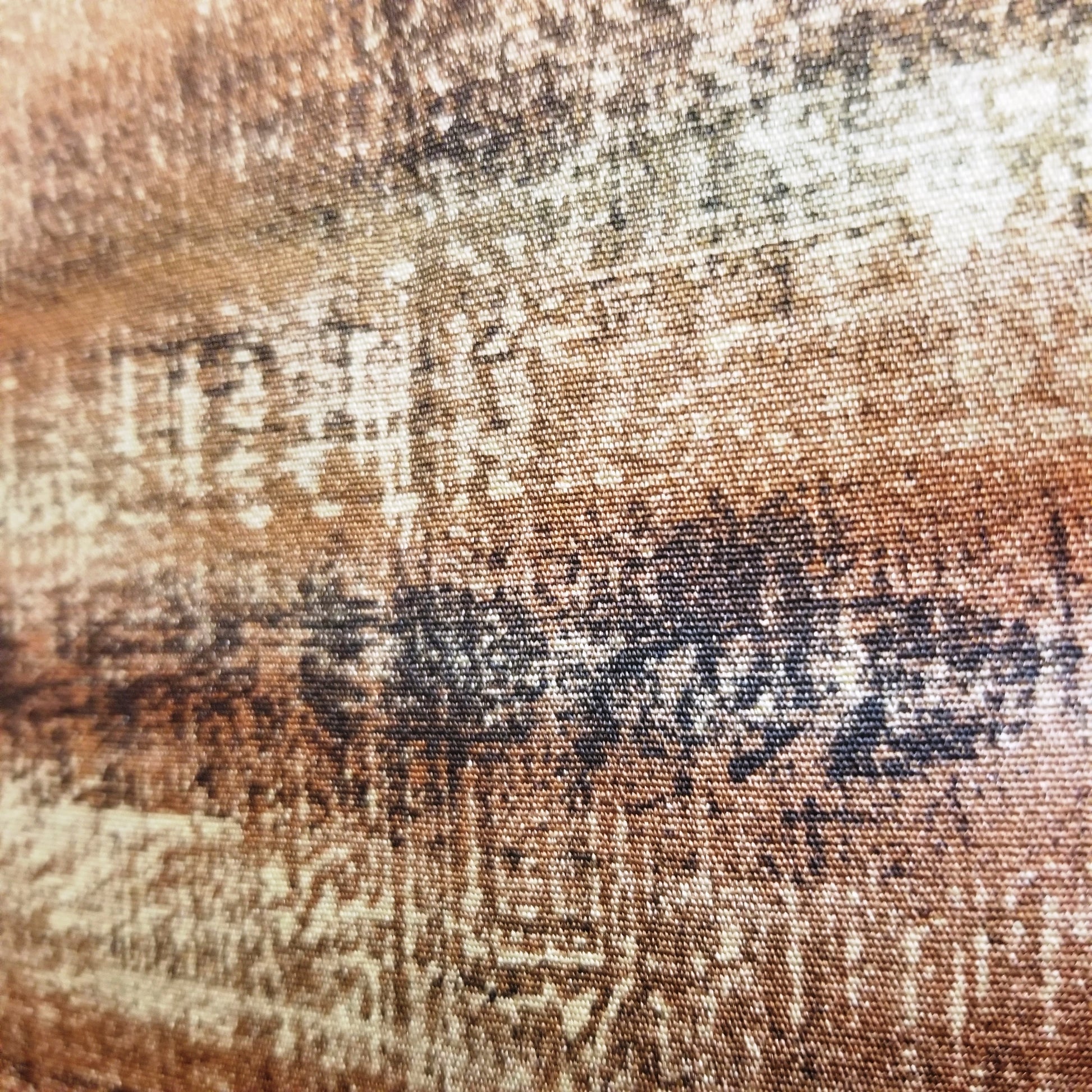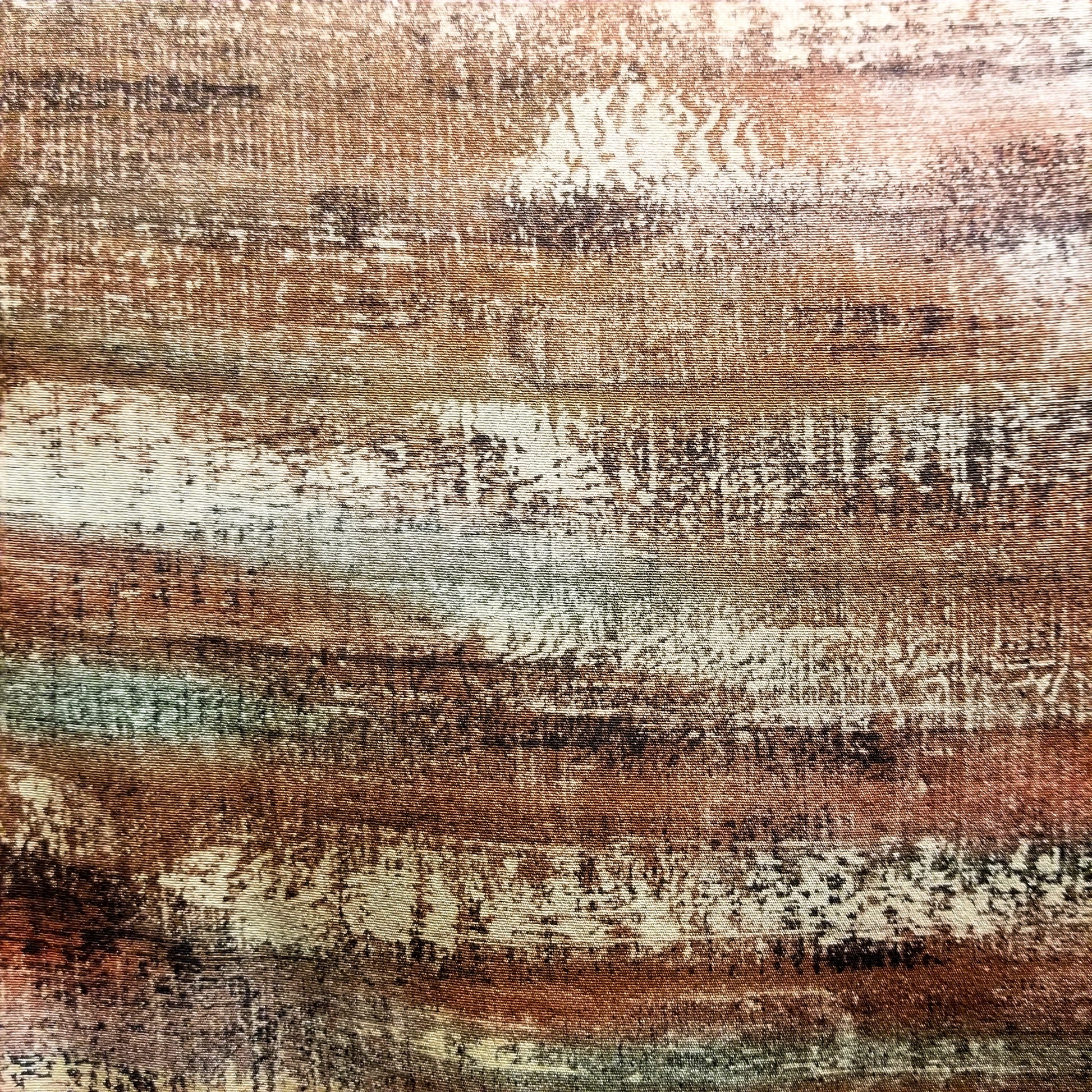 Browns, tans, oranges, and darker accent colors mix and melt together to create a subtle piece of wearable art. Nice drape to the silk.