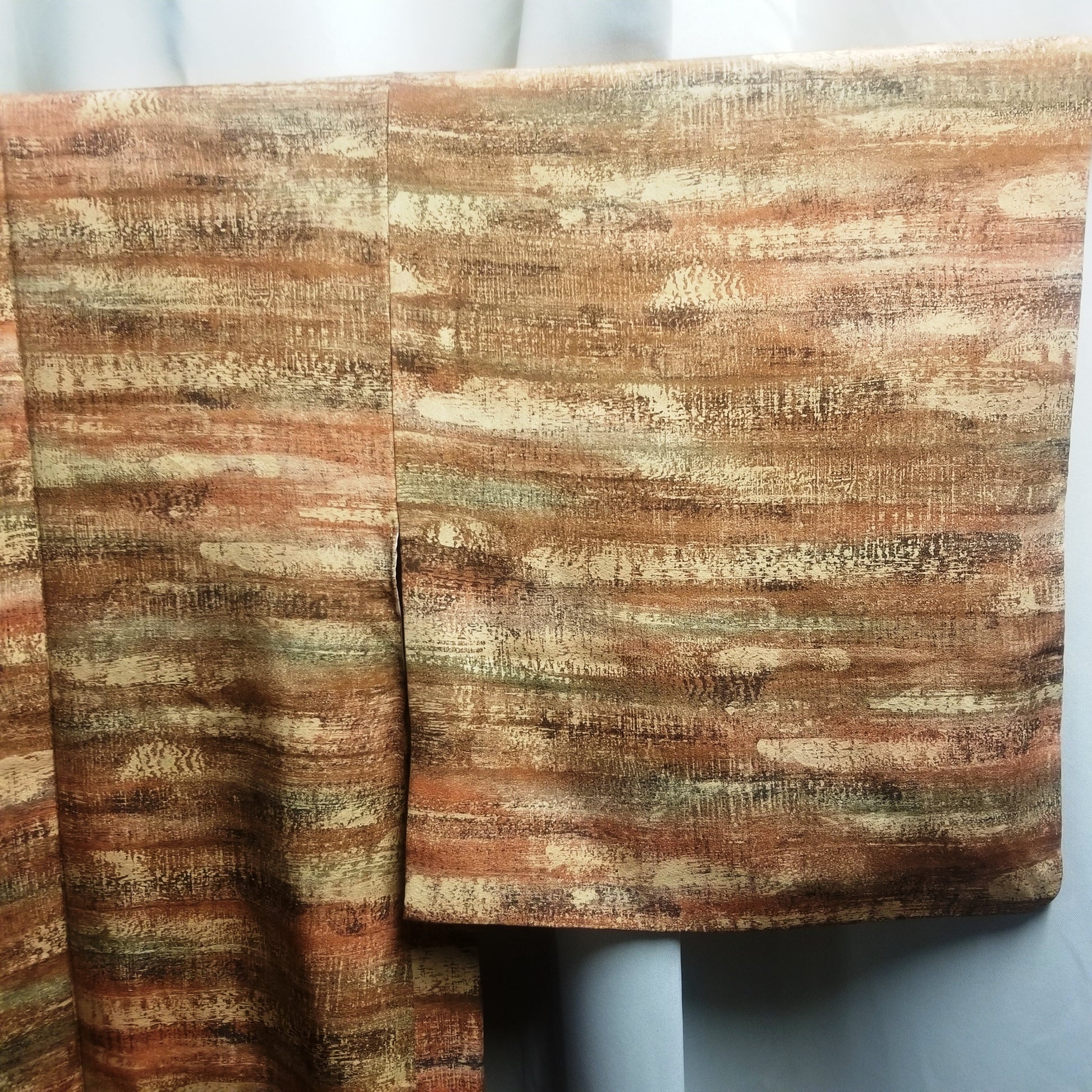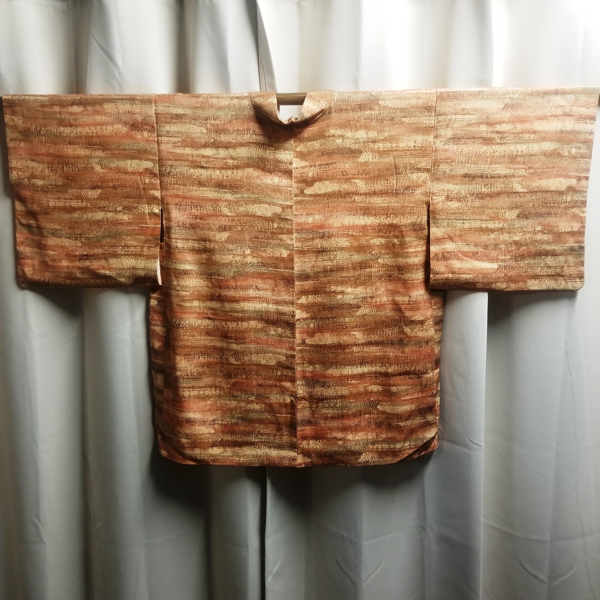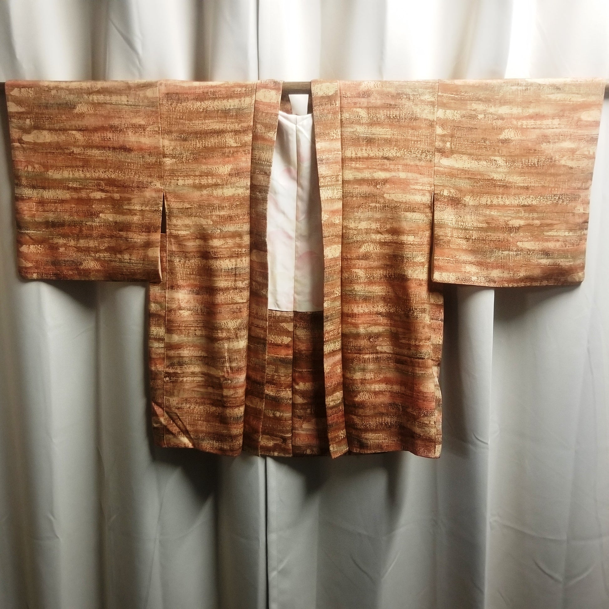 This Oki Haori reminds us of sandstone desert cliffs at sunset. The dye seems to have been brush-painted in mottled bands that have a softness to them. Look closely to see the brushstrokes.