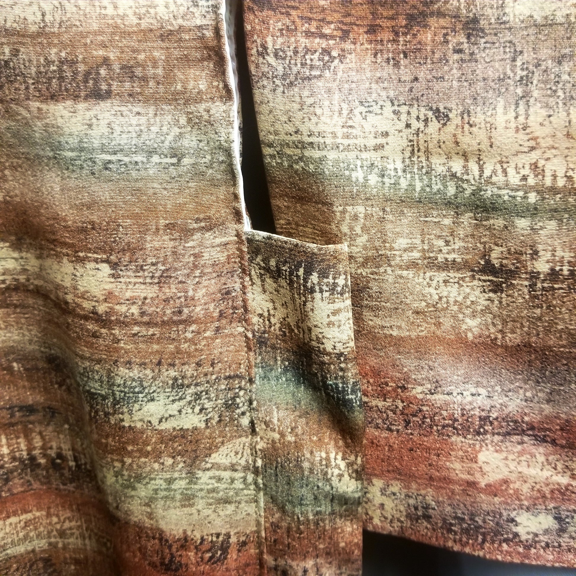 In our Oki Haori Line (oki means "big" in Japanese) of modified haori jackets, we open up the gusset and underarm seams and then re-attached them using every inch of the salvage seam edges. (See photo for detail.) This yields up to an additional 6" of width in the waist, hip, and bust measurements.