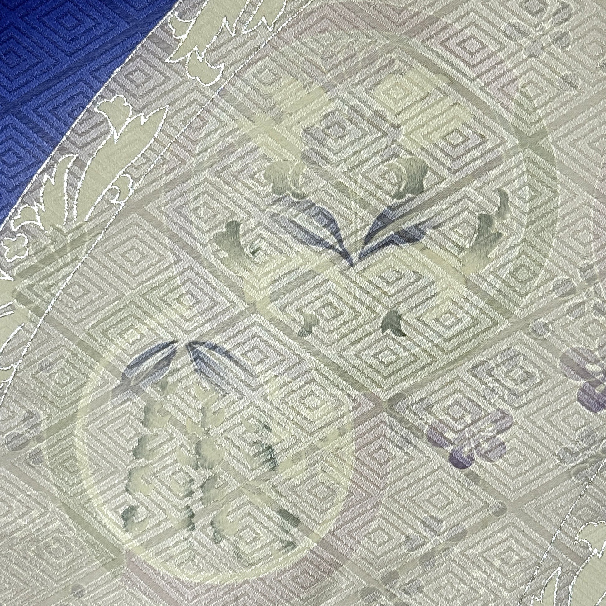 Commanding yet ethereal, this vintage furisode kimono balances a deep sapphire blue with sweeping white forms that reveal an intricate world of symbolism. Within the layered design, mirrored peacocks and cranes appear in balanced pairs, representing beauty, longevity, and harmony. The surface is enriched by a nested diamond jacquard background, overlaid with scrolling waves, florals, and geometrics that unfold slowly as the light moves. Silver leaf accents and delicate couching add a refined shimmer, giving this kimono depth without overpowering its serene palette.