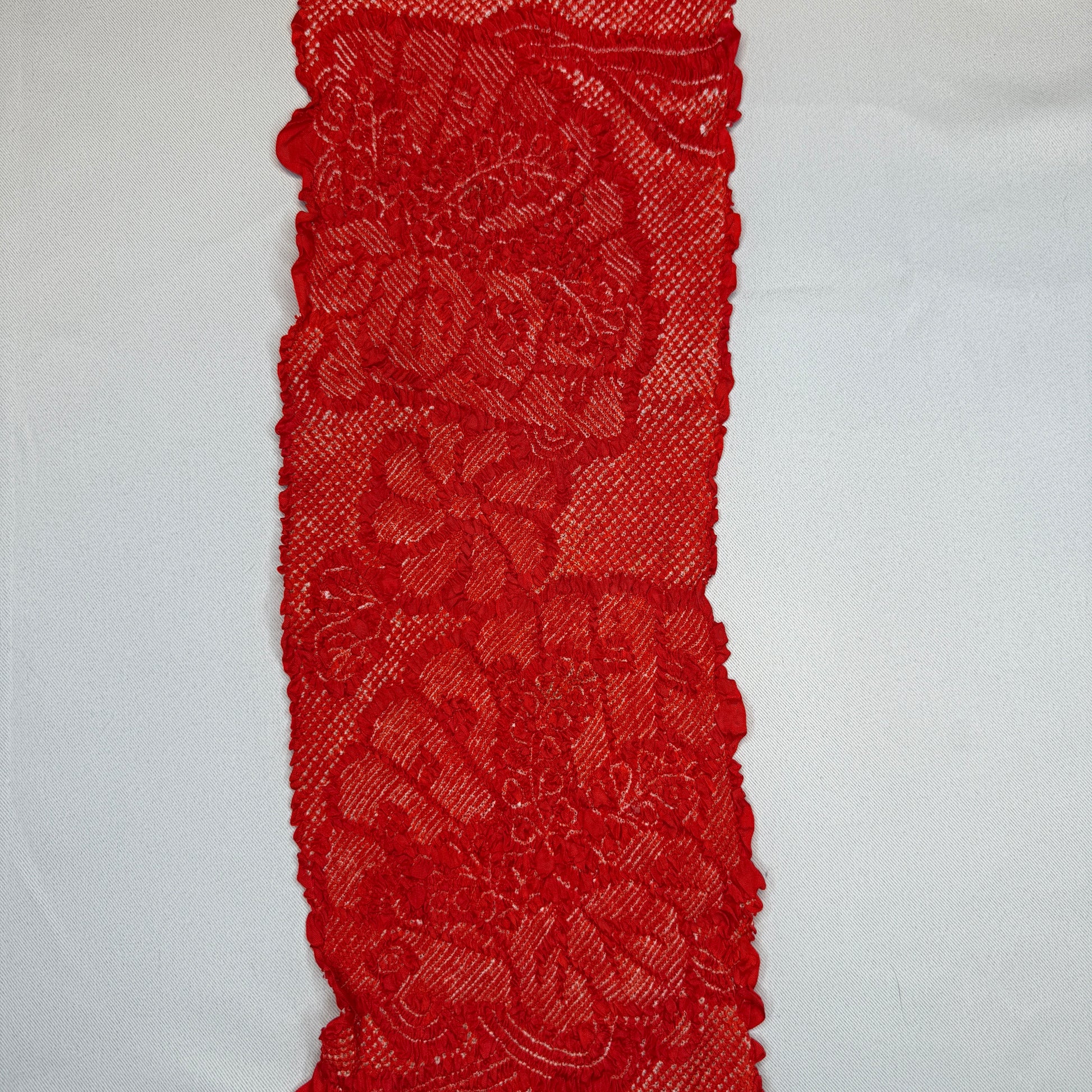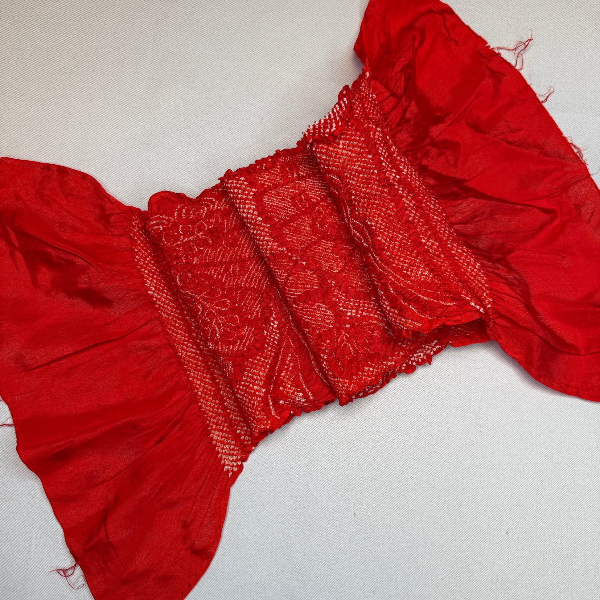 Striking as a festival drumbeat, this obiage and obijime set commands attention in vivid red and crisp white. The obiage features richly textured shibori floral motifs across the silk. The saturated red is both joyful and formal, while the twisted round obijime in red woven with gold threads adds refined brilliance and structure. The gold accents catch the light beautifully, making this pairing ideal for celebratory occasions.