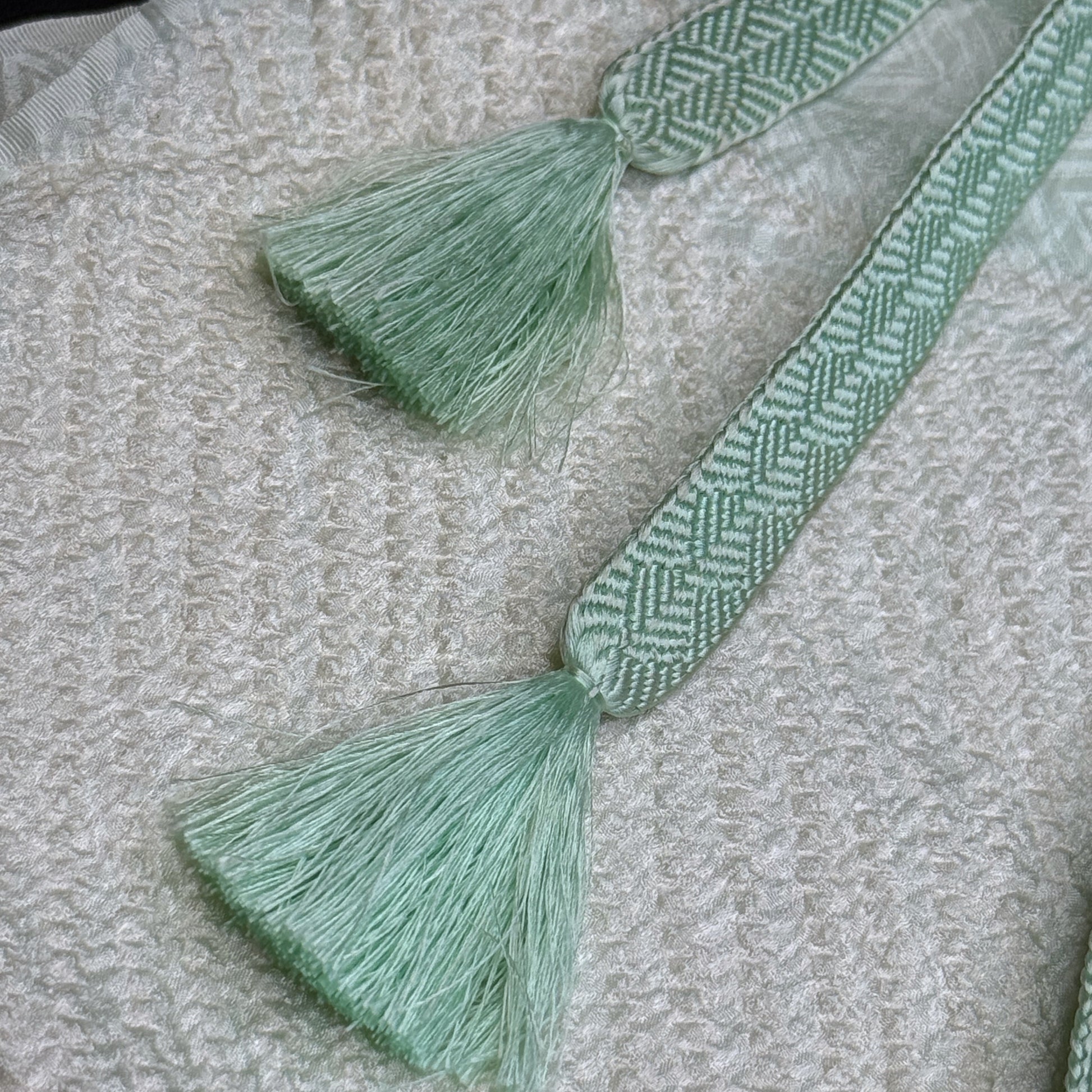 This listing is for two beautifully coordinated obi accessories: an obiage (a scarf-like sash that peeks out from the top of a formally tied obi) and an obijime (a woven, decorative cord that wraps around the center of the obi, adding the final touch).