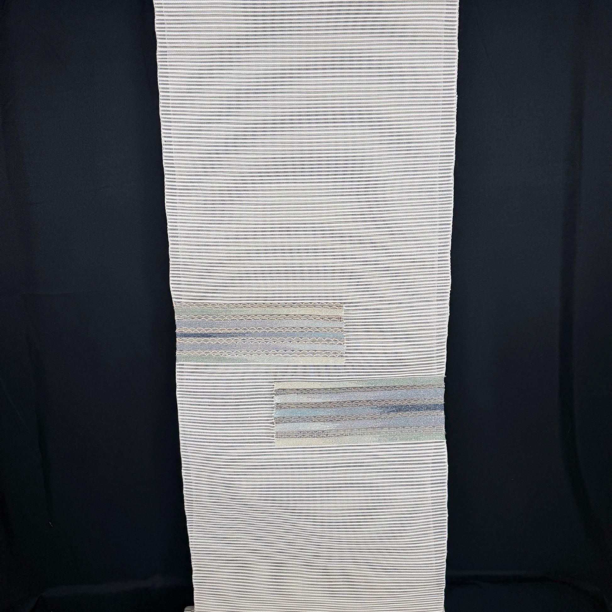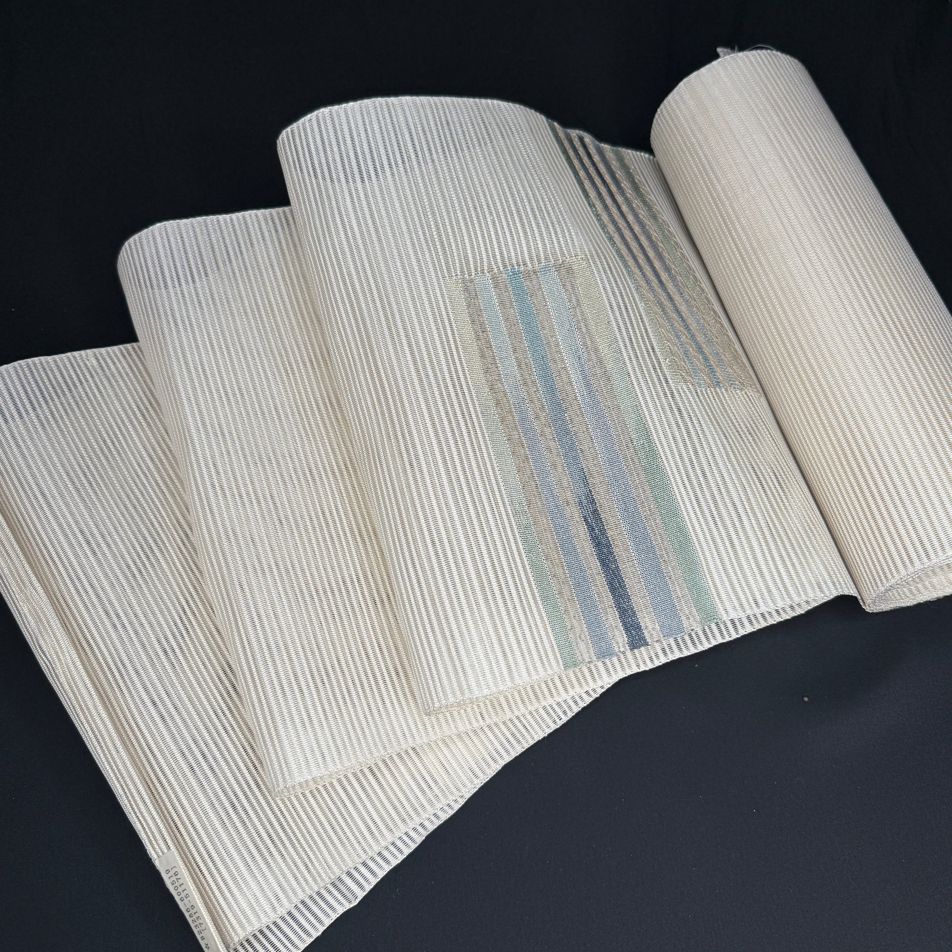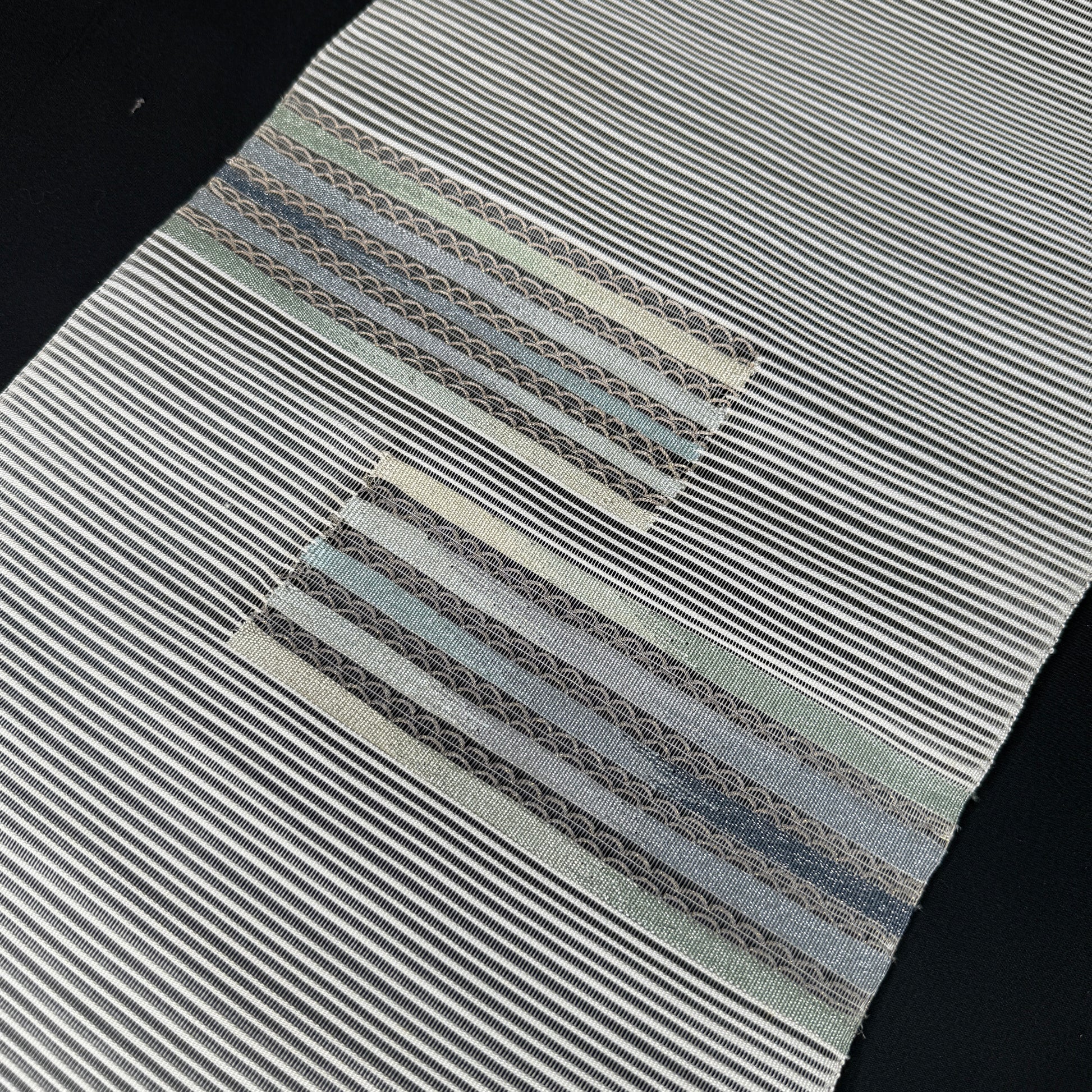 Effortlessly light and quietly refined, this vintage nagoya obi bolt showcases a beautifully balanced open-weave construction that feels cool, breathable, and distinctly summery. Subtle vertical striped panels float across the airy background, layered in soft tones of seafoam, pale sage, misty blue, sand, and charcoal, with delicate wave-like detailing woven into select bands. Restrained palette and rhythmic patterning!