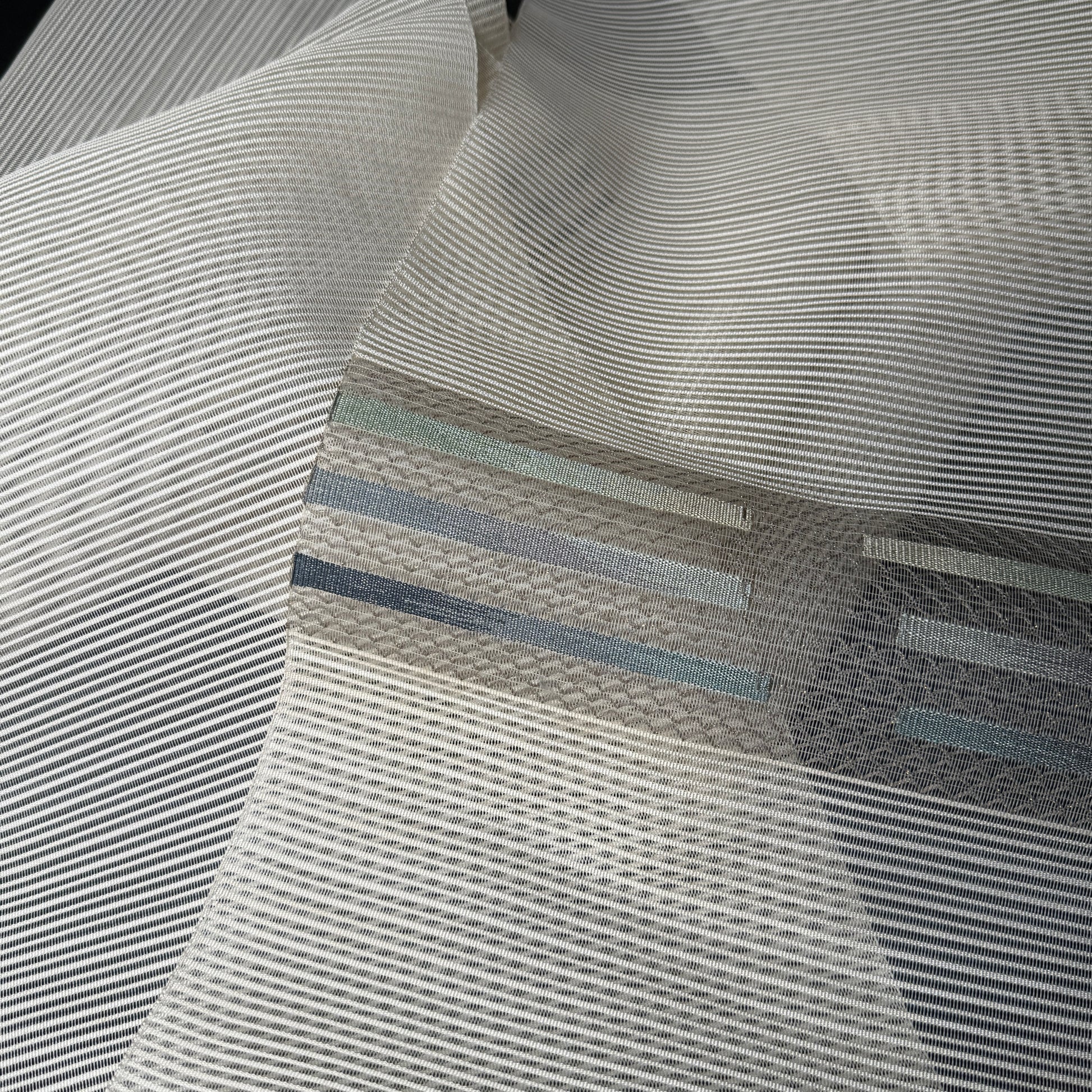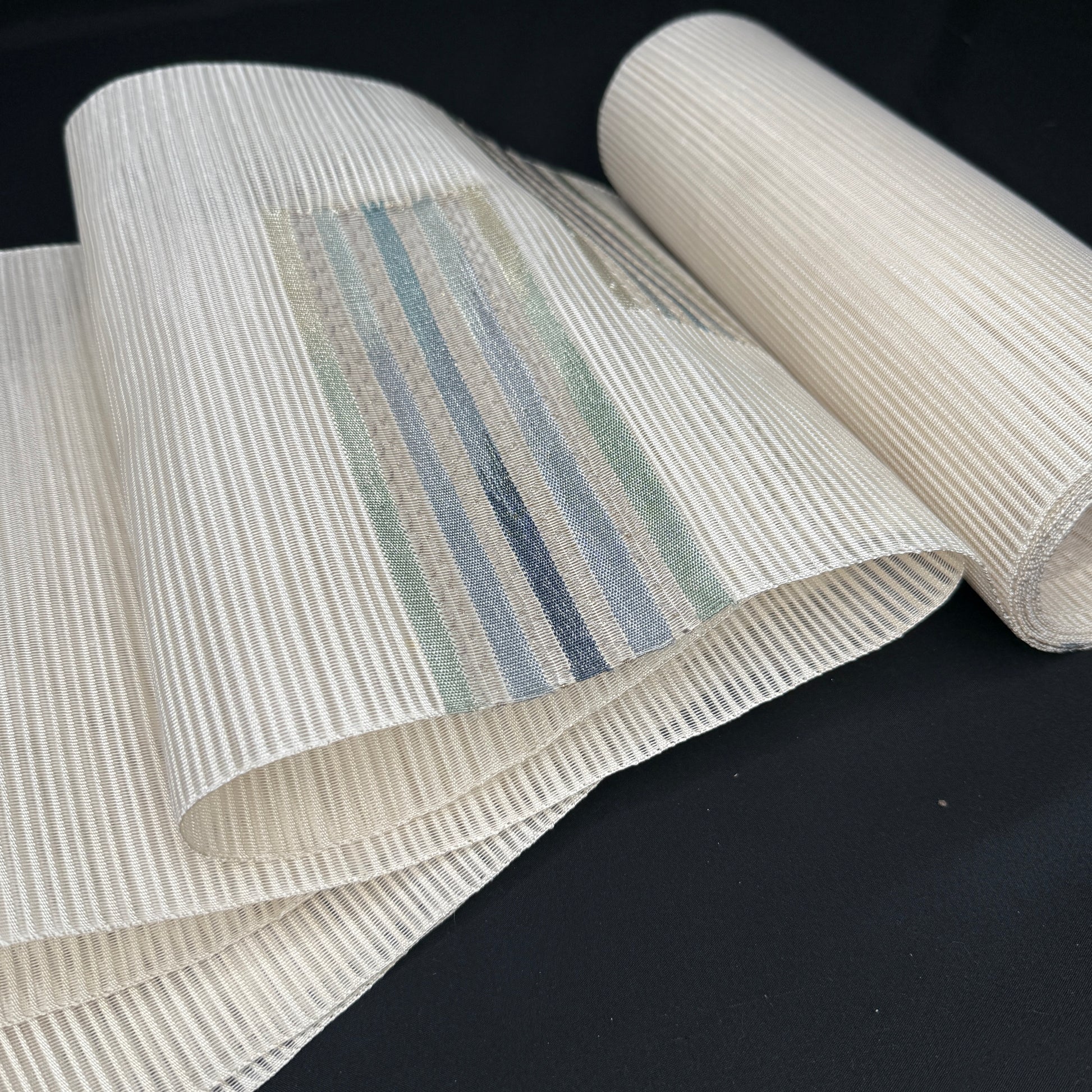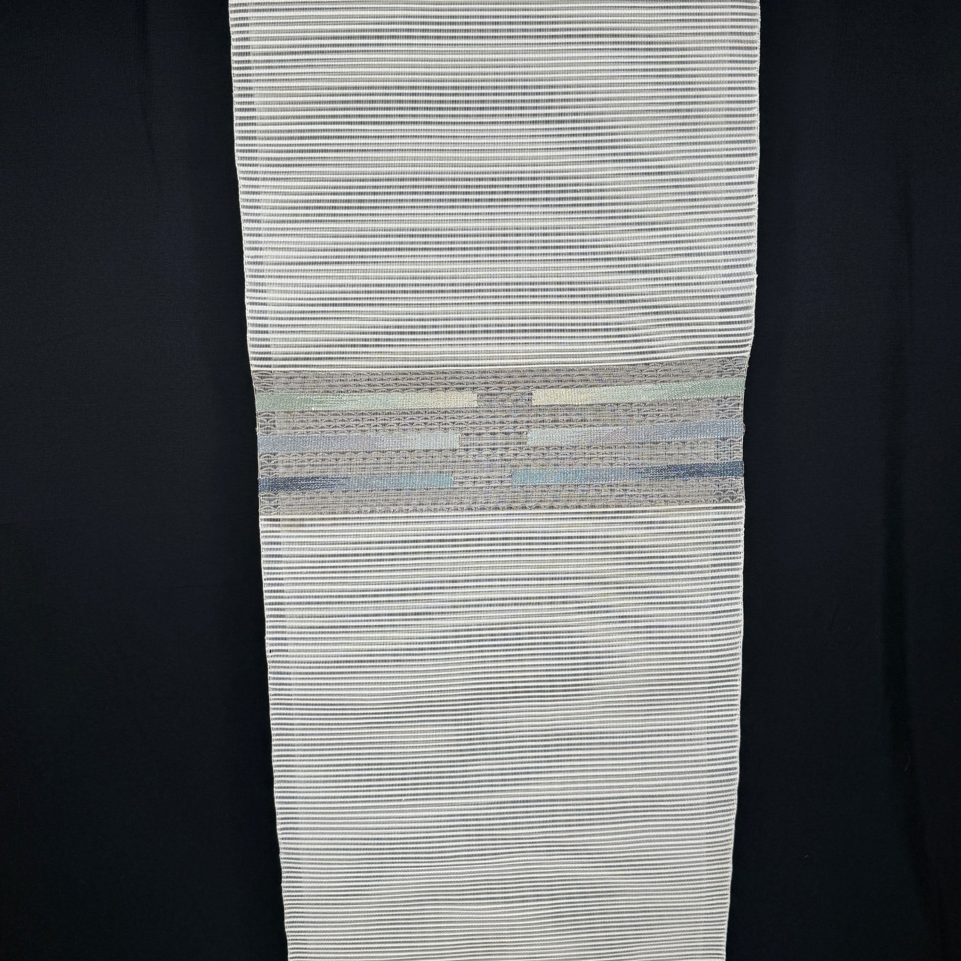 Effortlessly light and quietly refined, this vintage nagoya obi bolt showcases a beautifully balanced open-weave construction that feels cool, breathable, and distinctly summery. Subtle vertical striped panels float across the airy background, layered in soft tones of seafoam, pale sage, misty blue, sand, and charcoal, with delicate wave-like detailing woven into select bands. Restrained palette and rhythmic patterning!