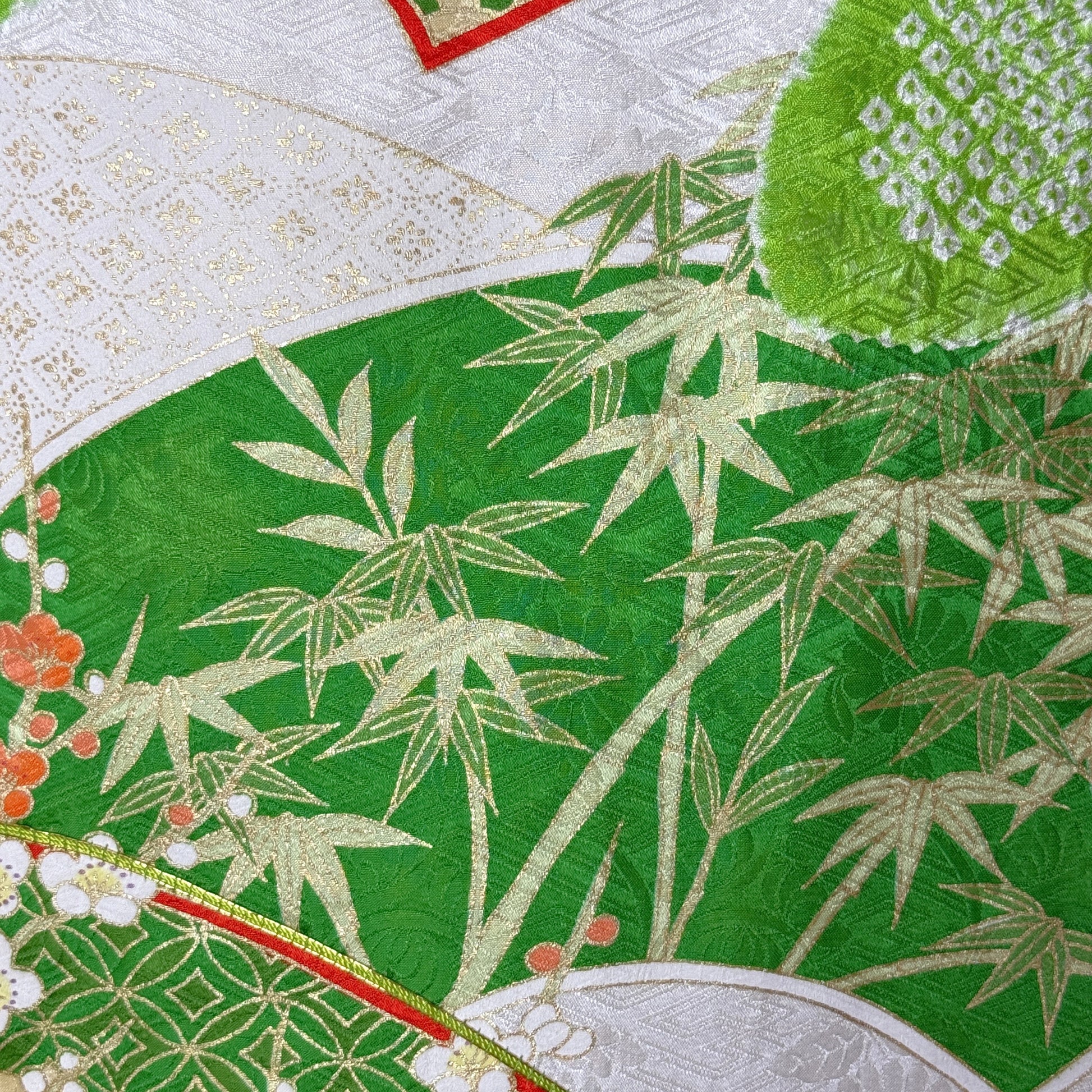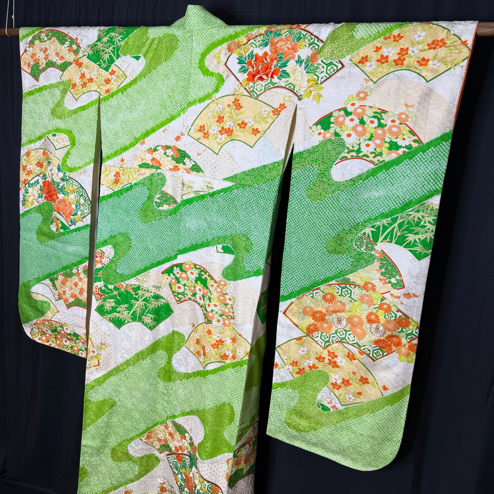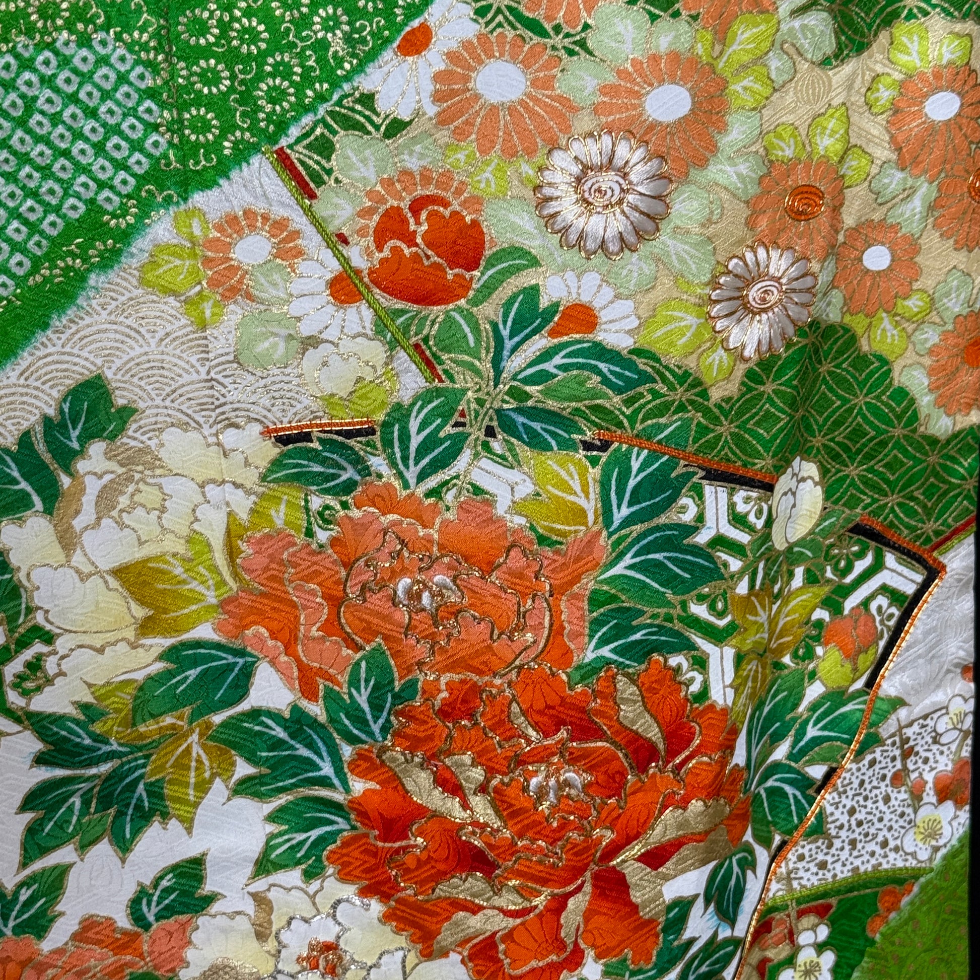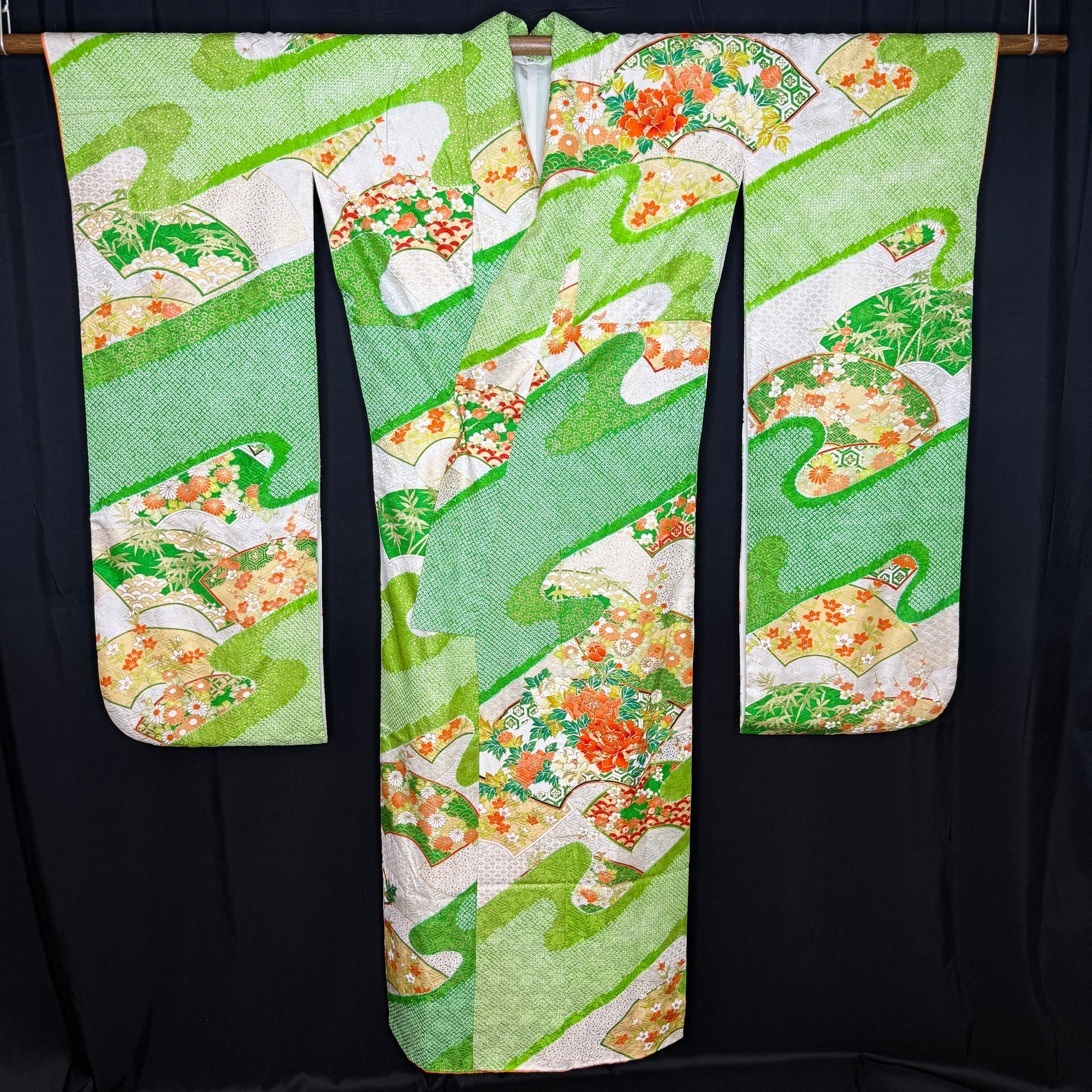 This kimono is a gorgeous range of greens - energetic, freshness, and youth! Wide bands of shibori-filled clouds seem to flow diagonally across the field, with flower-filled fan (sensu) shapes floating on and around those clouds. So many auspicious motifs collaged together: bamboo, peonies, seigaiha, komon crests, and more.