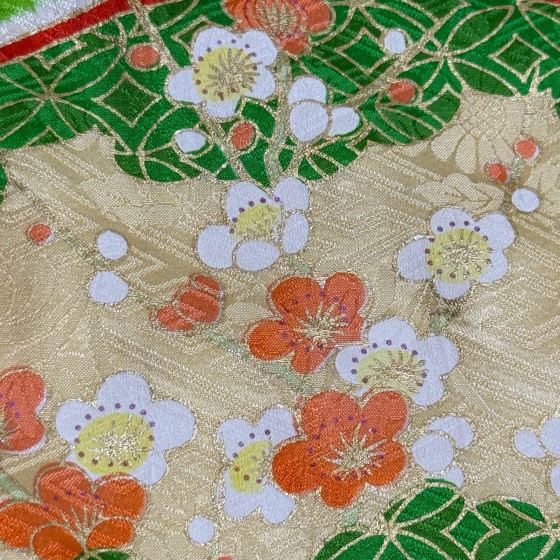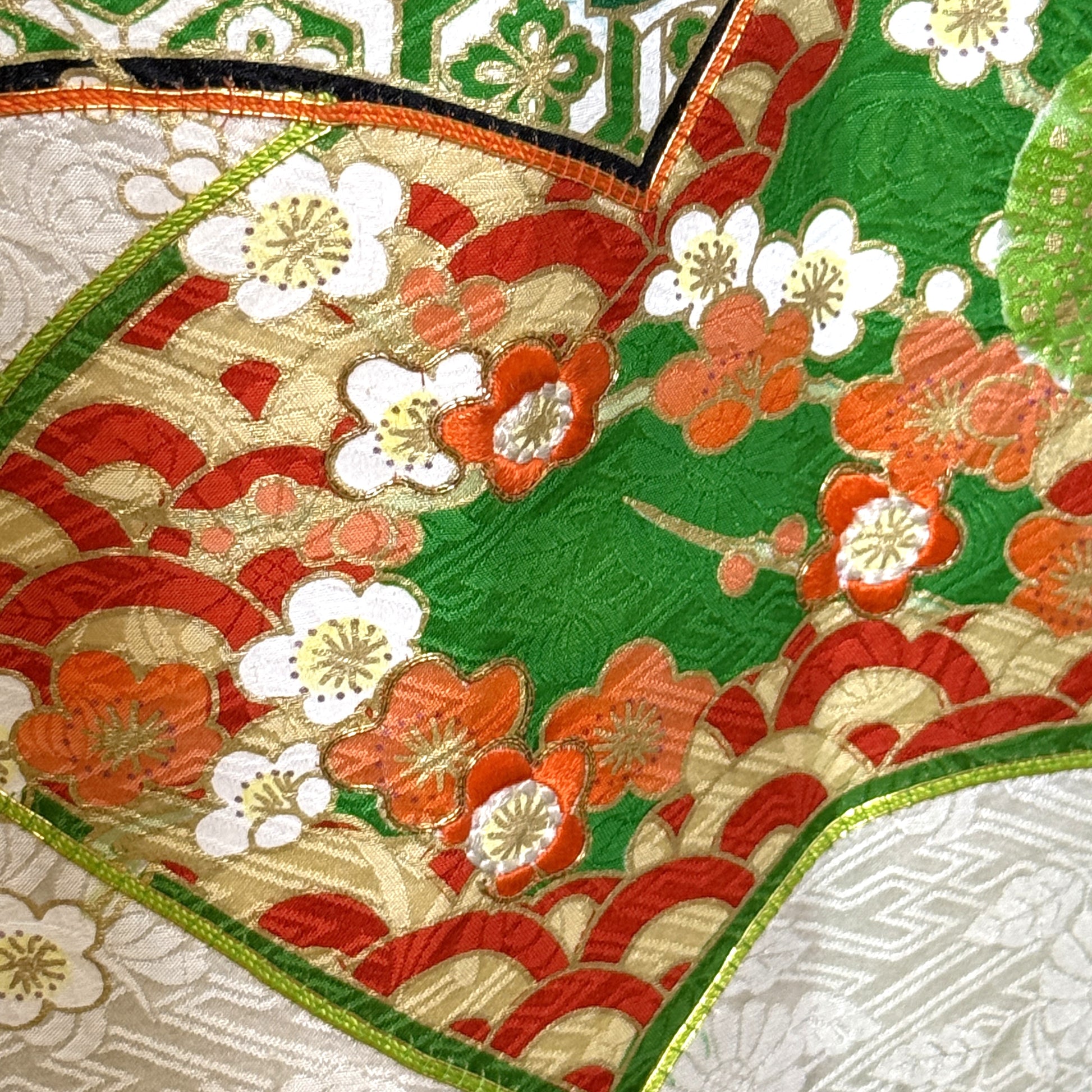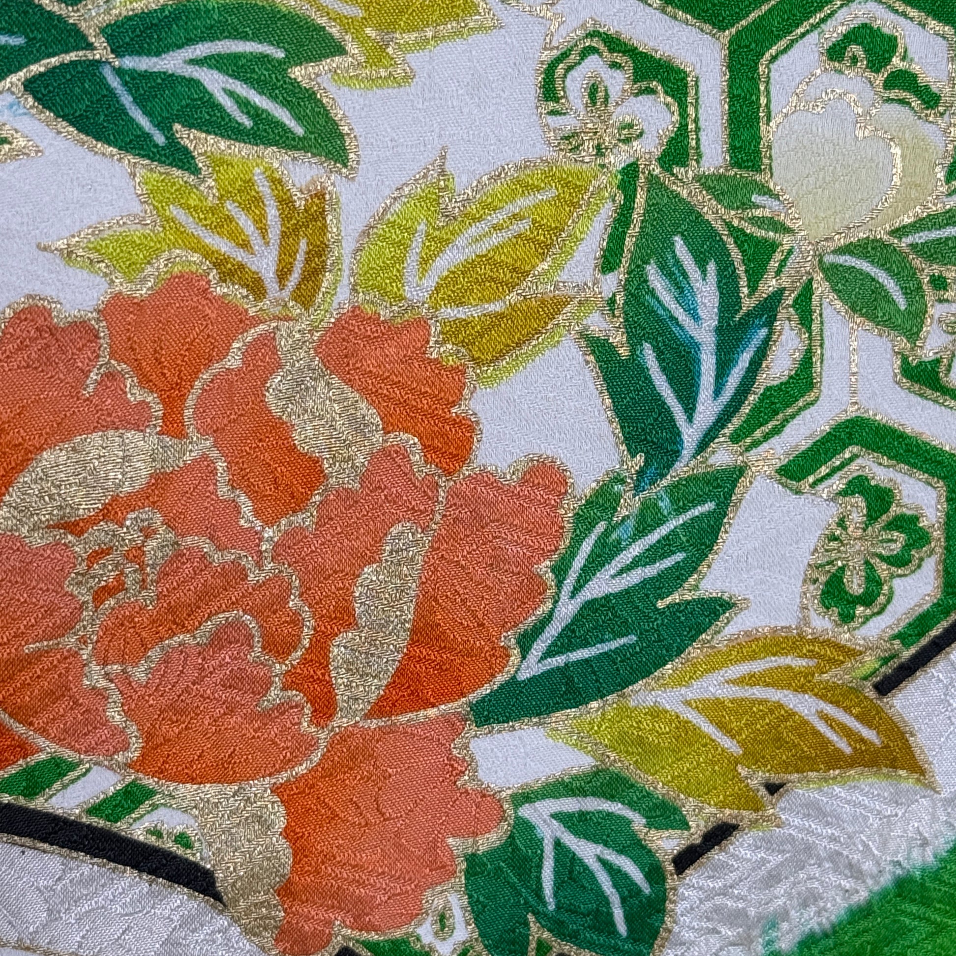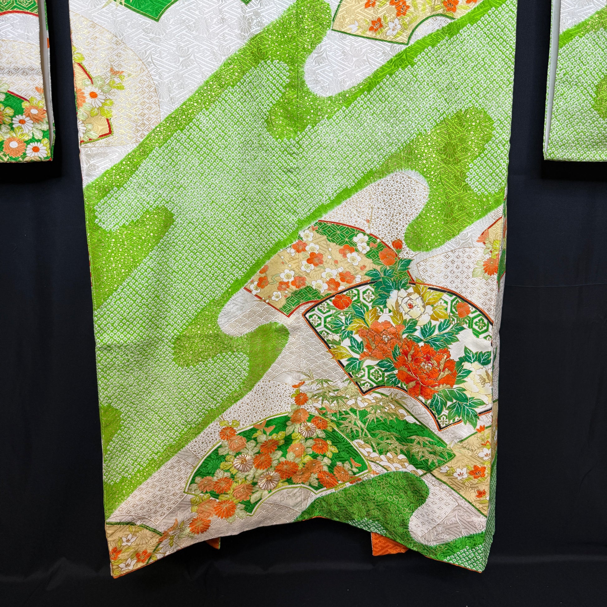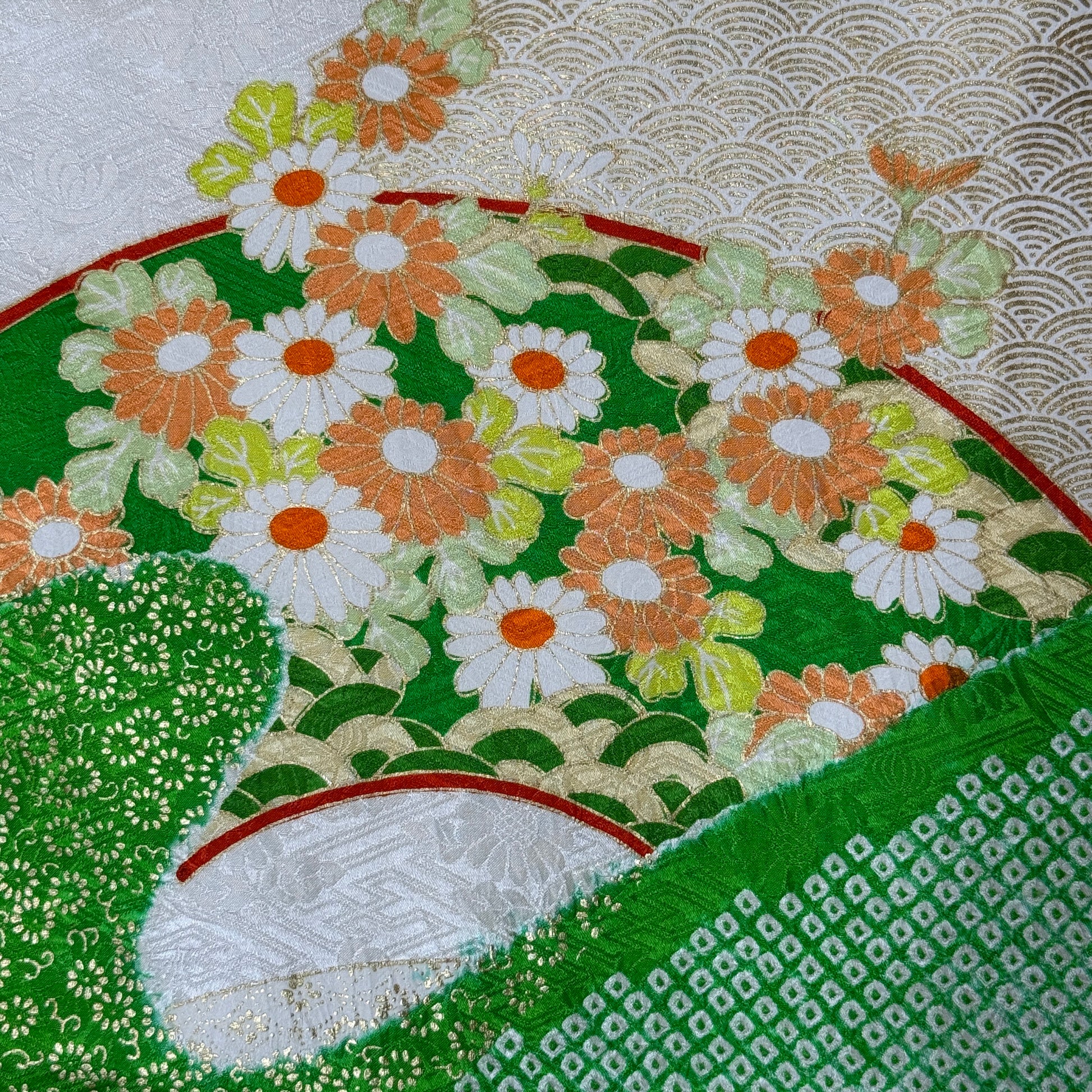 This kimono is a gorgeous range of greens - energetic, freshness, and youth! Wide bands of shibori-filled clouds seem to flow diagonally across the field, with flower-filled fan (sensu) shapes floating on and around those clouds. So many auspicious motifs collaged together: bamboo, peonies, seigaiha, komon crests, and more.