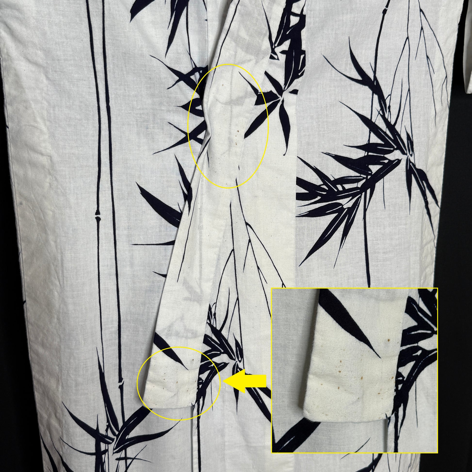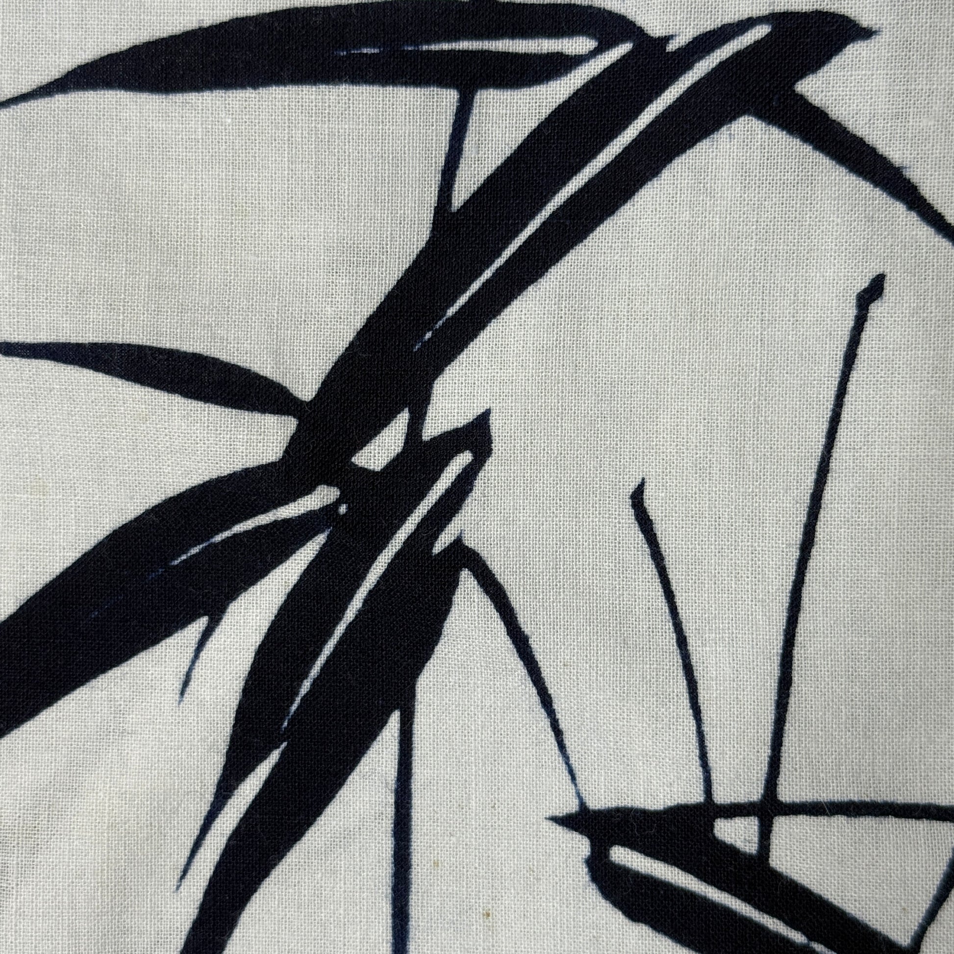 This vintage cotton yukata feels like stepping into a bamboo grove, where slender stalks rise in soft vertical lines and inky leaves flutter across the fabric like passing shadows. The design is crisp and elegant in a classic summer motif.