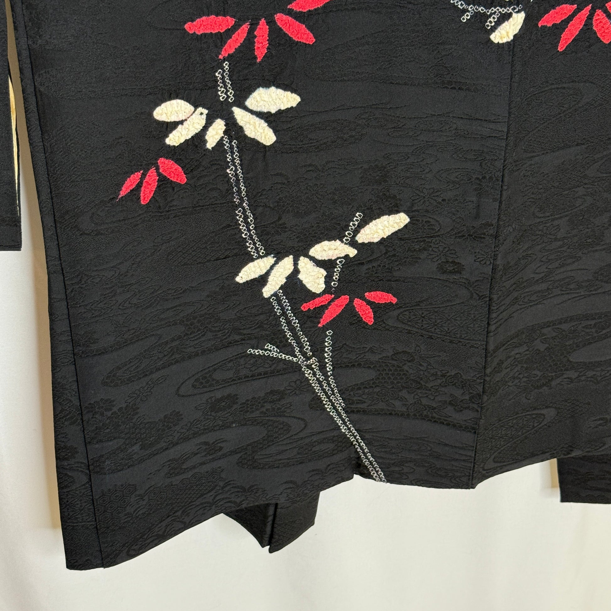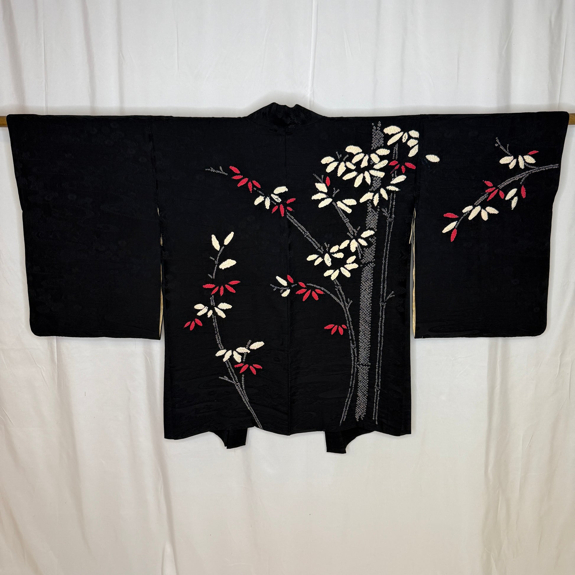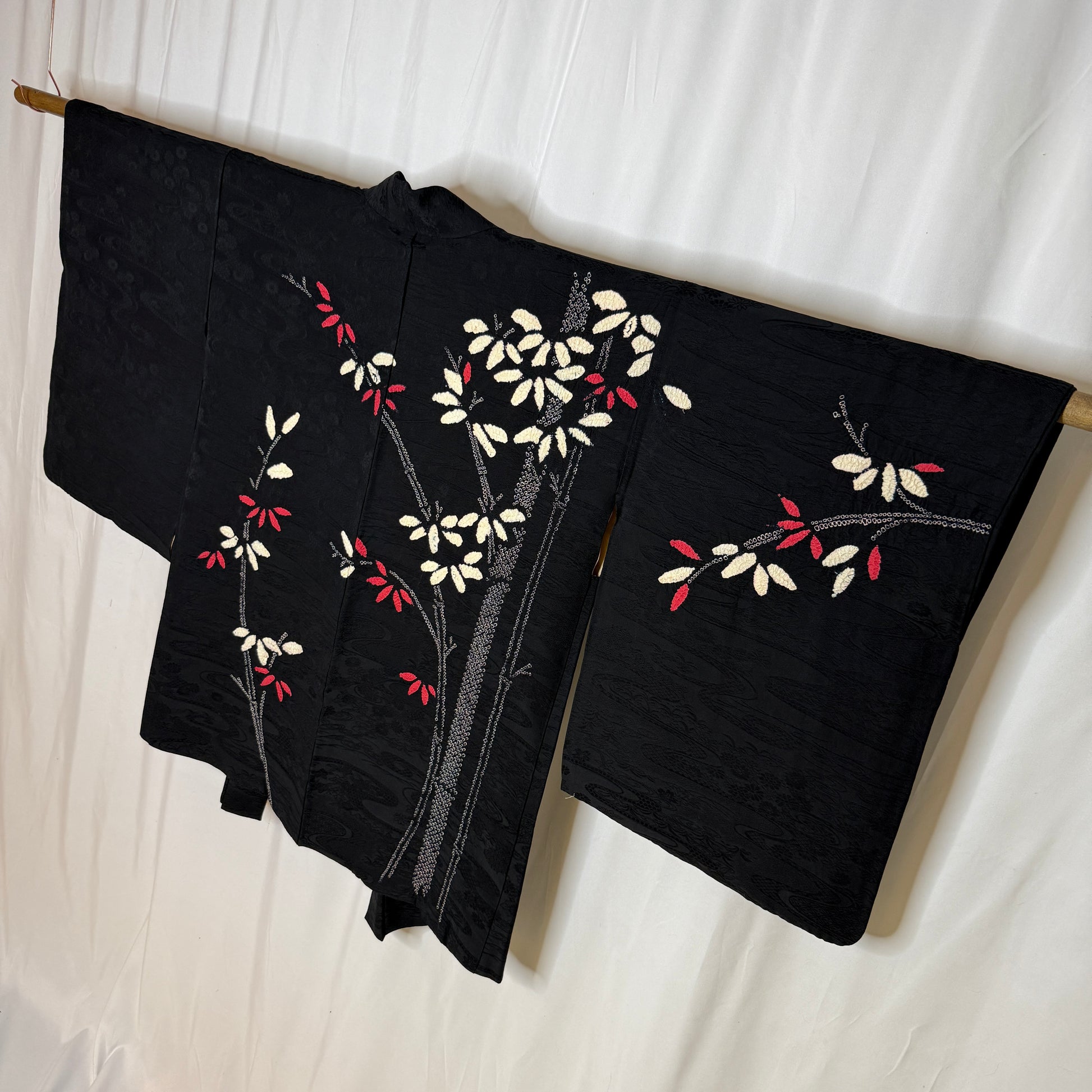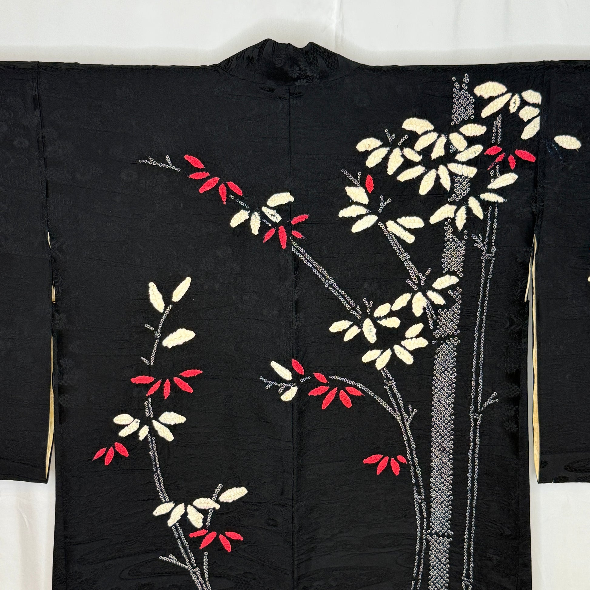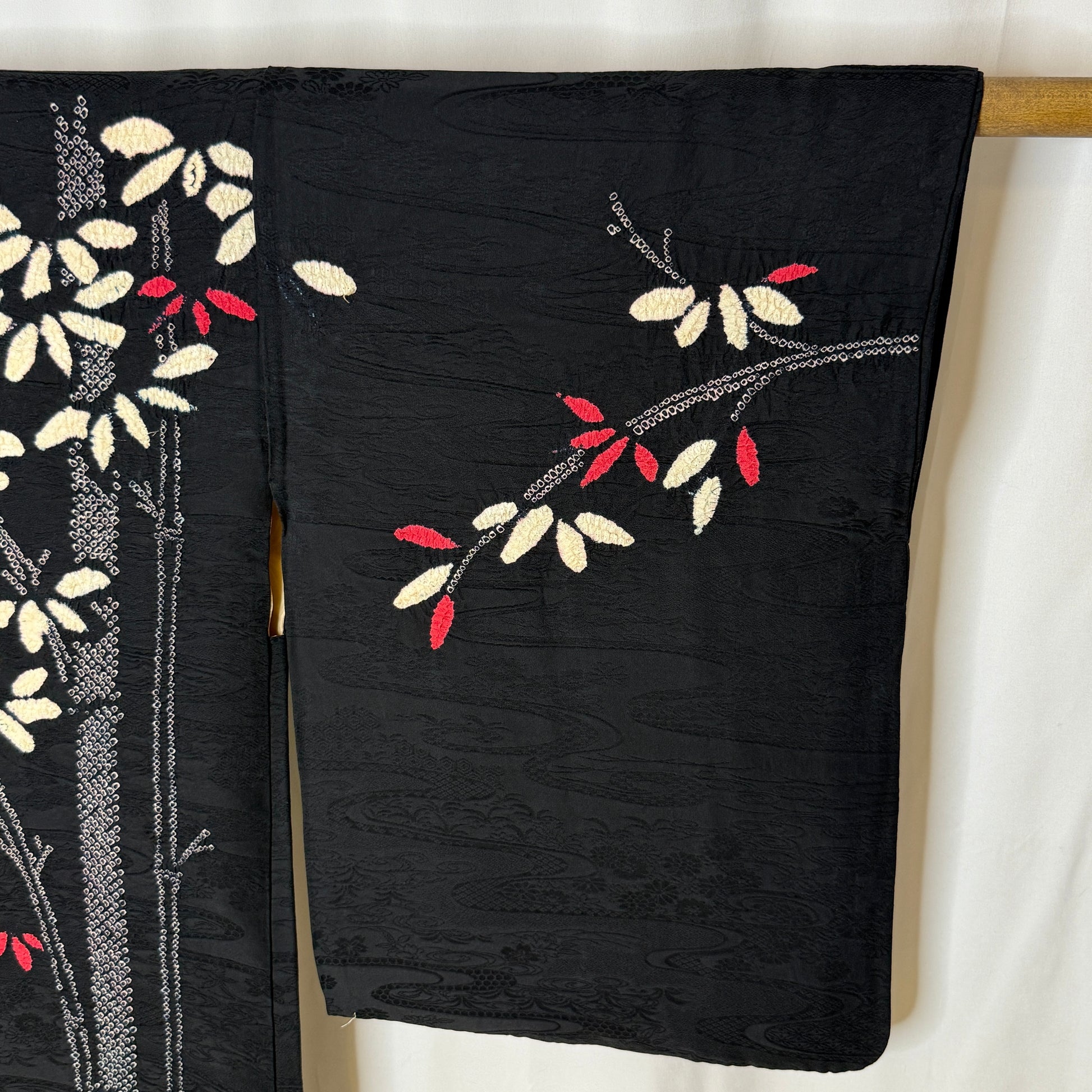 This striking woman's haori jacket features an asymmetrical, balanced design of bamboo created with the shibori tie-dye technique. The careful handwork created textured clusters of leaves in pink and white that contrast beautifully against the black silk background. Look closely to see the subtle tone-on-tone jacquard weave of flowing water and florals. A beautiful piece of wearable textile art!