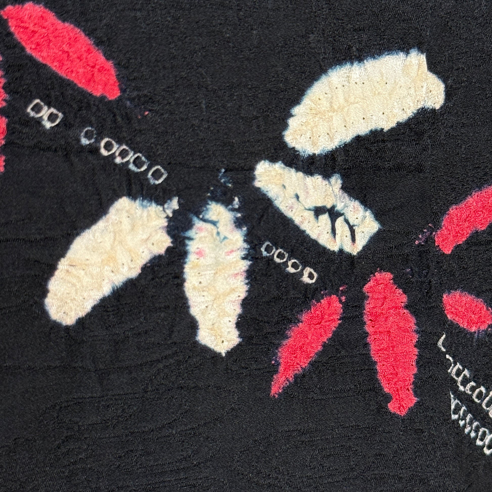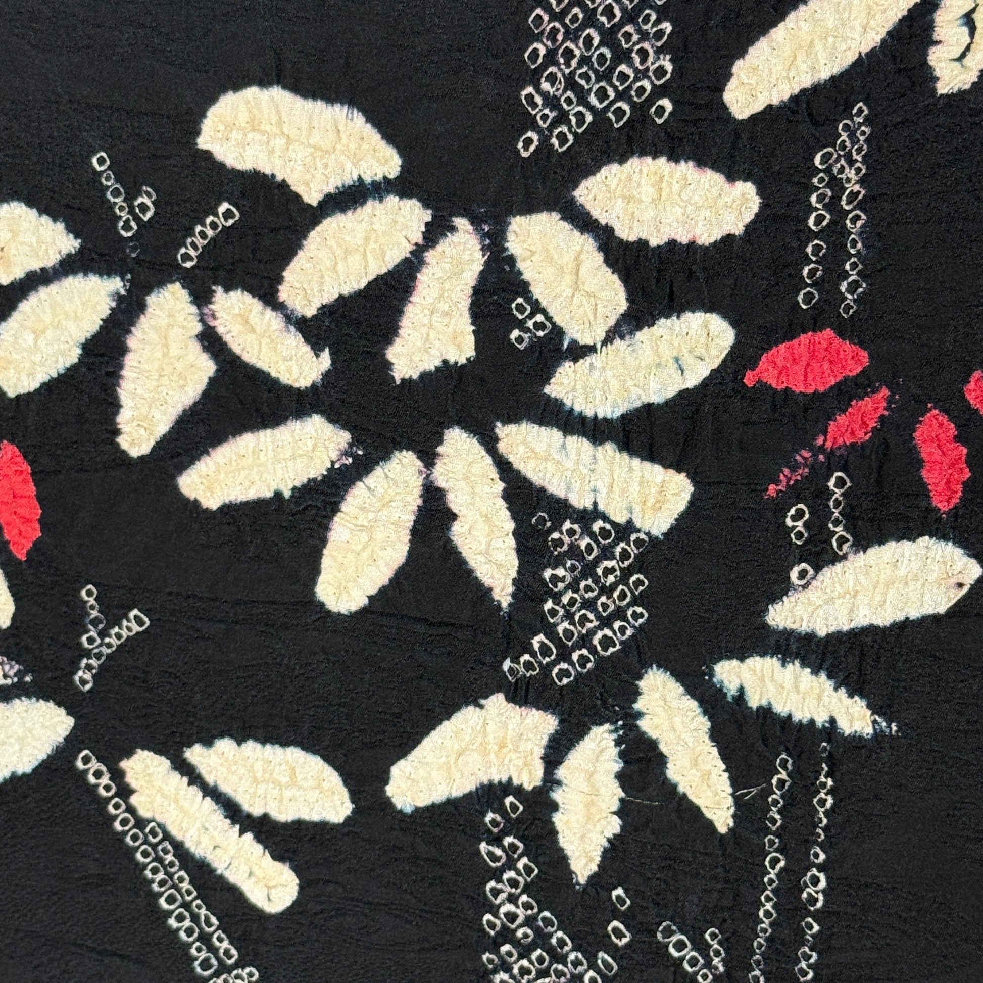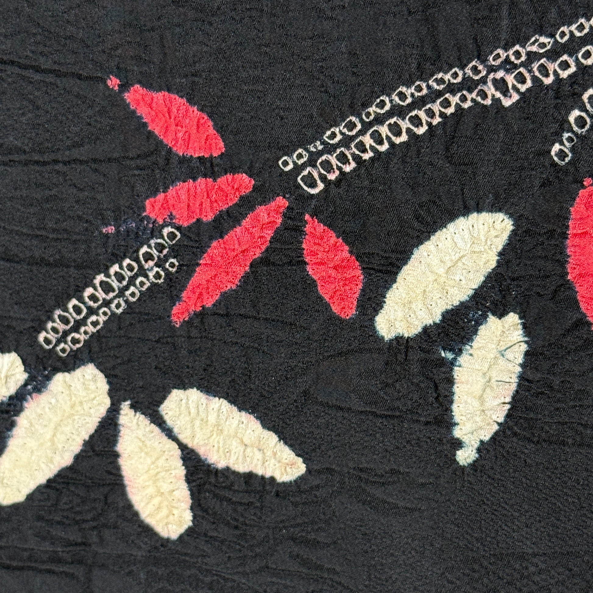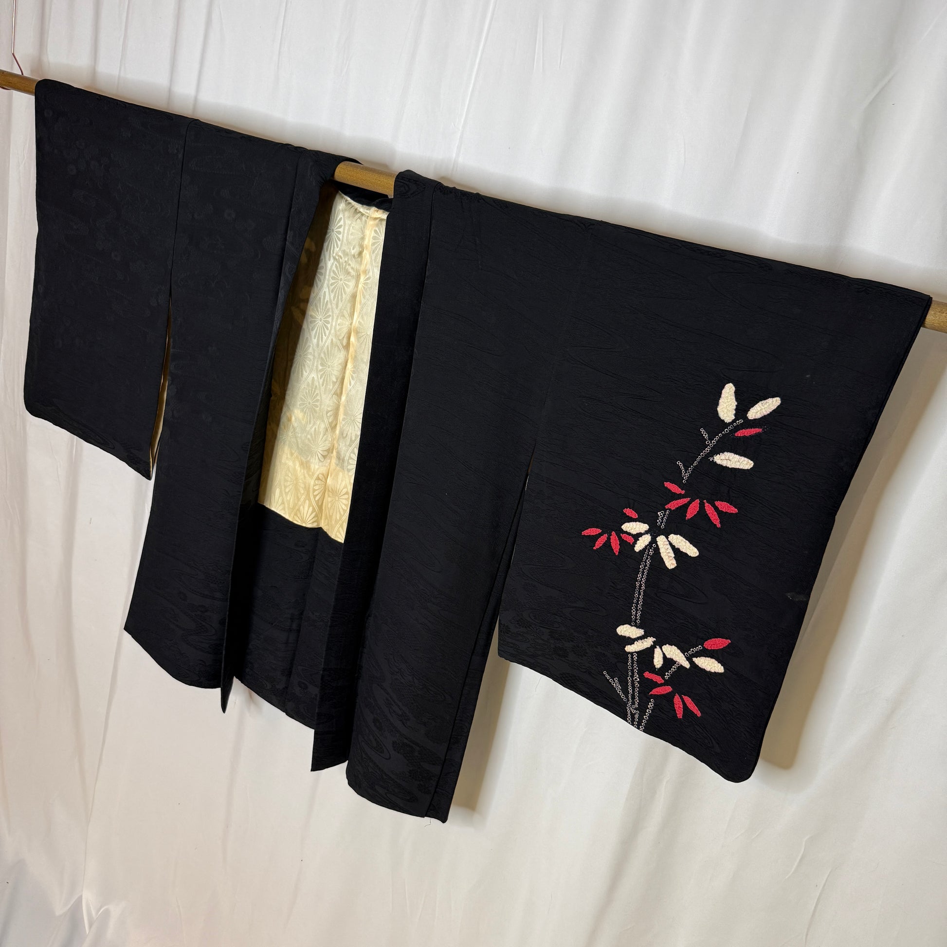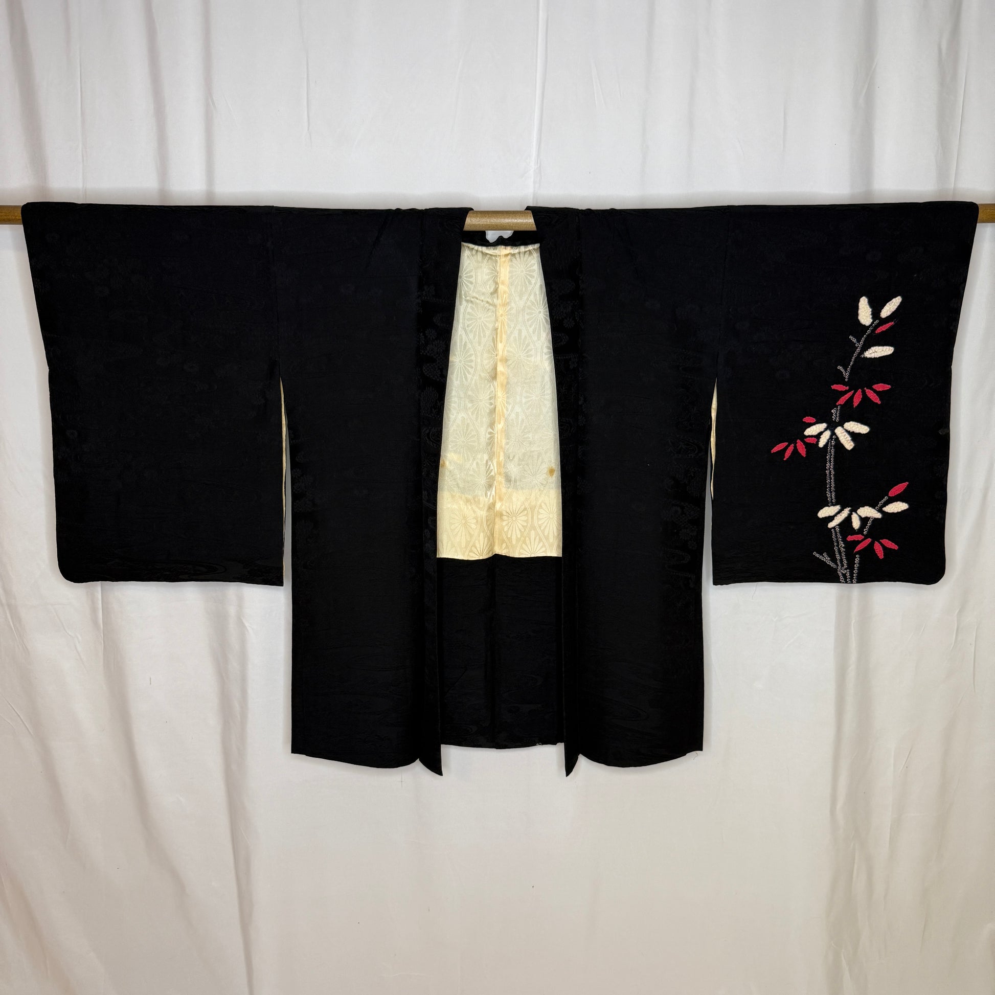 This striking woman's haori jacket features an asymmetrical, balanced design of bamboo created with the shibori tie-dye technique. The careful handwork created textured clusters of leaves in pink and white that contrast beautifully against the black silk background. Look closely to see the subtle tone-on-tone jacquard weave of flowing water and florals. A beautiful piece of wearable textile art!