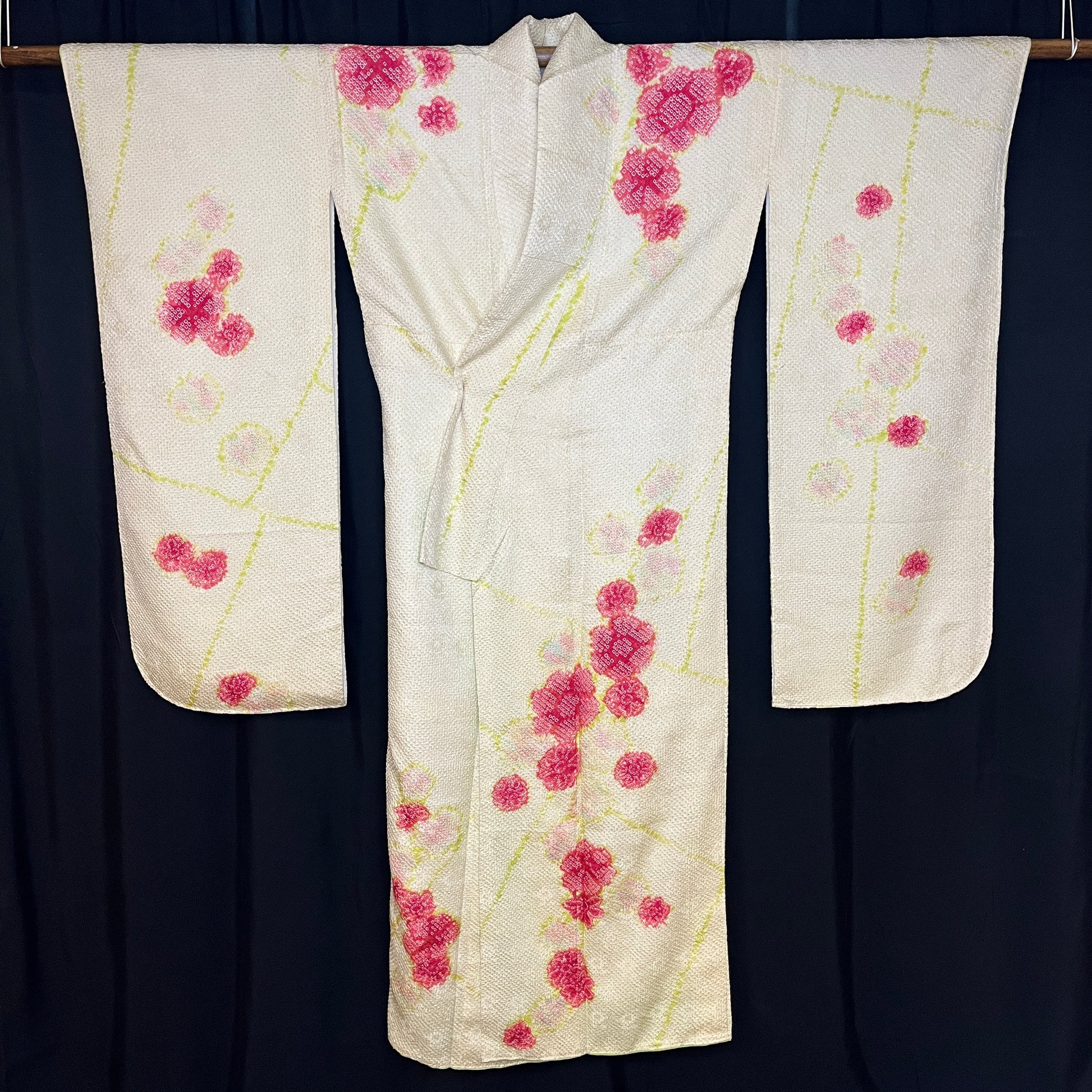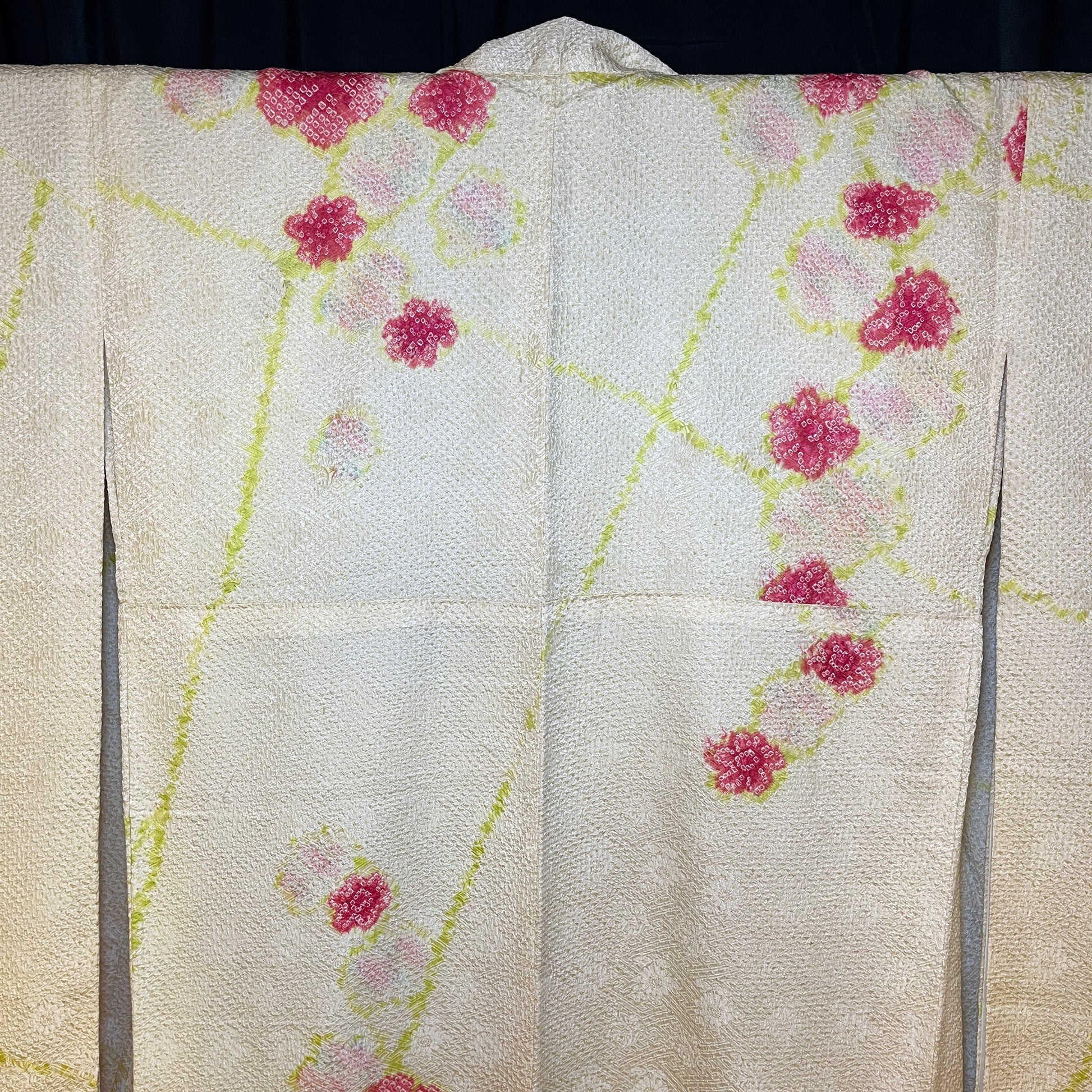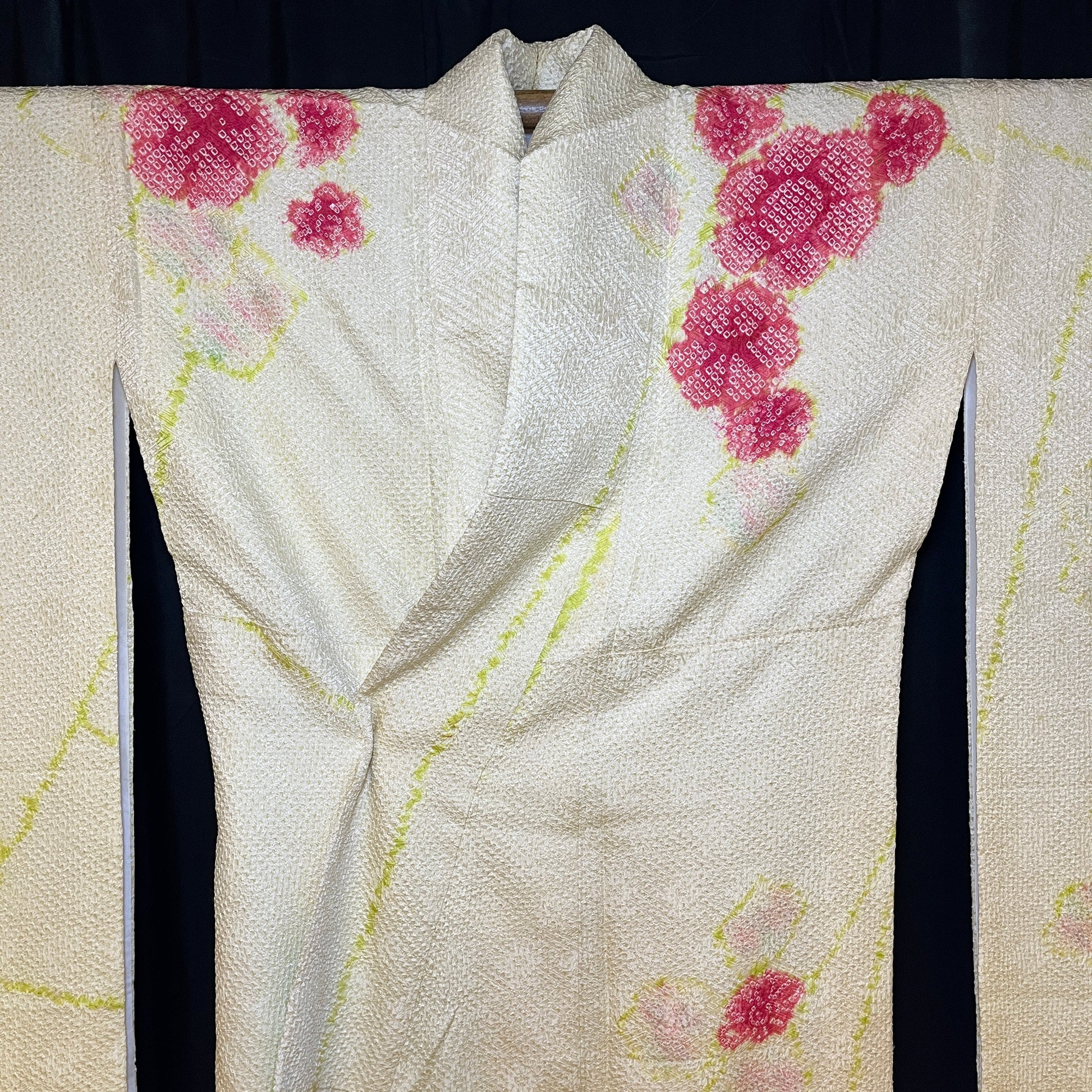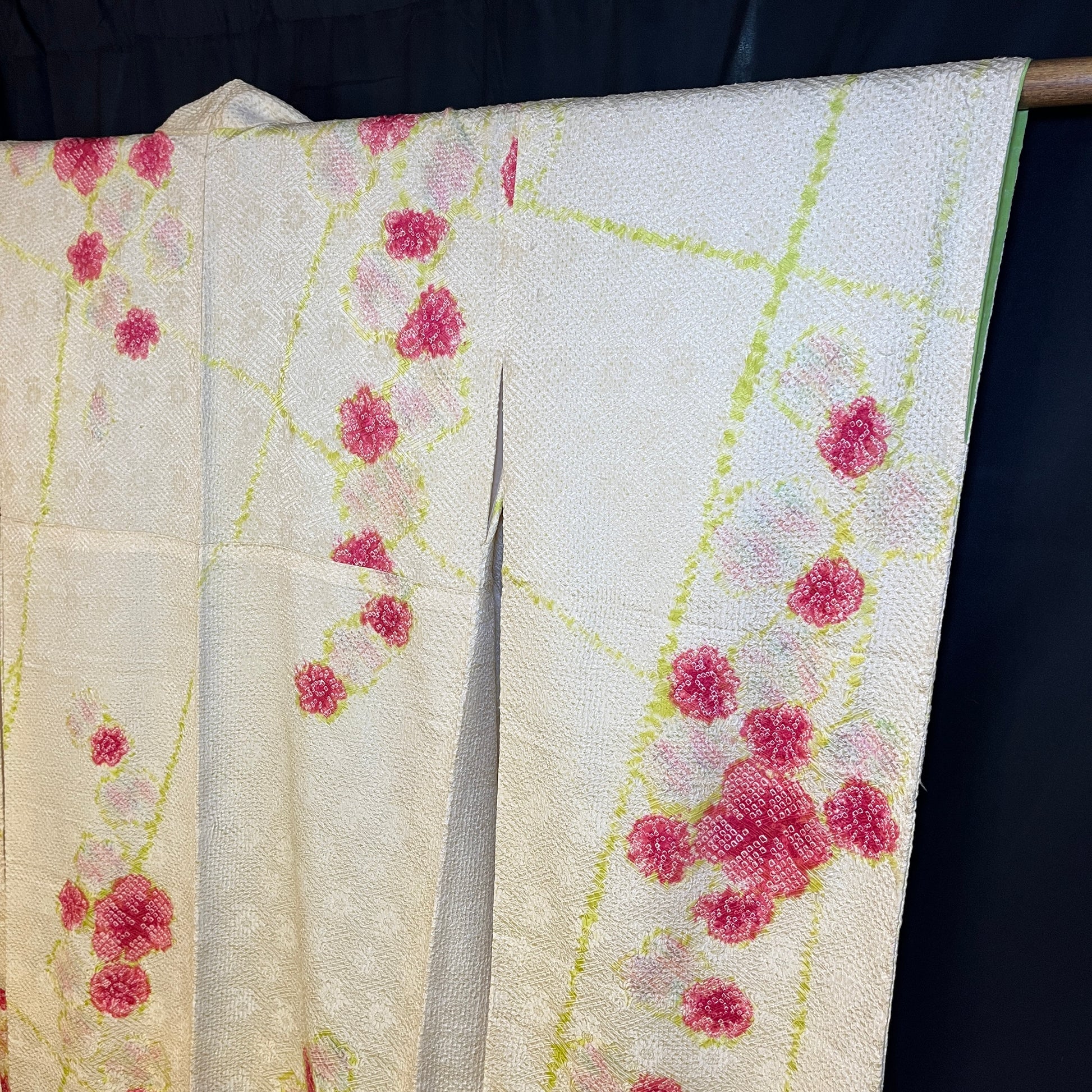 This kimono features cream silk with an overall kanoko shibori dot background with a scattering of bright pink blossoms that are also created with shibori resist. The blossoms seem to cling to the thin lime green lines that criss-cross the kimono. Look closer to see the floral jacquard in the silk itself. Even more subtle is the very light tones of color that fill in the blossom outlines behind the pink blossoms. See video below about the shibori technique.