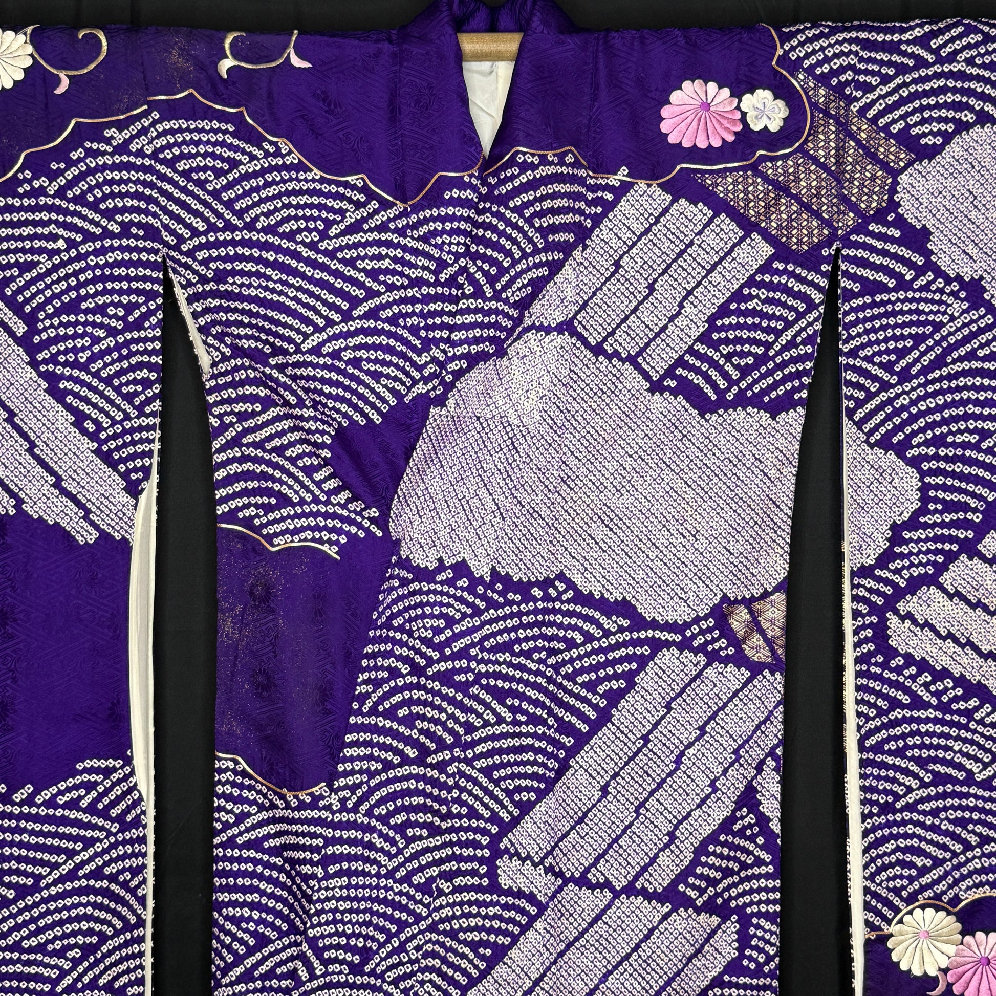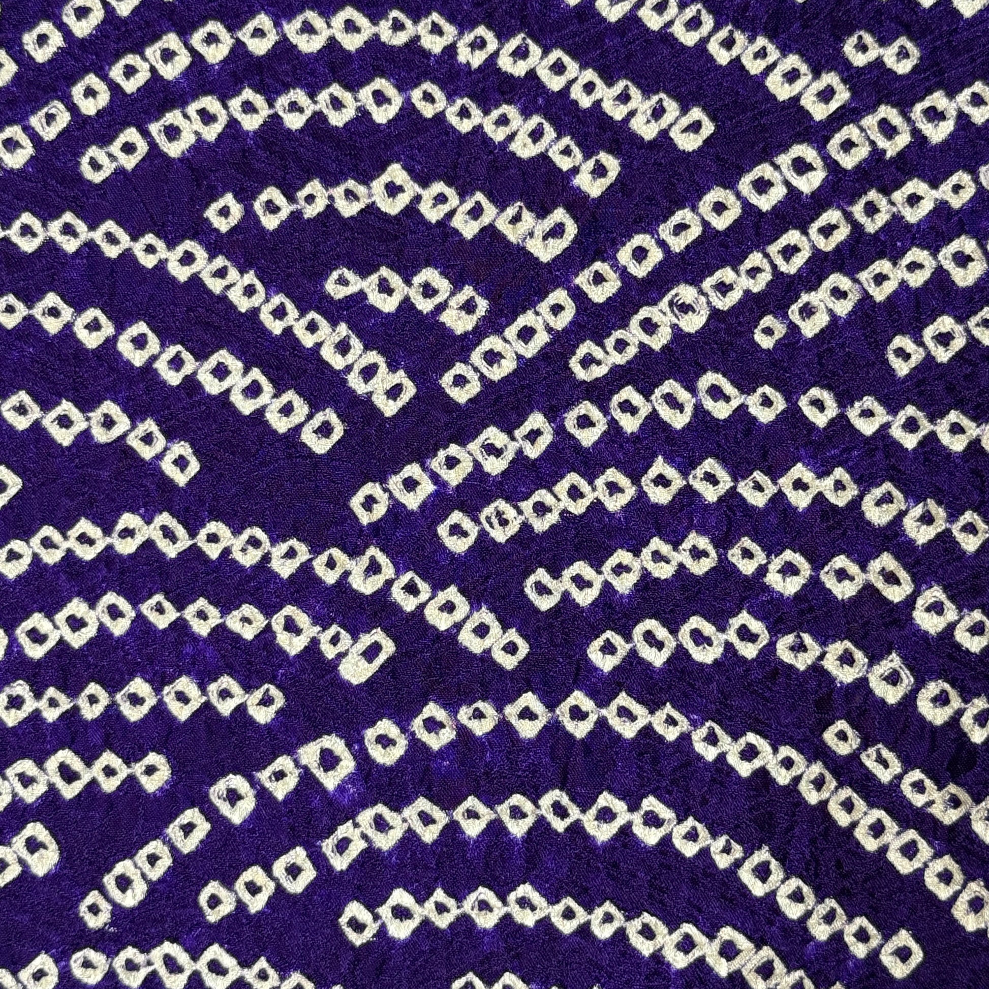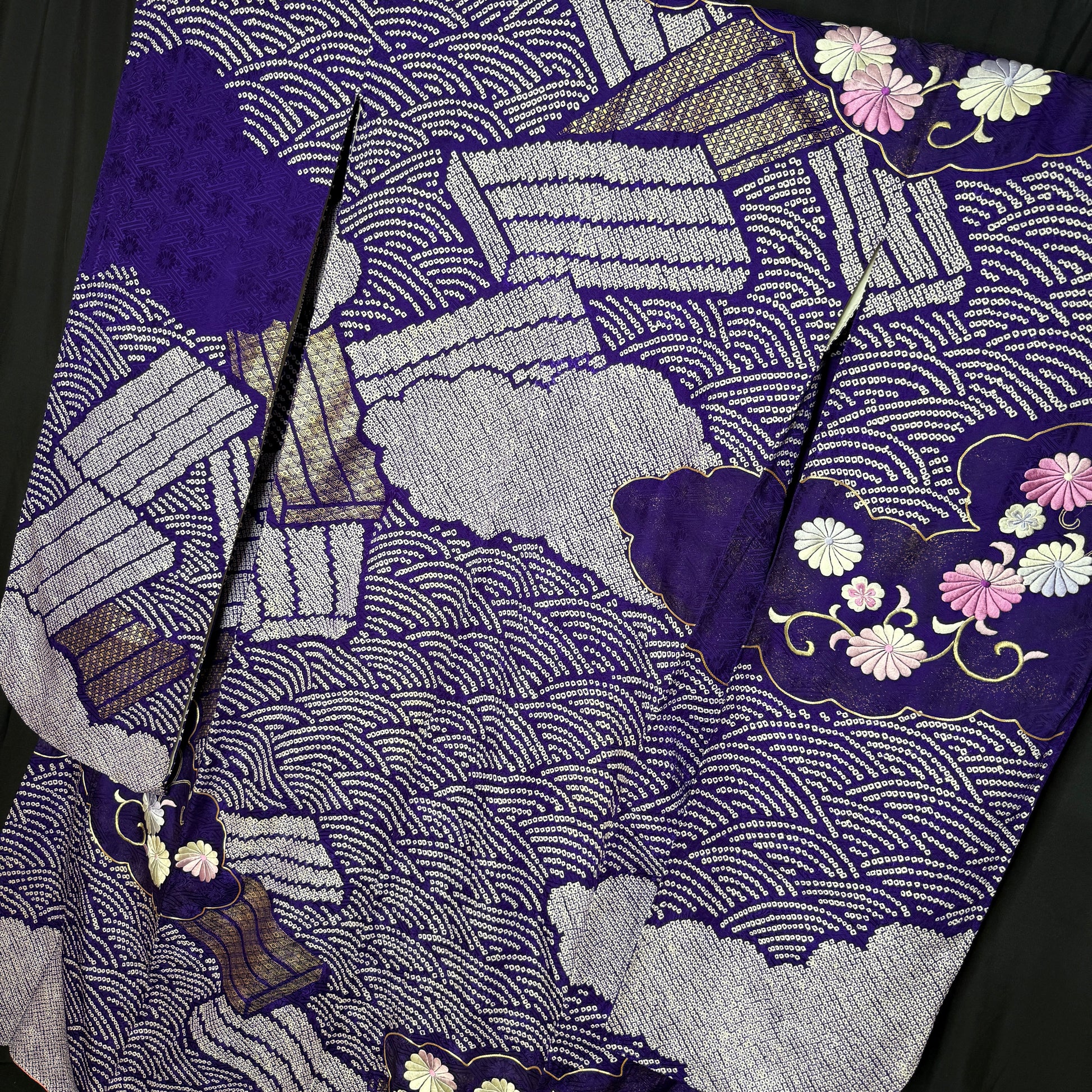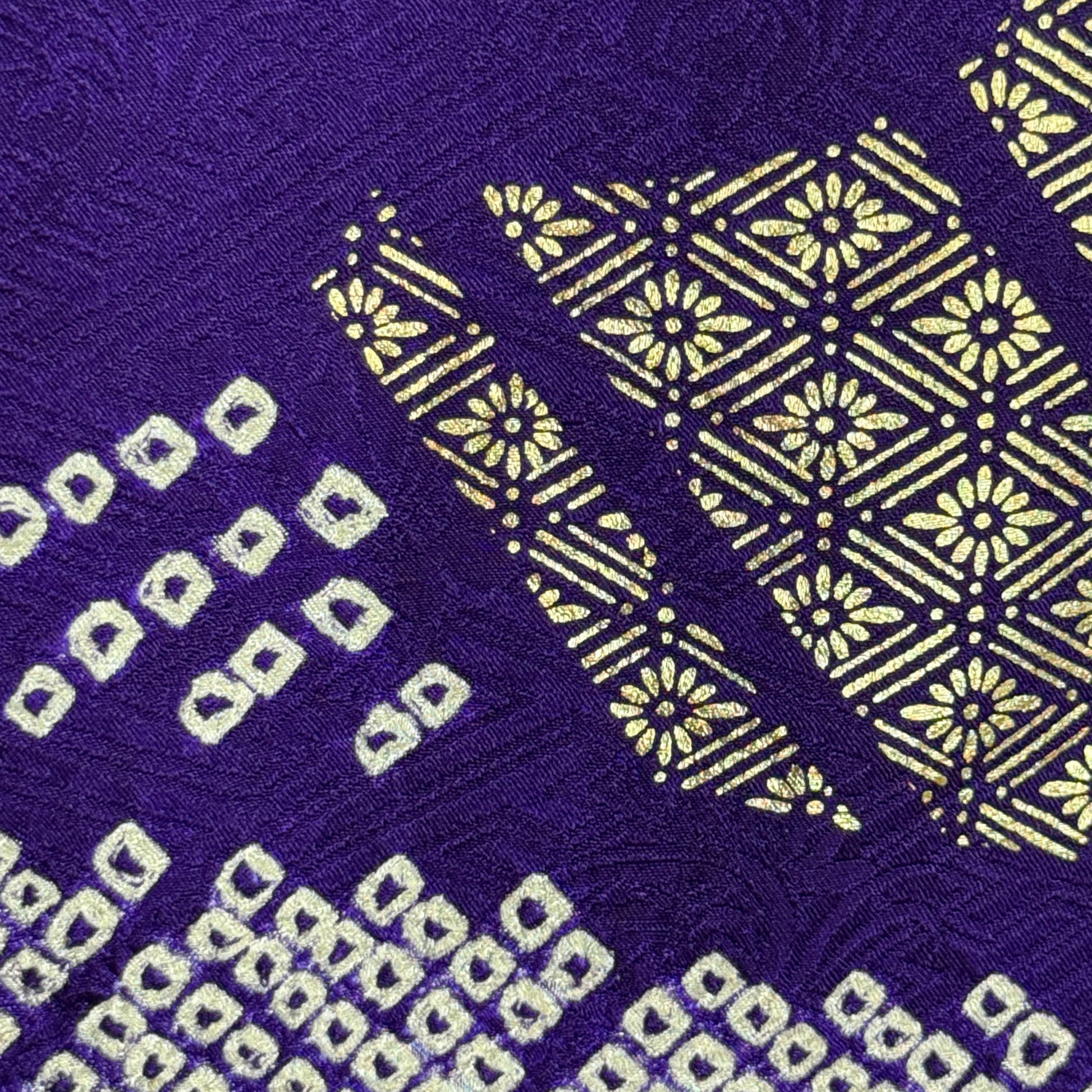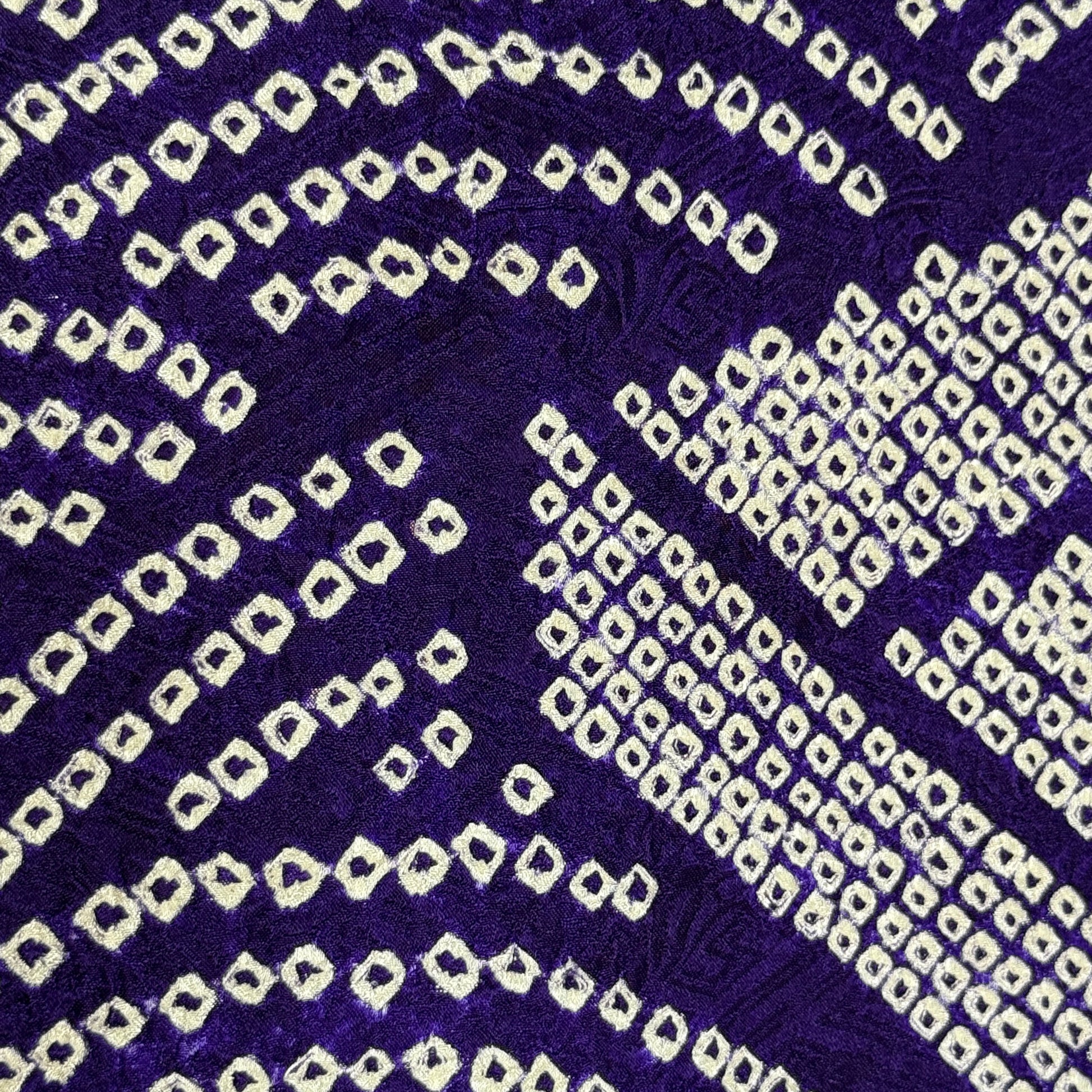 The deep, regal violet silk is the background to layers of several different techniques of shibori patterning that form the tatami, the clouds, and the tiny, tiny dots that create the seigaiha (overlapping coin) pattern that fills in between the other motifs.