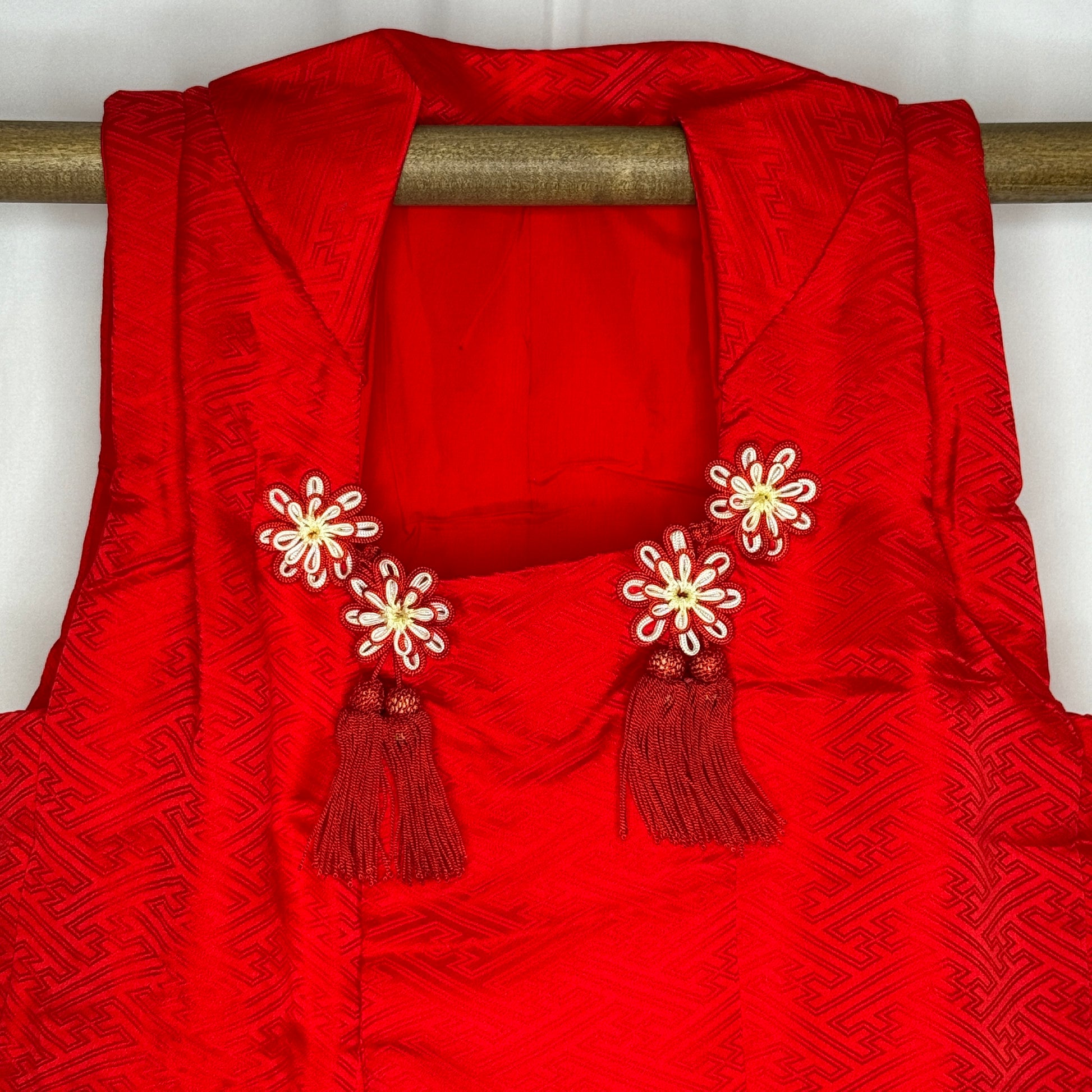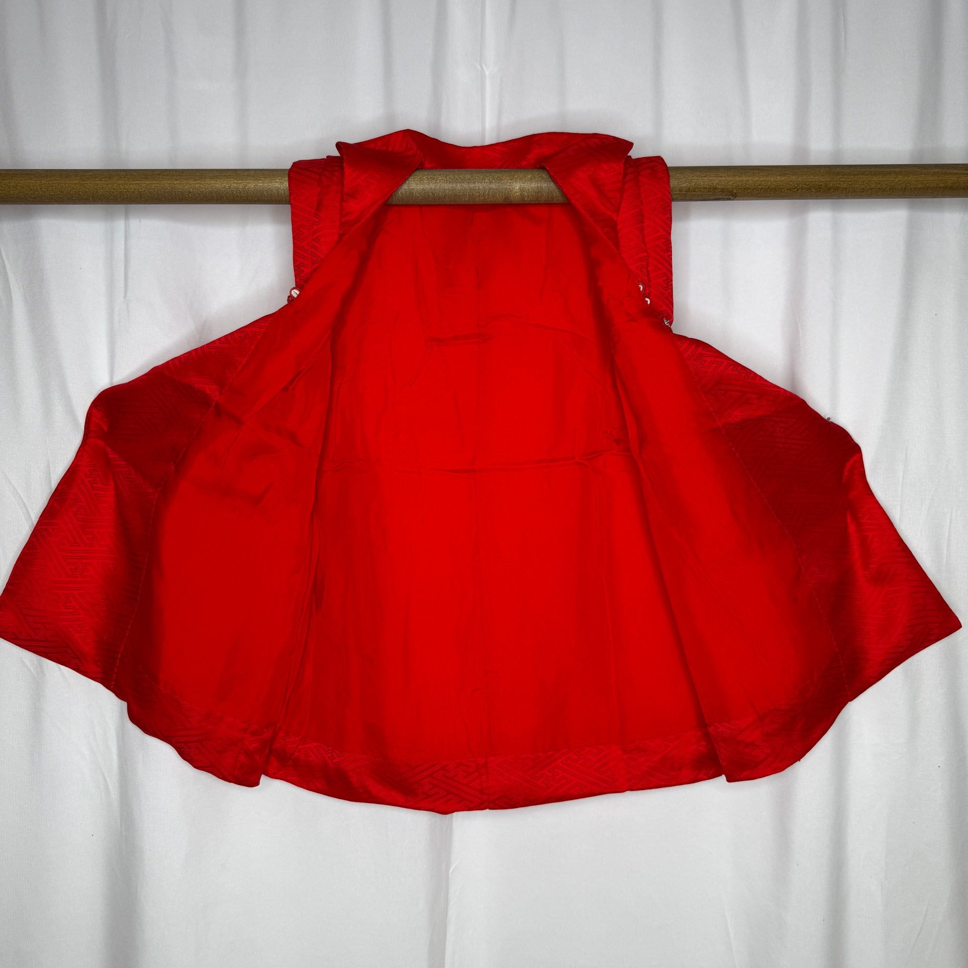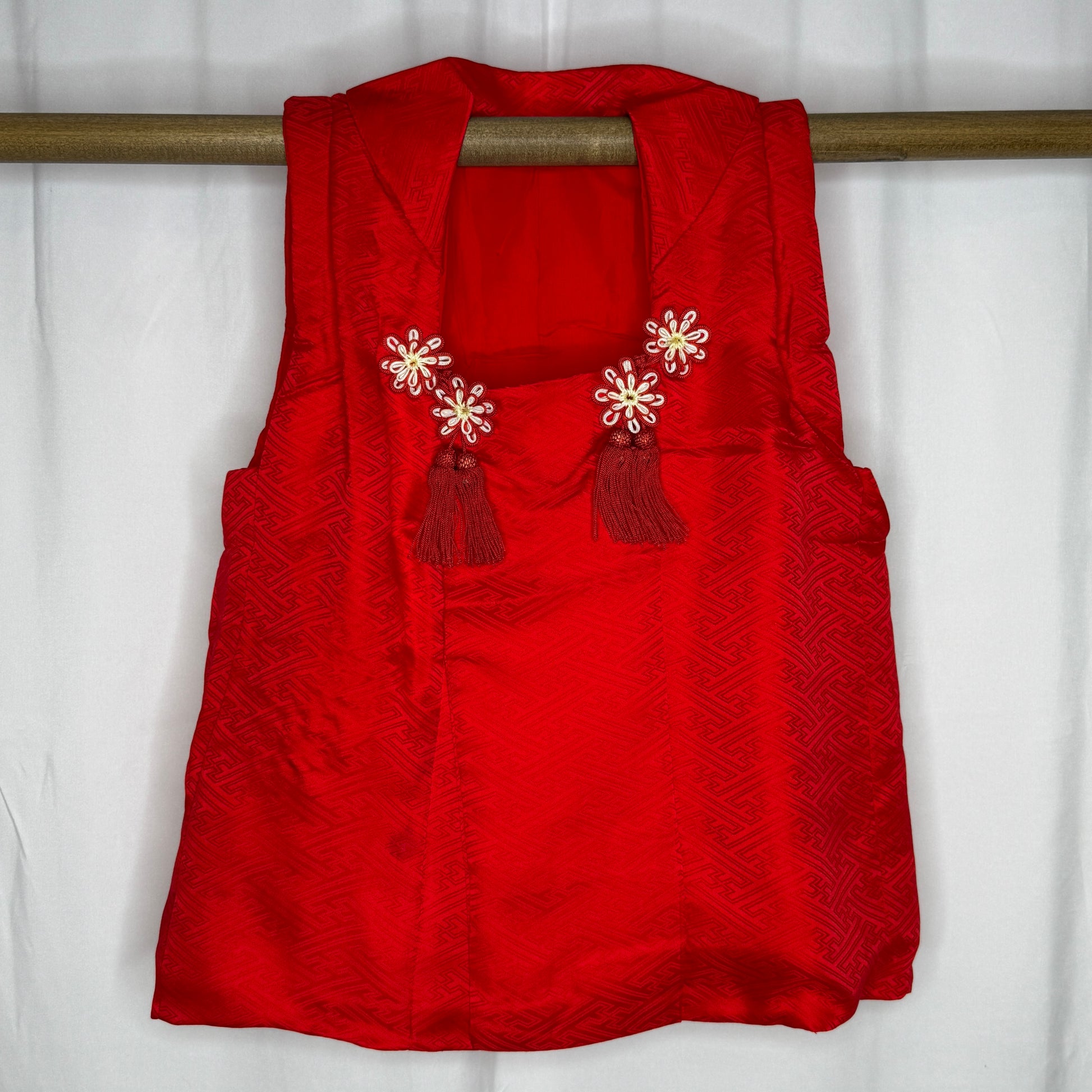 This charming vintage Japanese vest, known as a hifu, was traditionally worn by young girls during the Shichi-Go-San festival, a rite of passage celebrating ages 3 and 7. Crafted in a brilliant red silk with a subtle tone-on-tone sayagata patterned jacquard, it features delightful floral knot and dangling tassels across the chest. The bold red hue is considered an auspicious color, offering protection and blessings for children.