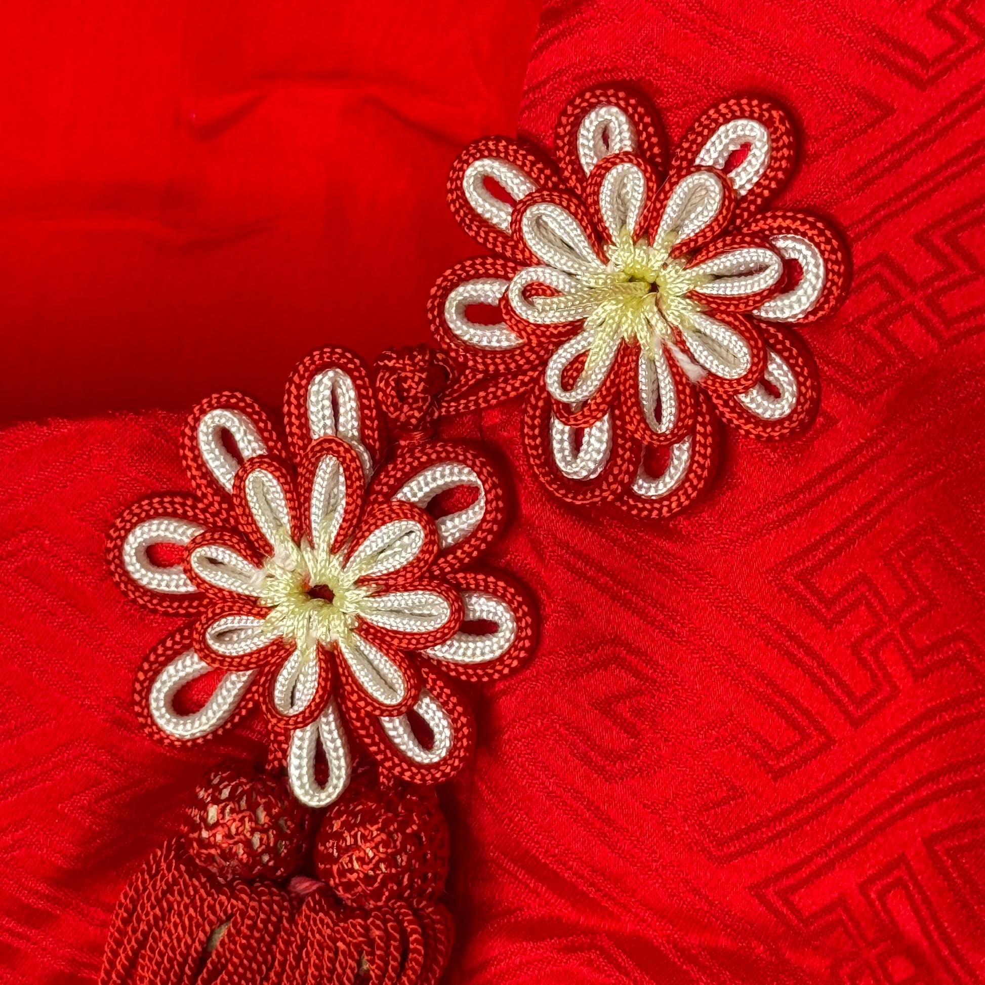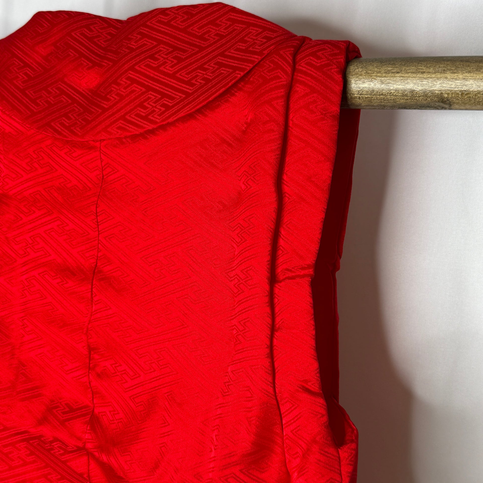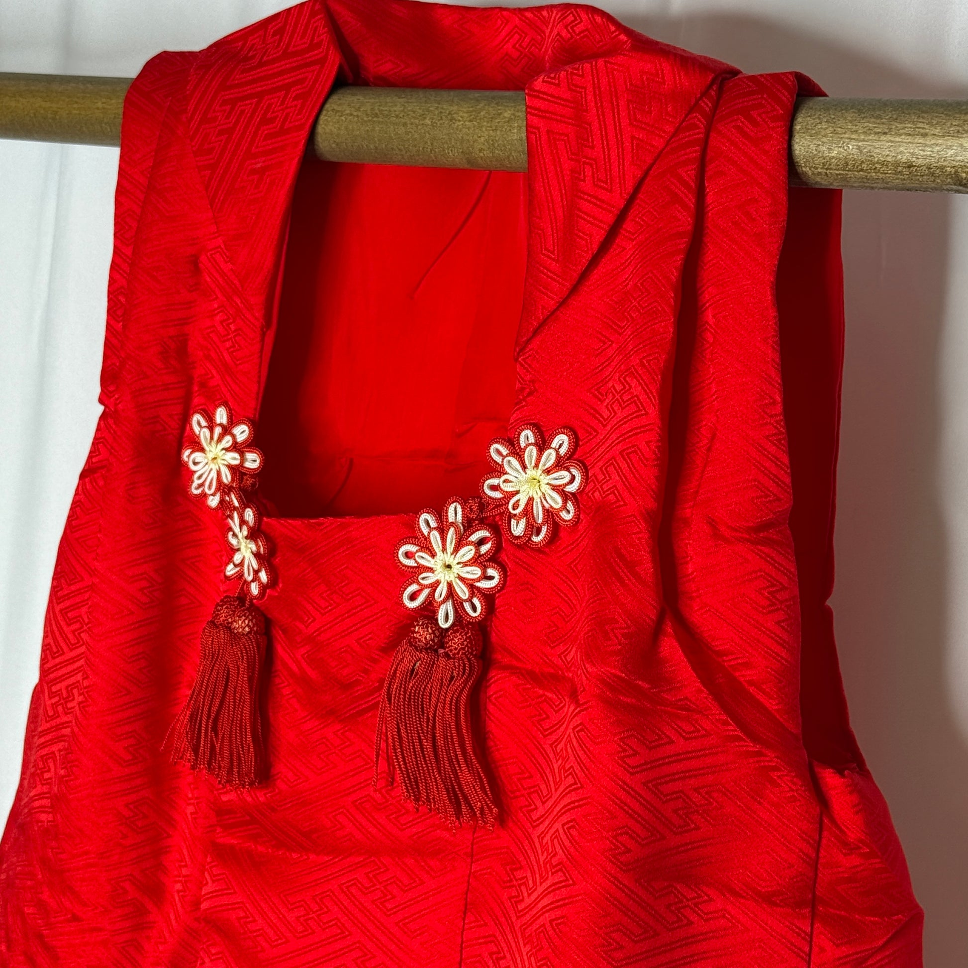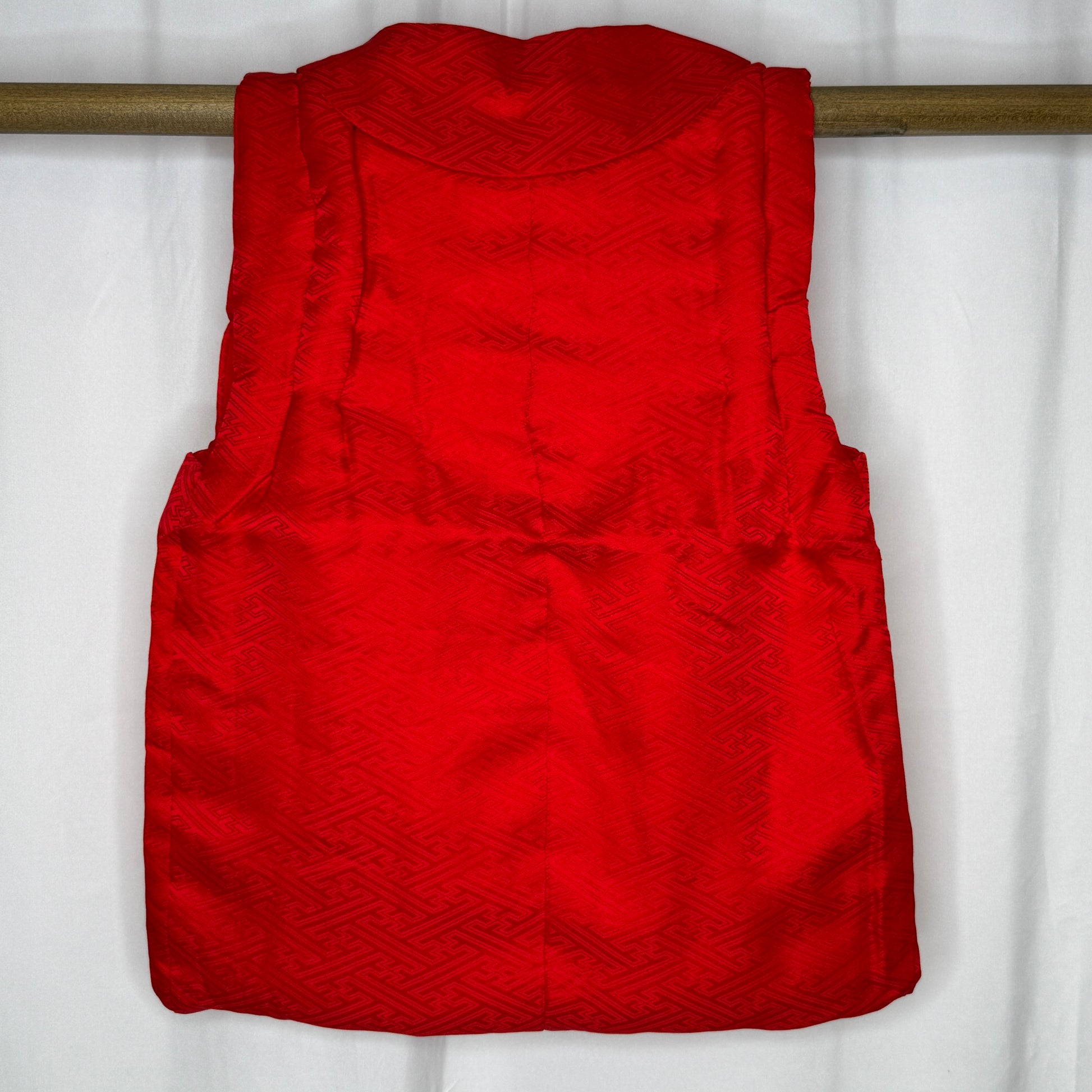 This charming vintage Japanese vest, known as a hifu, was traditionally worn by young girls during the Shichi-Go-San festival, a rite of passage celebrating ages 3 and 7. Crafted in a brilliant red silk with a subtle tone-on-tone sayagata patterned jacquard, it features delightful floral knot and dangling tassels across the chest. The bold red hue is considered an auspicious color, offering protection and blessings for children.