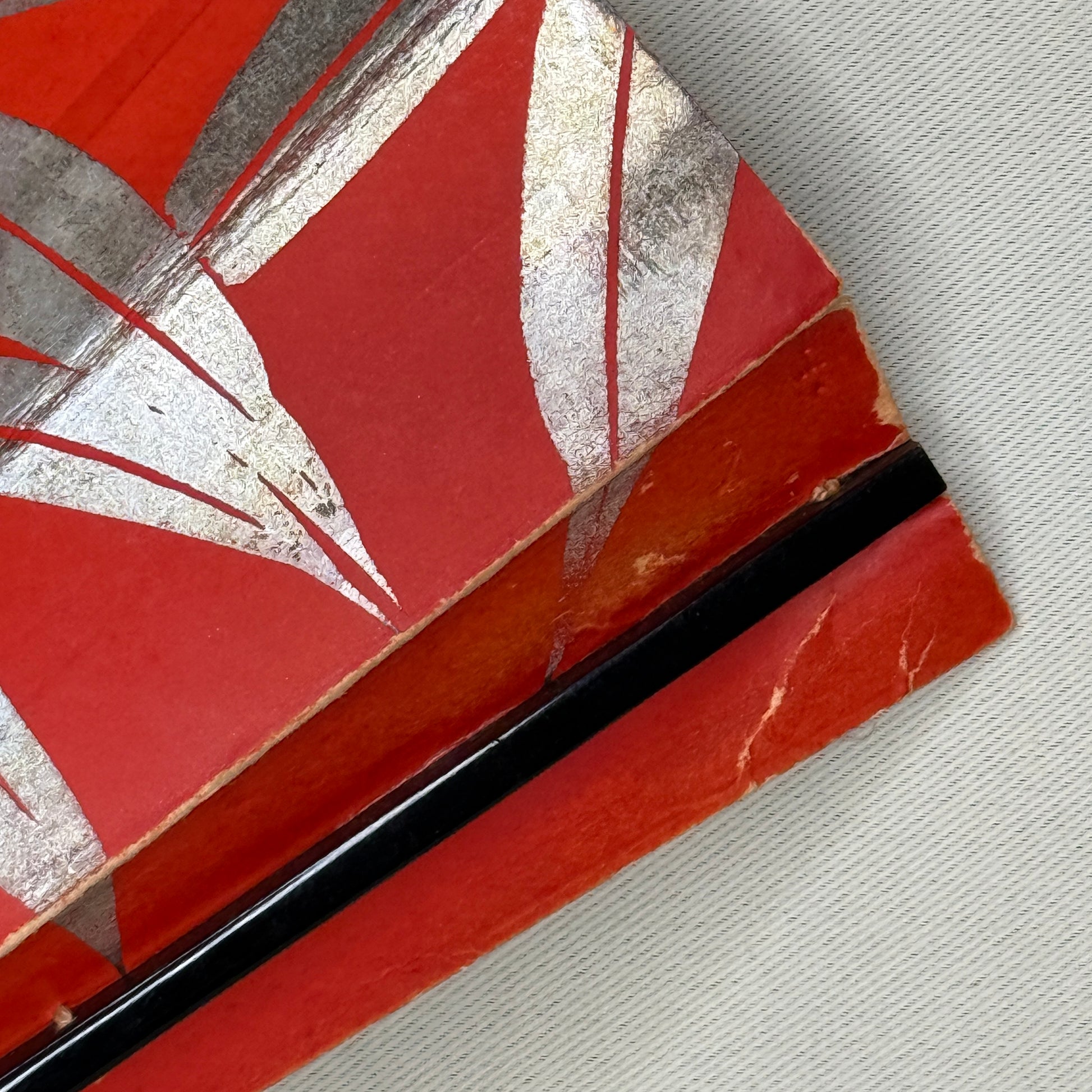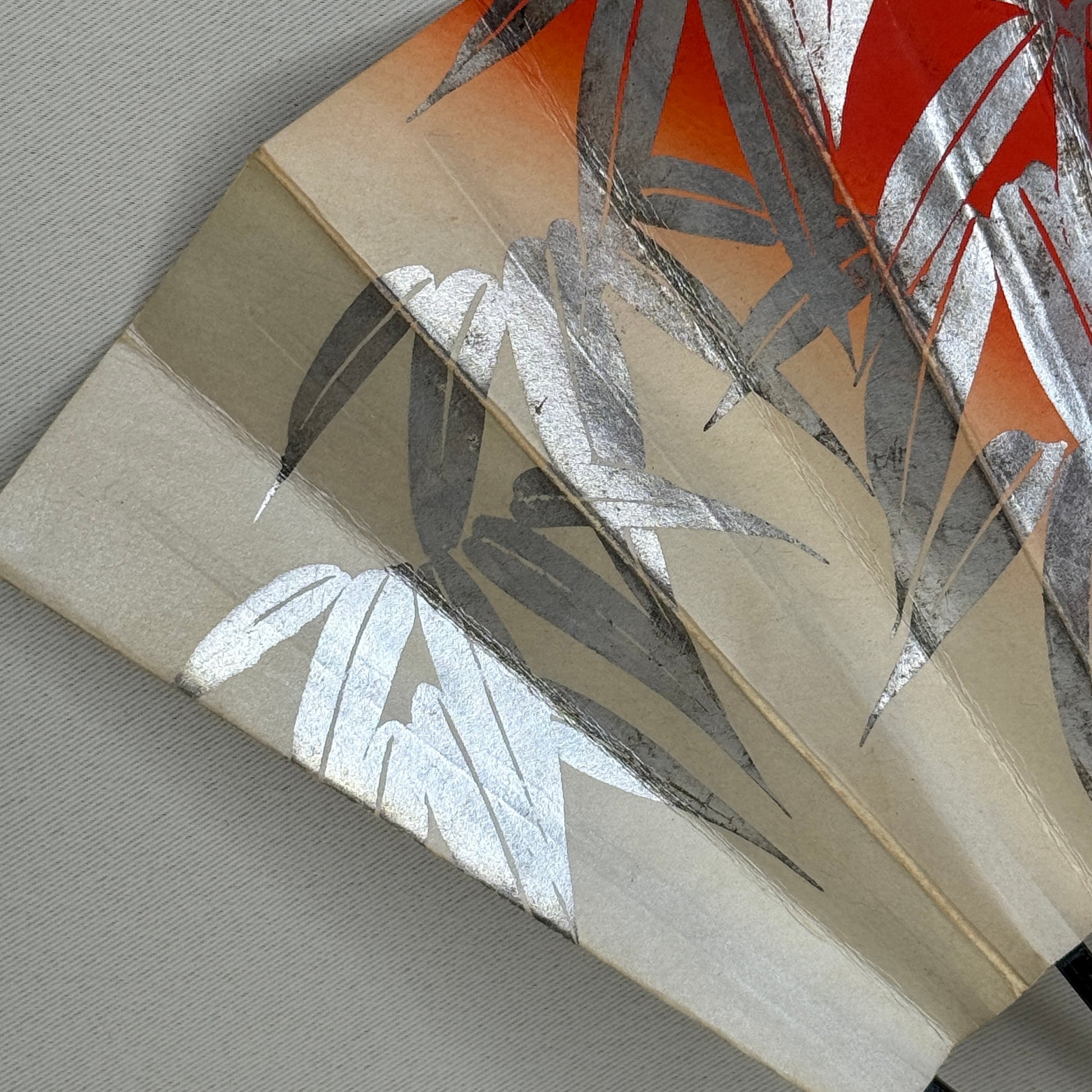 Vivid and dramatic, this Japanese folding fan captures the timeless strength and grace of bamboo in motion. Metallic silver leaves shimmer across a bold red and ivory gradient, suggesting sunlight filtering through a bamboo forest at dusk. The sleek black lacquered bamboo ribs add depth and contrast, giving this piece an air of refined intensity. This dance fan embodies balance, resilience, and the quiet power of nature rendered in vivid color. The design is the same on both sides.