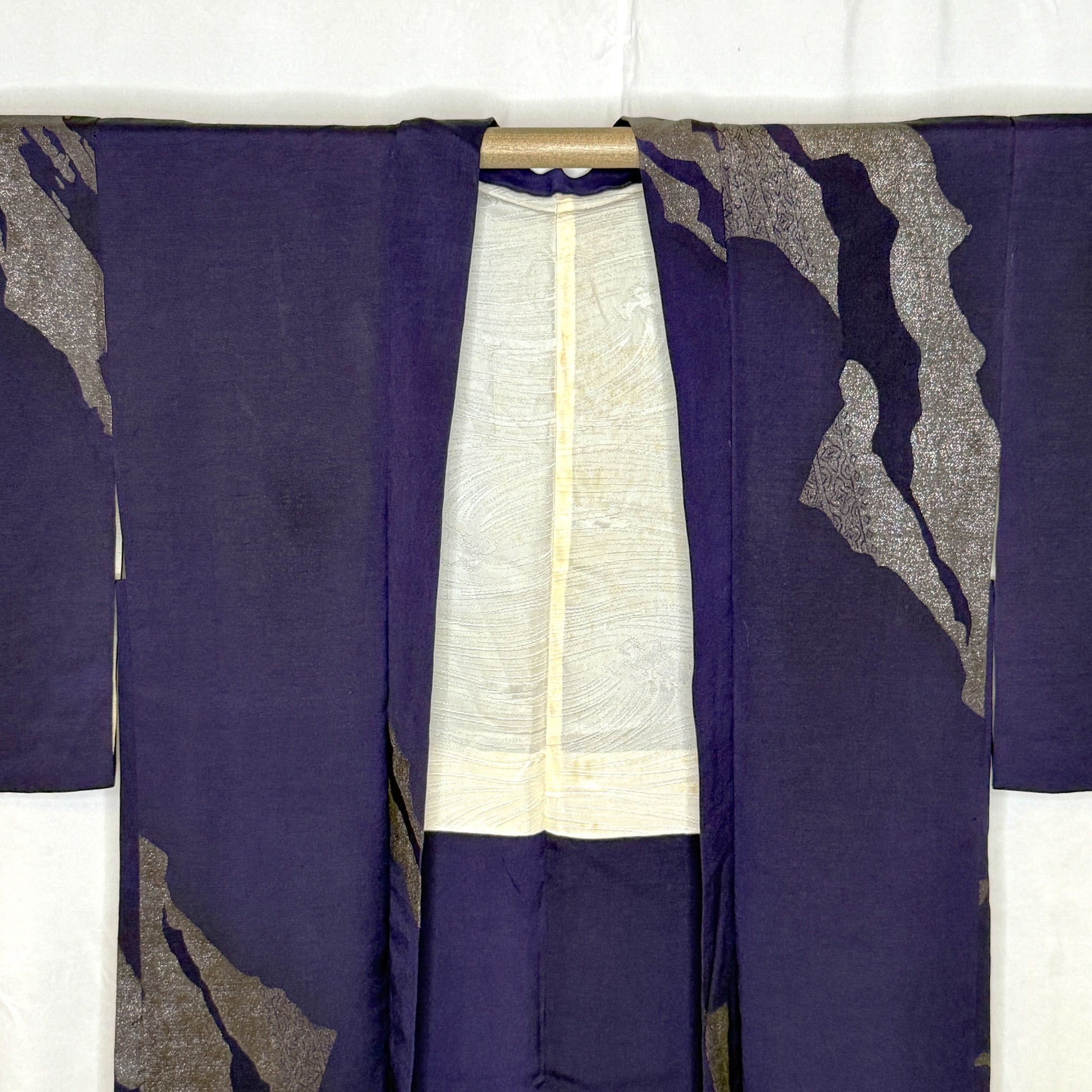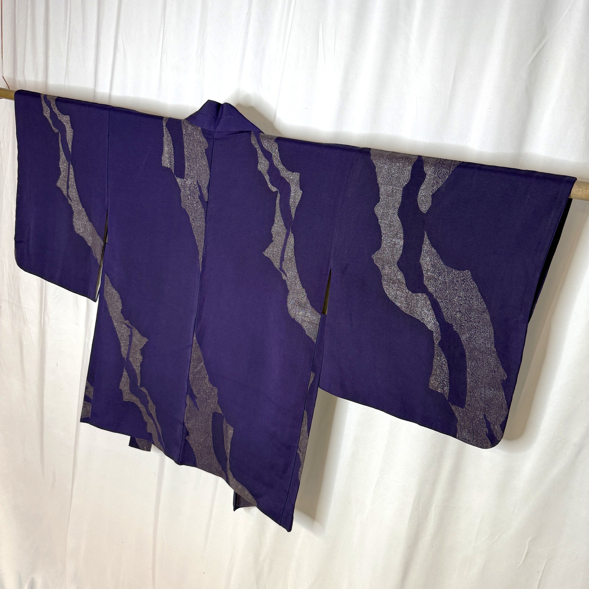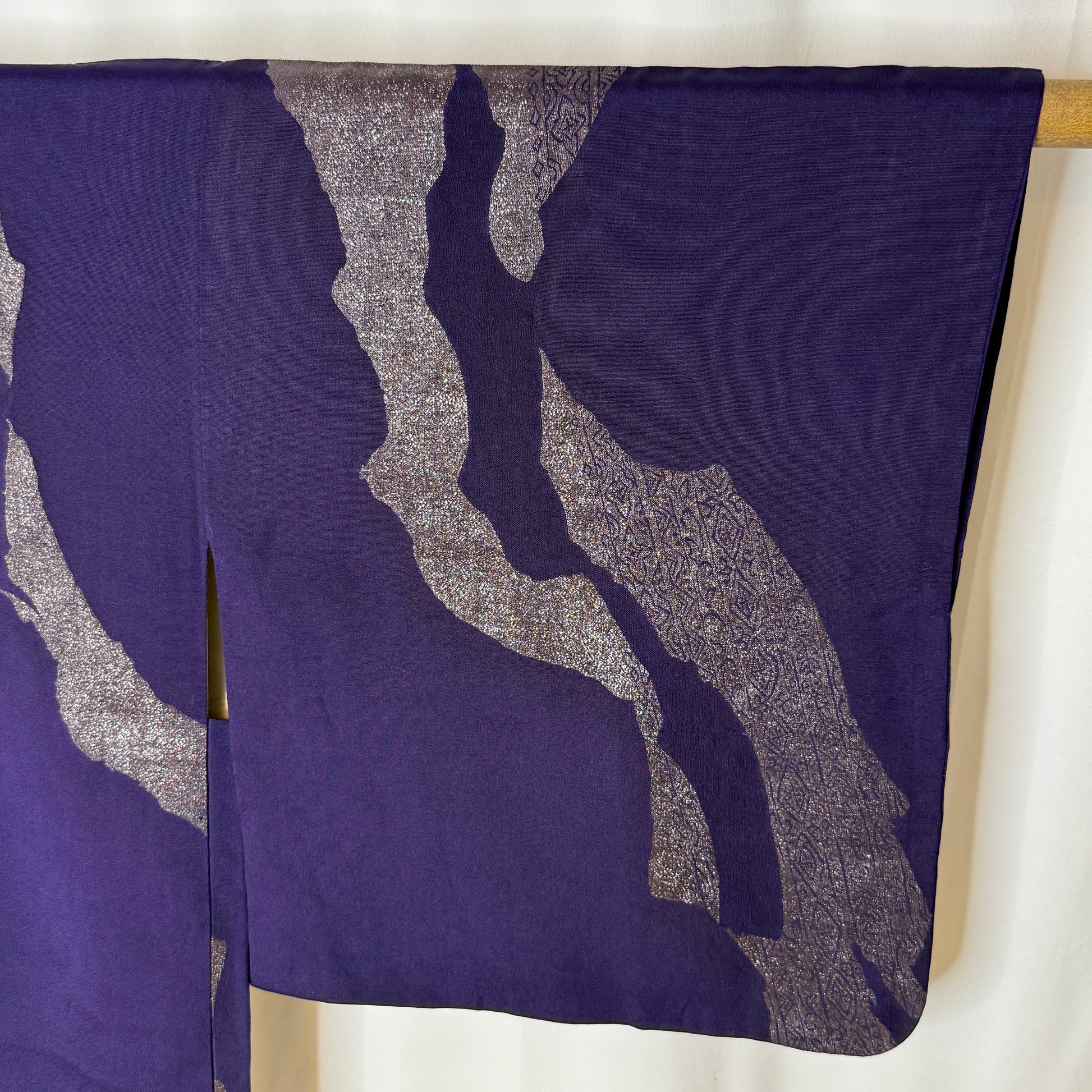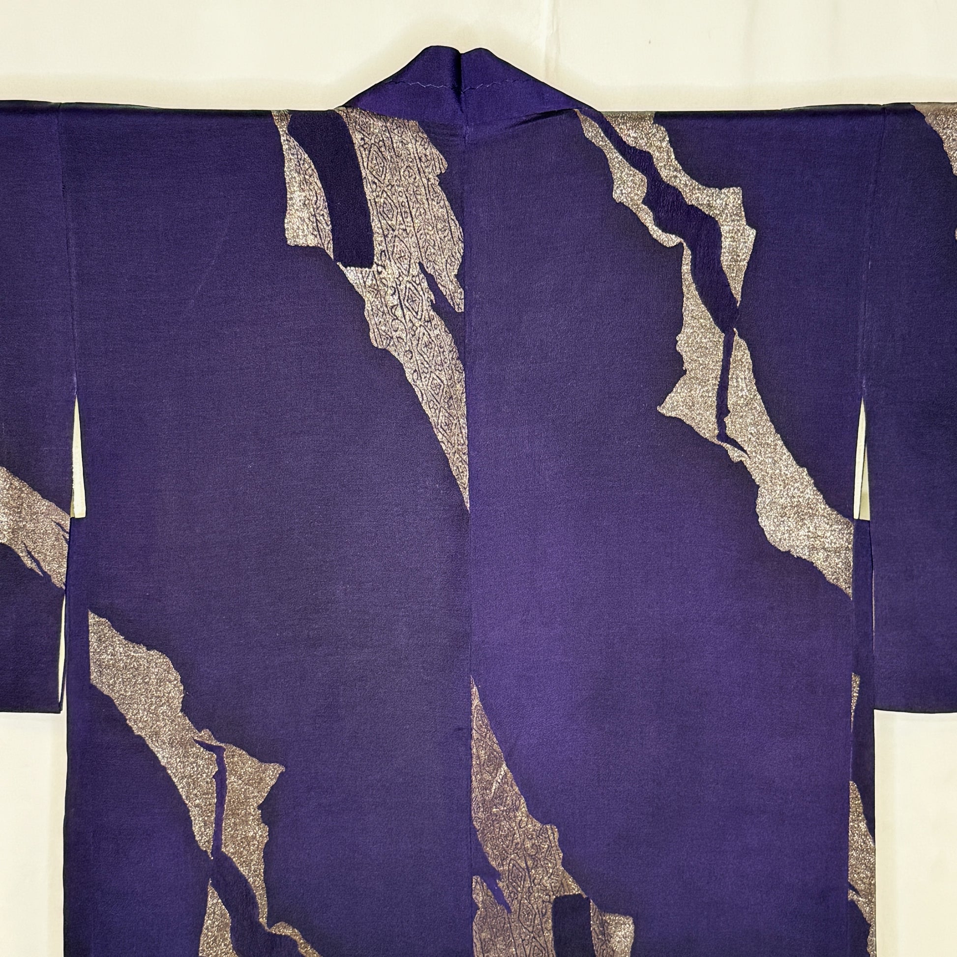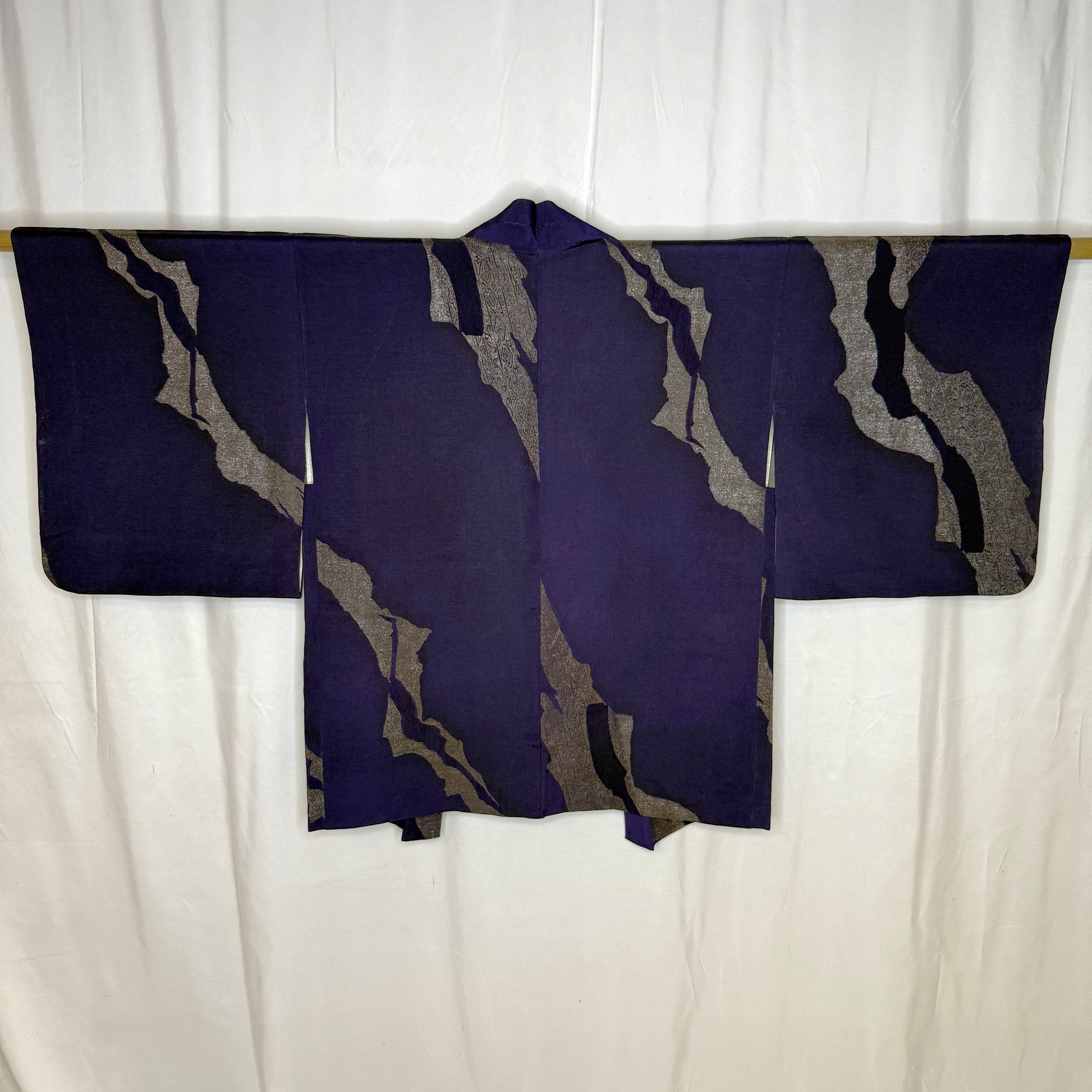This woman's haori jacket features bold sweeping silver streams that cascade across a deep violet background evoking the movement of flowing water or shifting landscapes. The design has a fractured, abstract quality, resembling torn paper or drifting riverbanks, with some shimmering sections including geometric and floral motifs. Dramatic and yet refined!