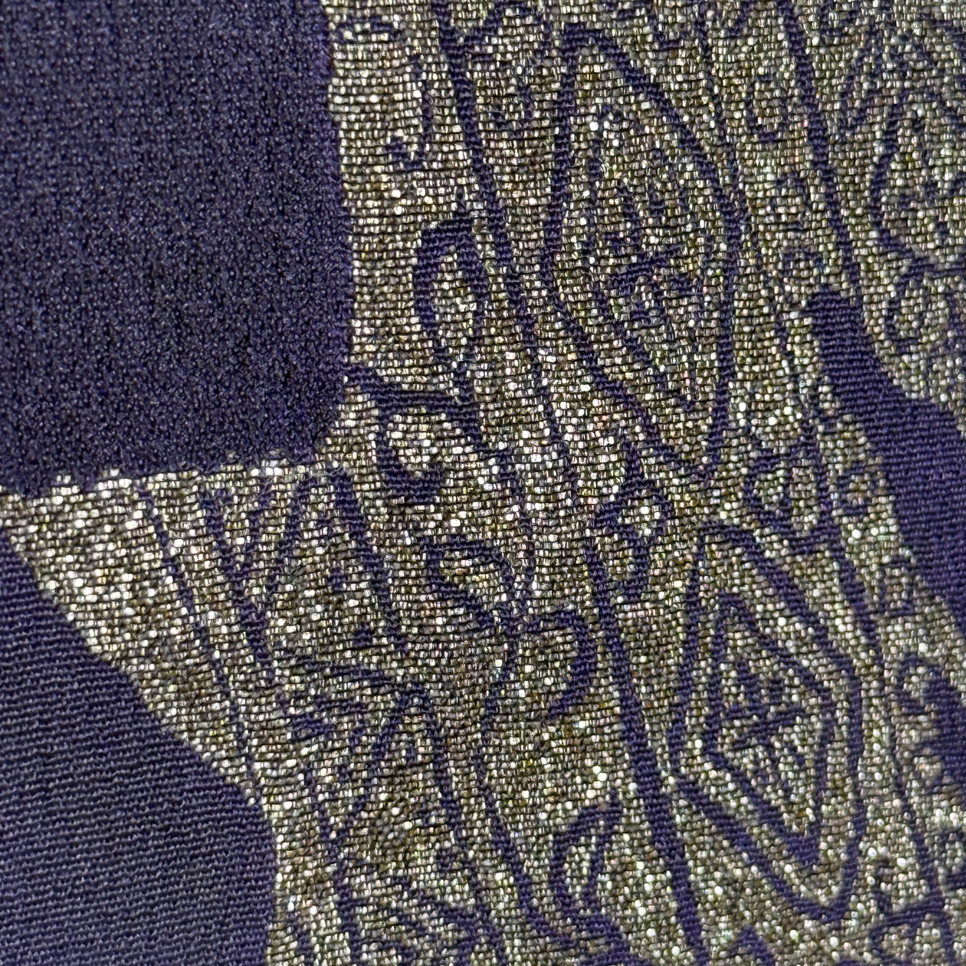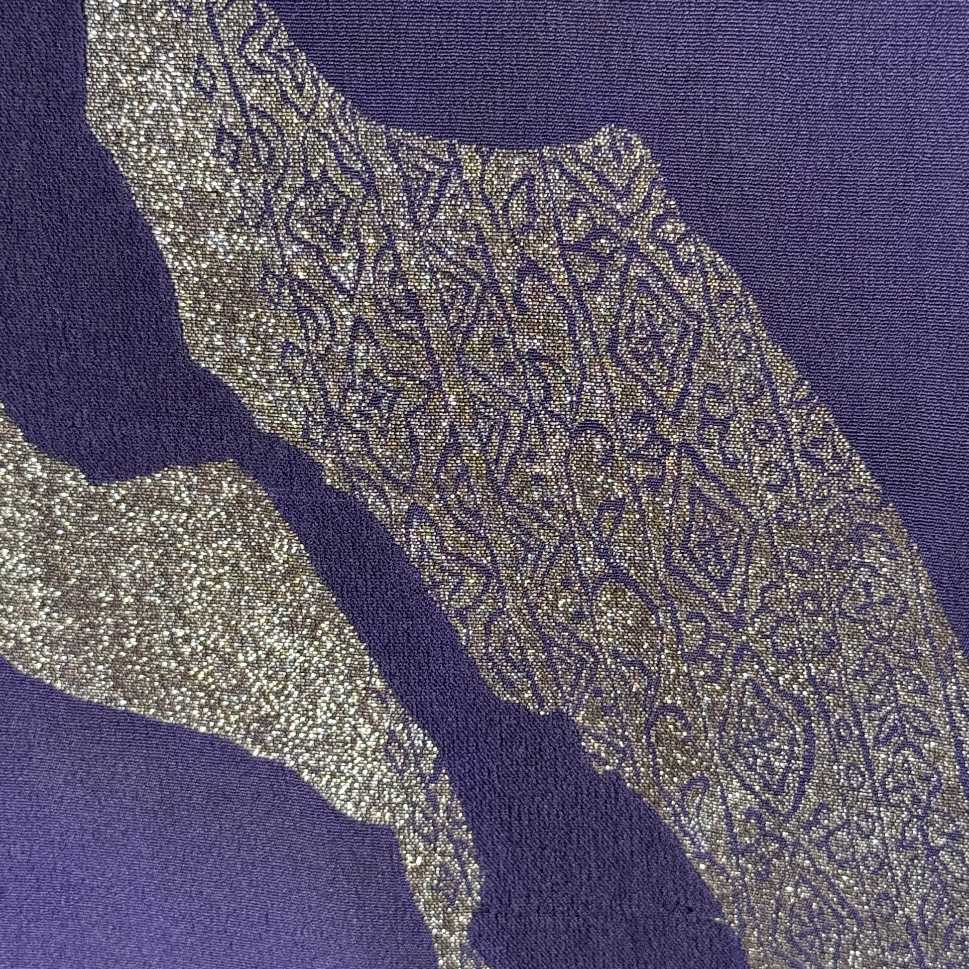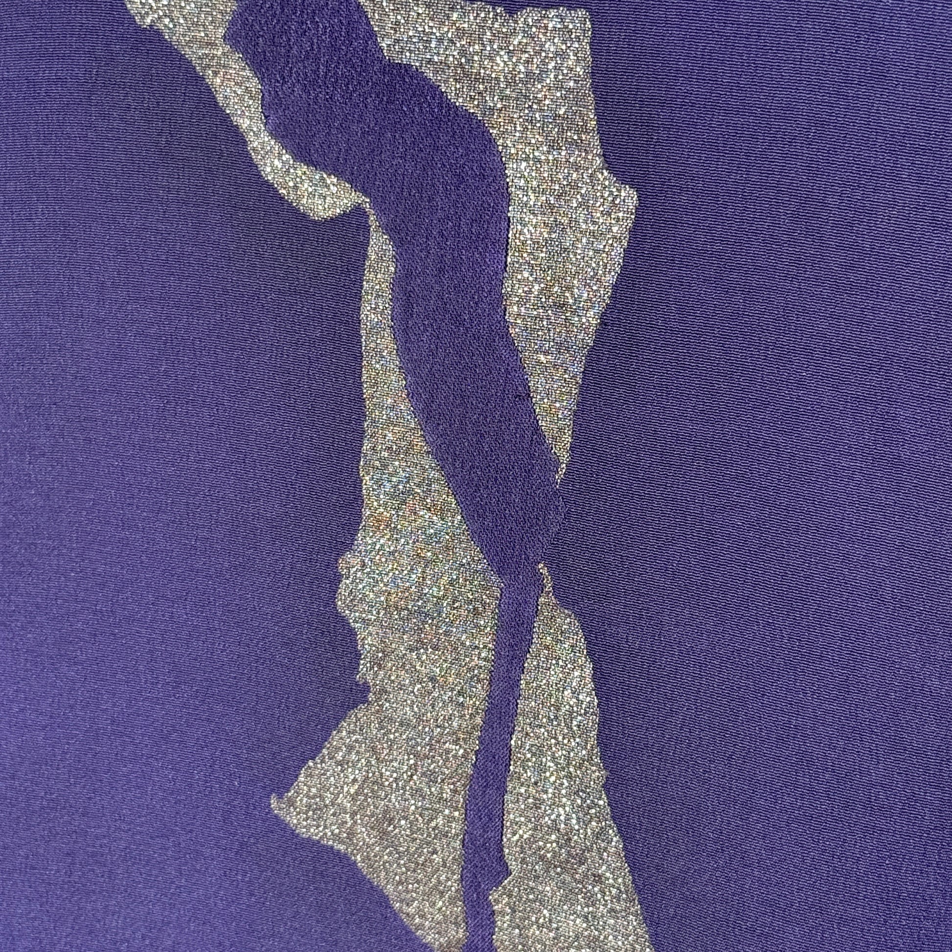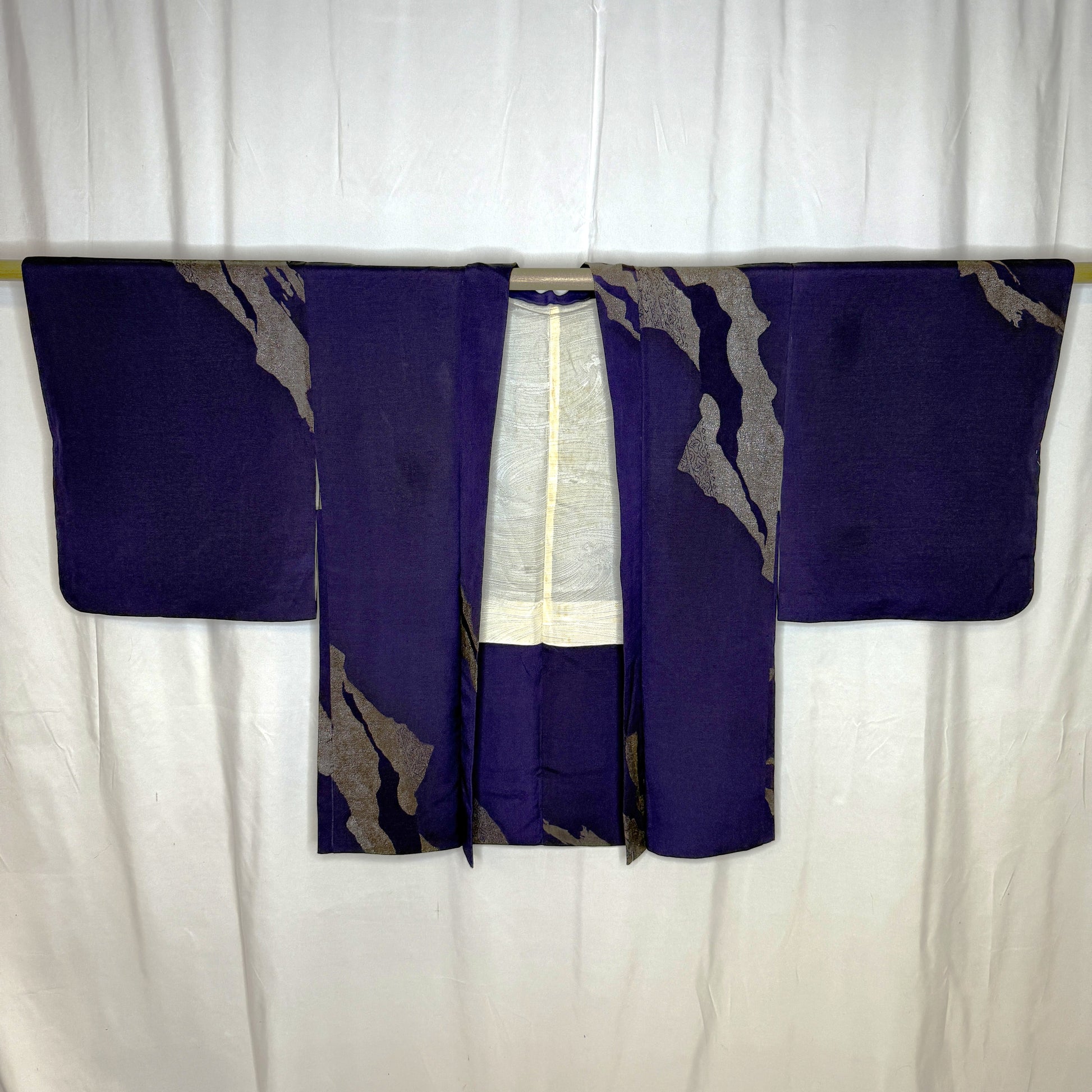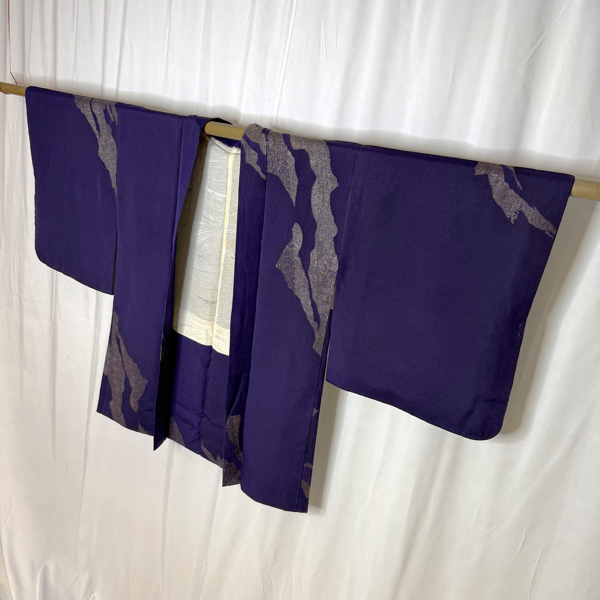 This woman's haori jacket features bold sweeping silver streams that cascade across a deep violet background evoking the movement of flowing water or shifting landscapes. The design has a fractured, abstract quality, resembling torn paper or drifting riverbanks, with some shimmering sections including geometric and floral motifs. Dramatic and yet refined!