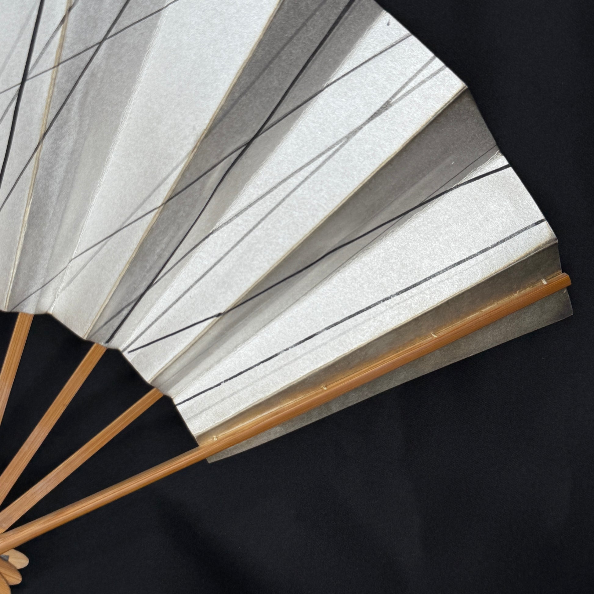 Minimalist yet captivating, this Japanese folding fan features sleek black and gray brush lines that slice across a field of shimmering silver. Each line feels like a stroke of wind or rain: controlled, graceful and alive with rhythm. The metallic paper catches the light beautifully, while the warm bamboo ribs provide a natural counterbalance to the cool, modern palette. The design is the same on both sides.
