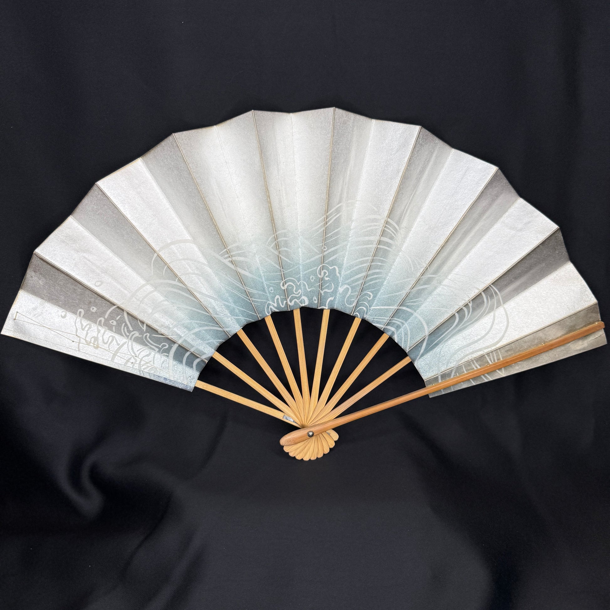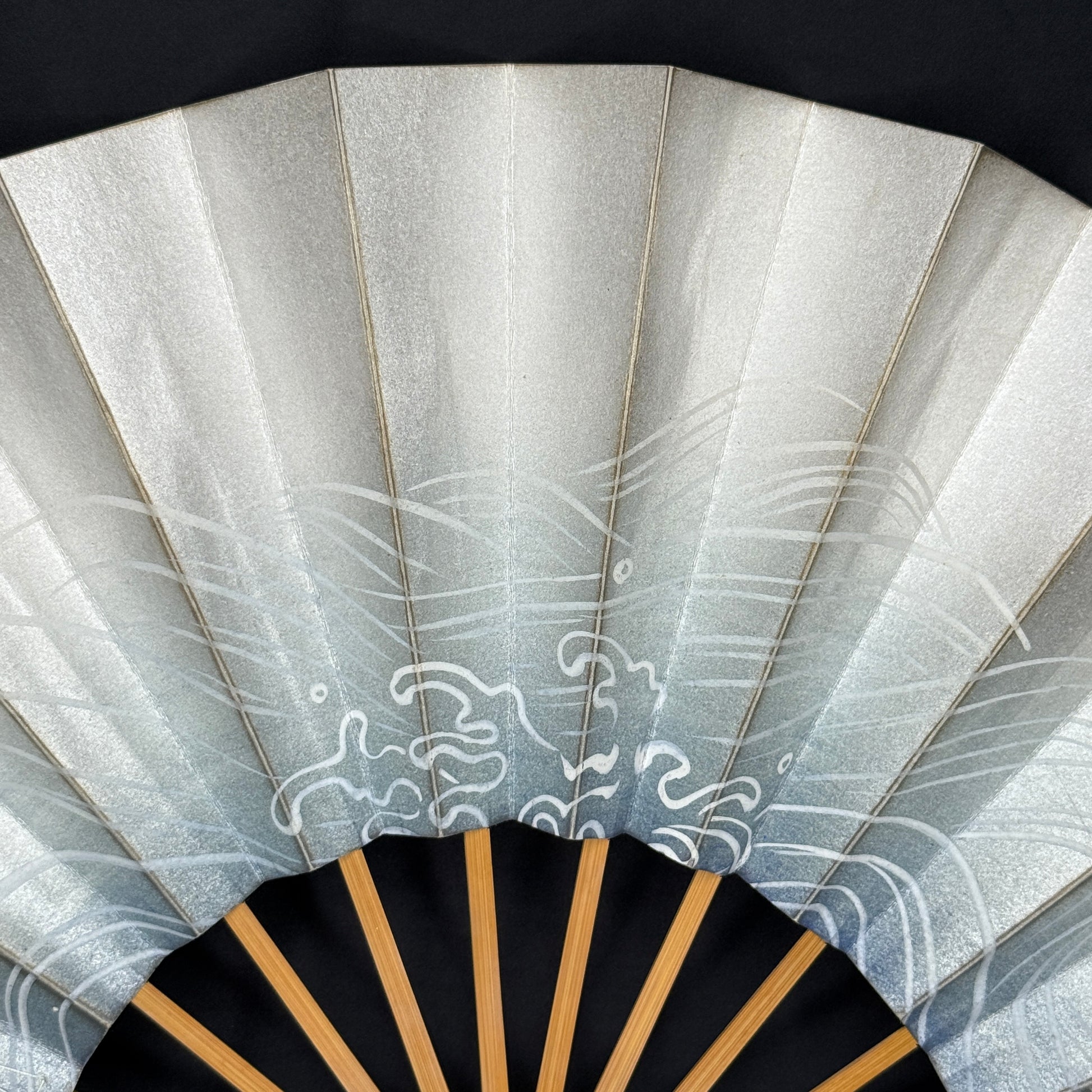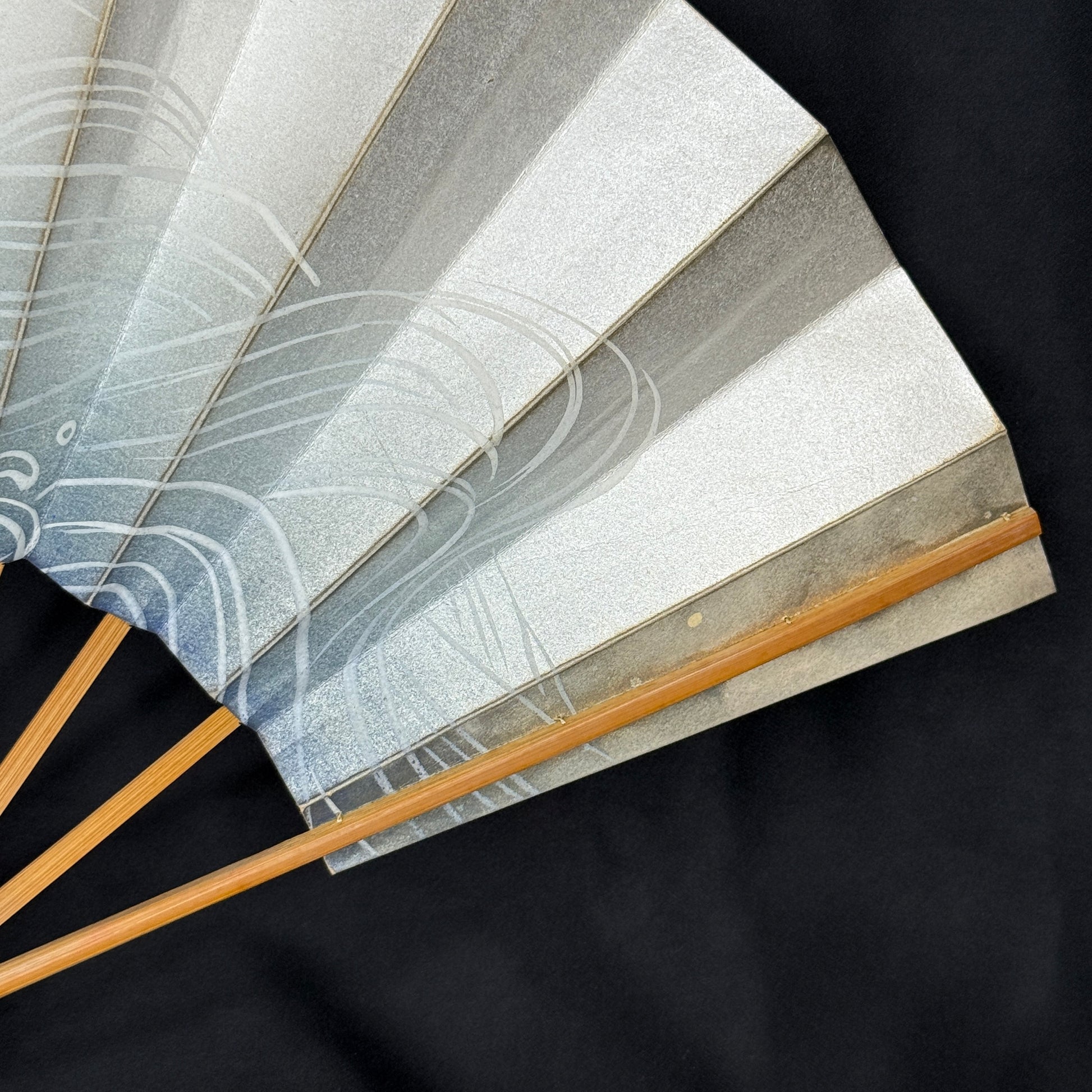 Ethereal and refined, this Japanese folding fan captures the rhythm of the sea in motion. Pale silver fades to misty blue along the folds, where soft white waves curl and flow like brushstrokes in water. Lovely natural bamboo ribs add warmth and contrast.