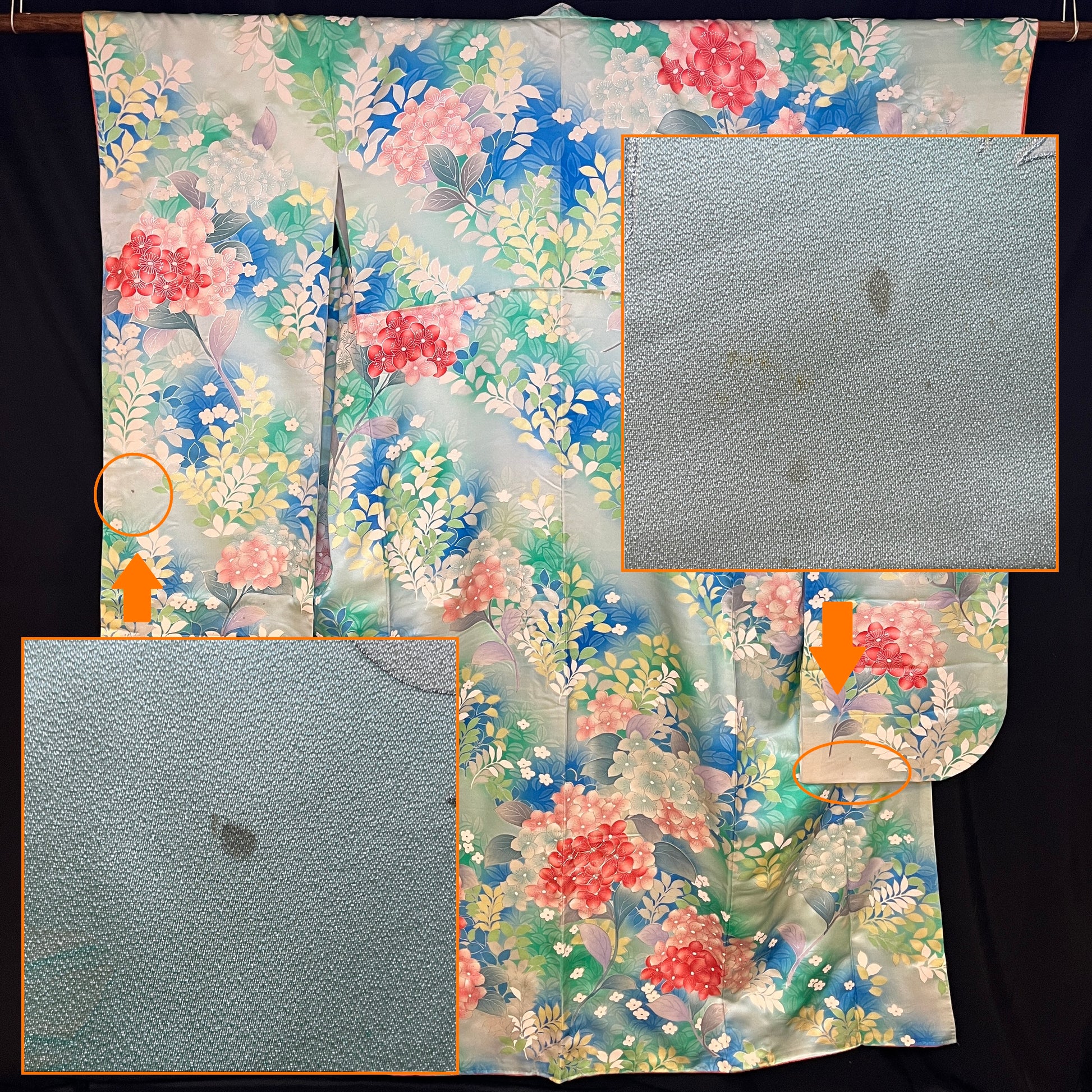 Unfortunately, as with many light-colored kimono, there are a couple small blemishes on the sleeves, but they are quite minor. See last photos.