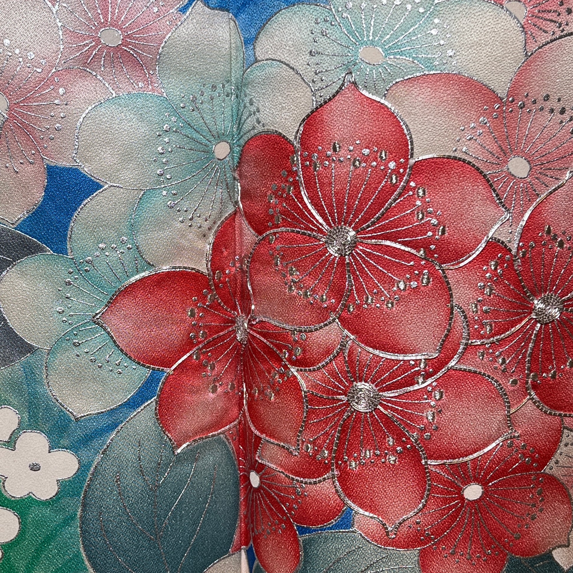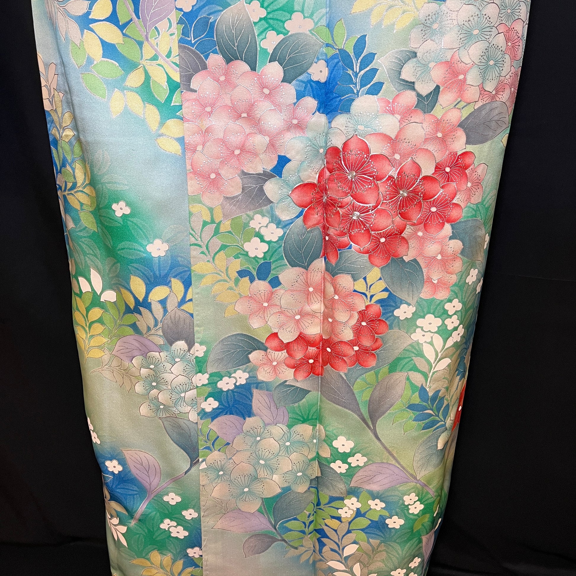 Thie background of this kimono features diagonal bands in blue and green that are overflowing with florals, leaves, and stems. So many soft pastels fill the petals and leaves which are outlined and embellished with silver leaf or silver paint. Silver couching on featured florals adds even more elegance.