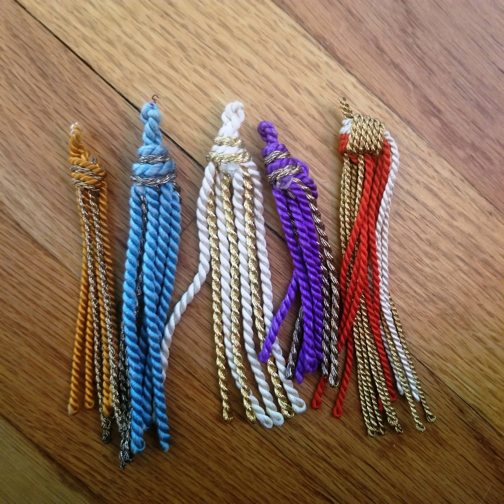 Each tassel is a different color but does include a strand of gold or silver. Each is tied in a simple knot and has a loop at the top that can be used to attach the tassel.