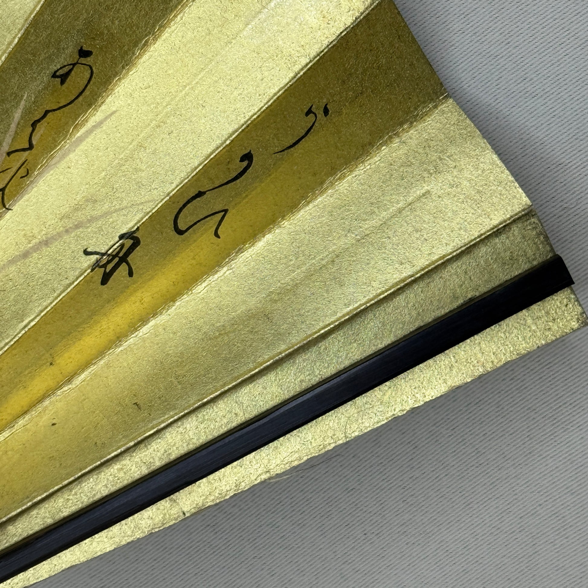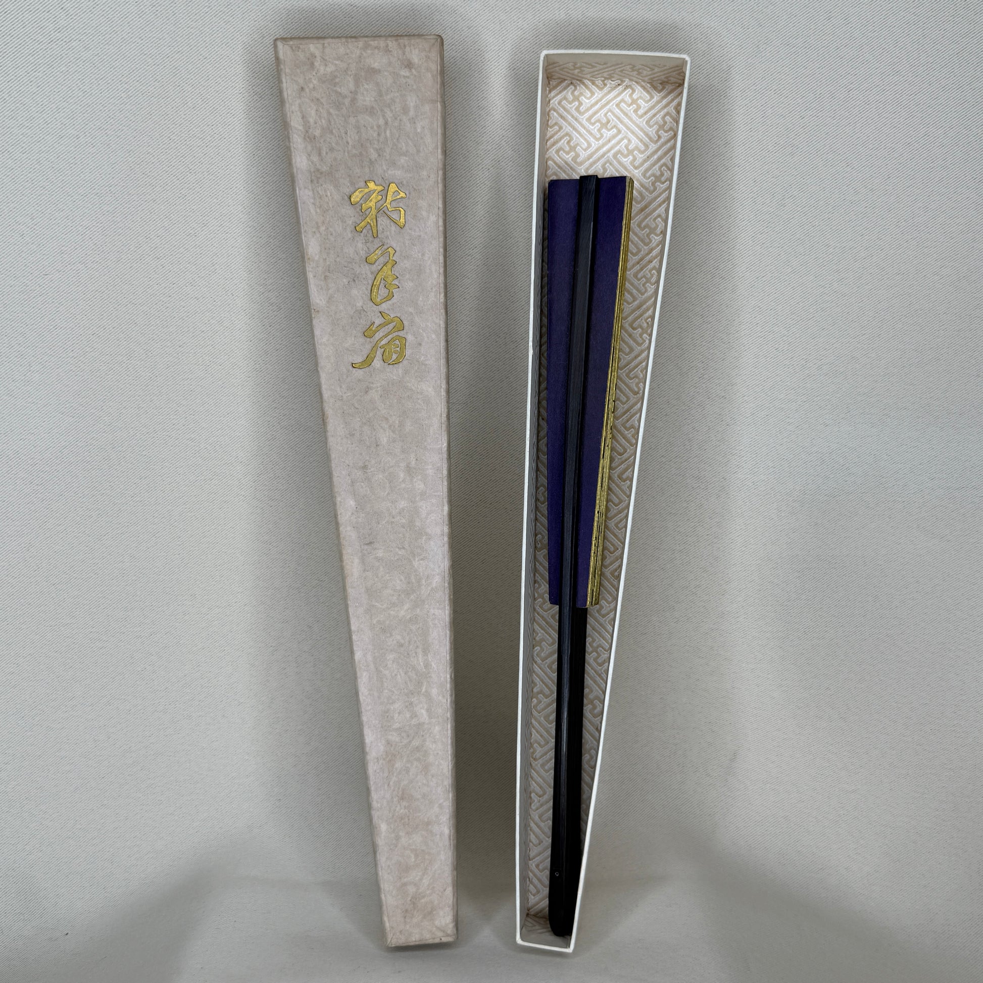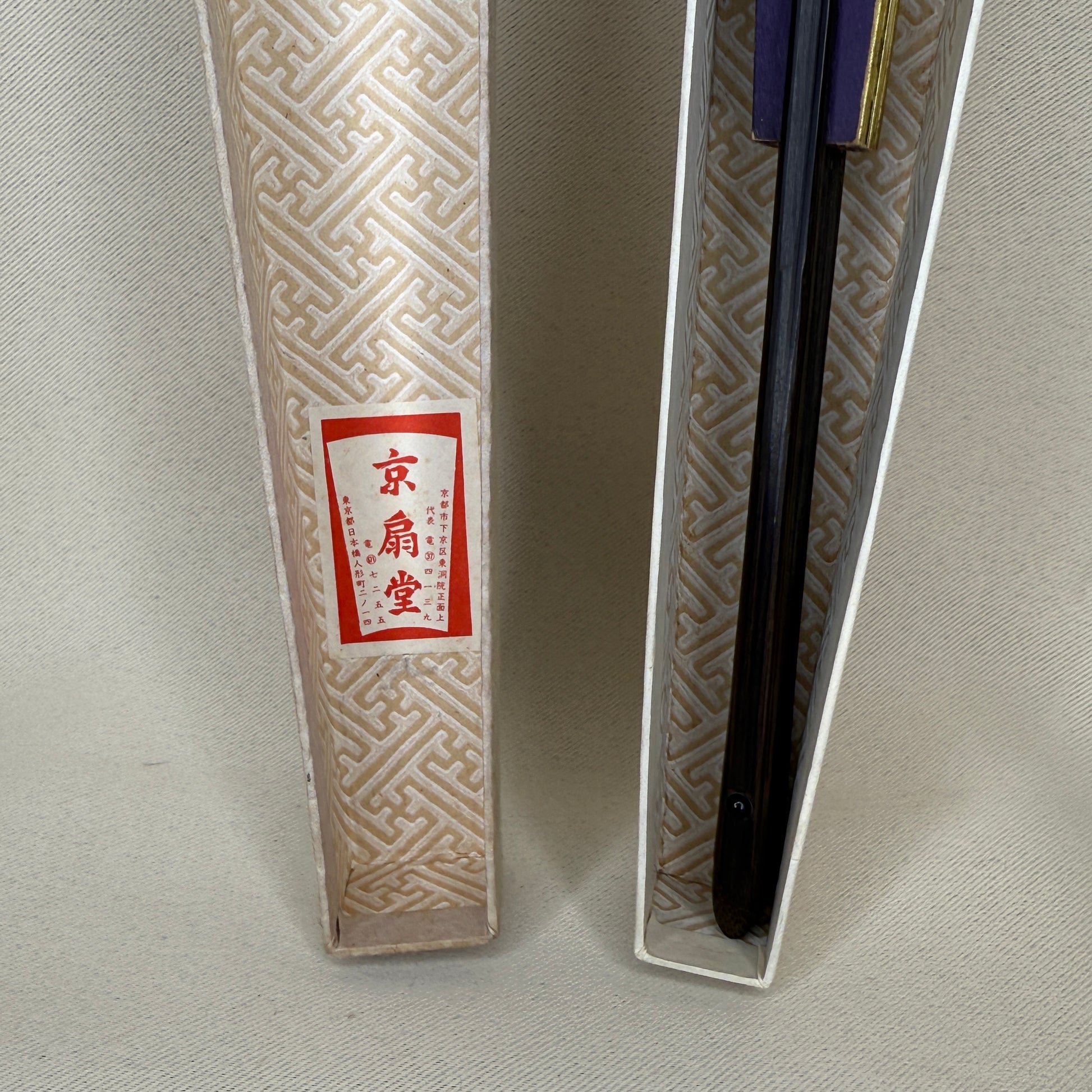 A rare two-sided Kyoto fan blending poetry and progress, this folding fan features hand-painted bellflowers and flowing calligraphy on shimmering gold, balanced by a deep violet reverse side bearing the Japan Air Lines logo. Created by the Kyoto maker Kyosendo, it embodies both traditional refinement and modern design. The floral side evokes the grace of classical dance and waka poetry, while the reverse celebrates Japan's aviation era. Comes with the original box with kanji that translates to Color Dance Fan.