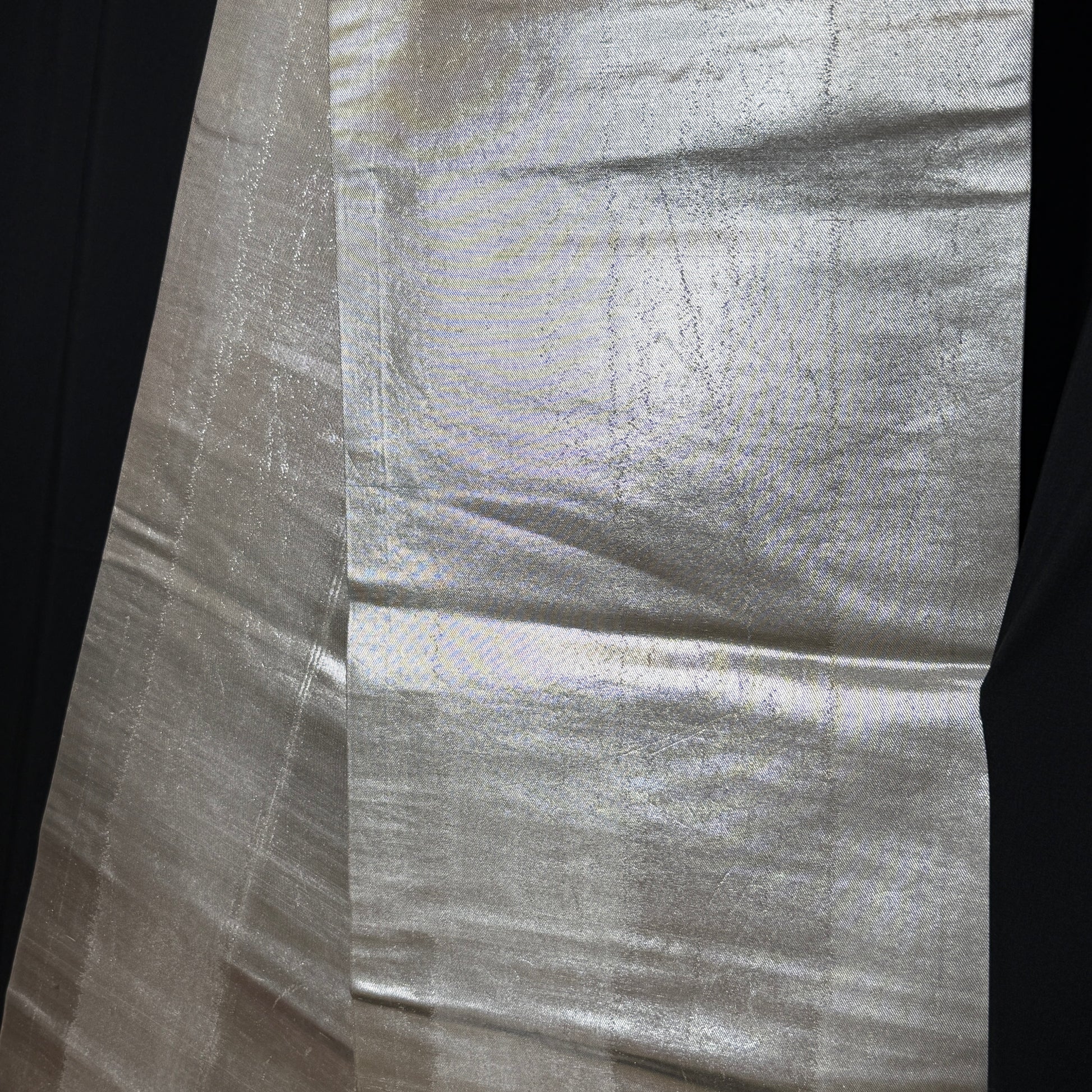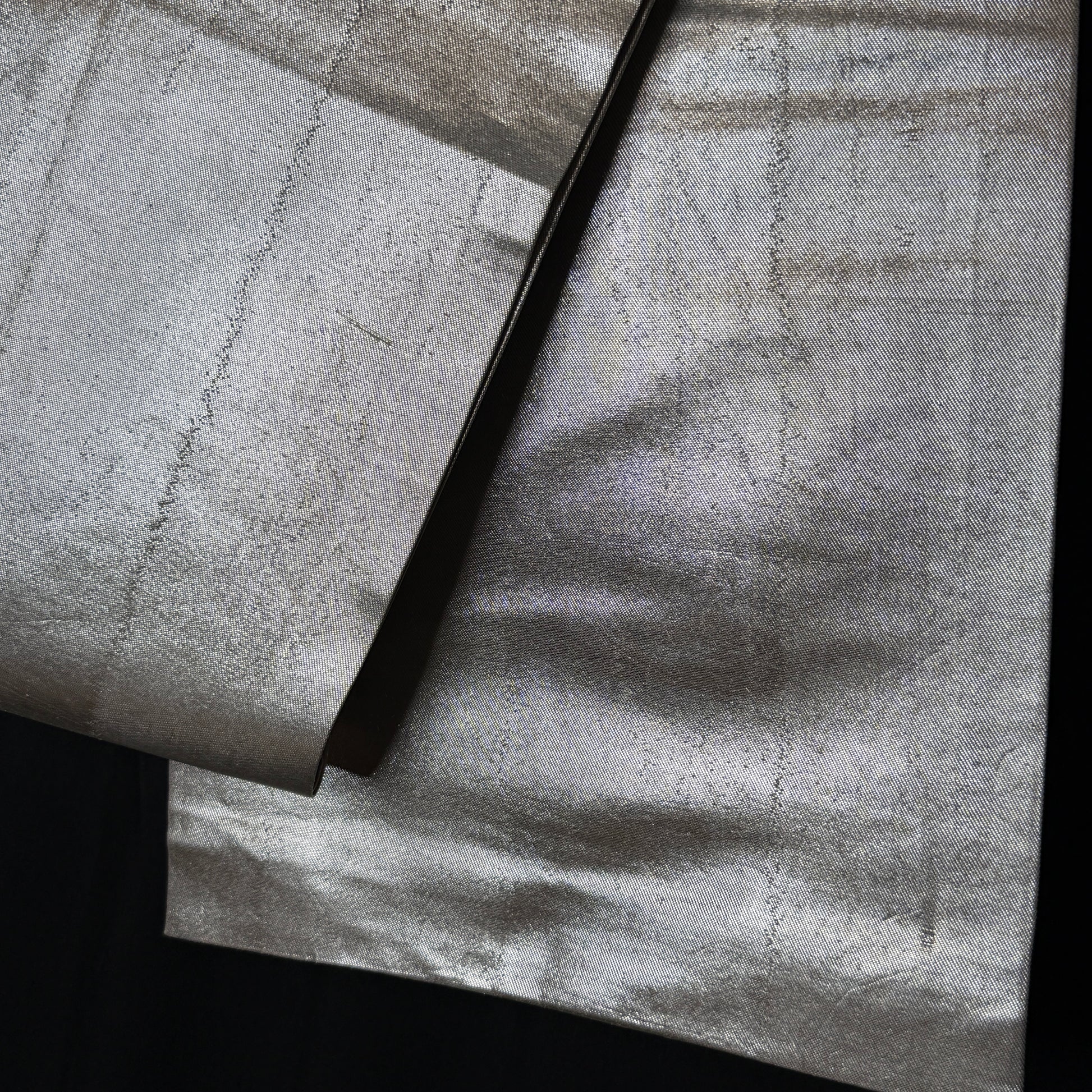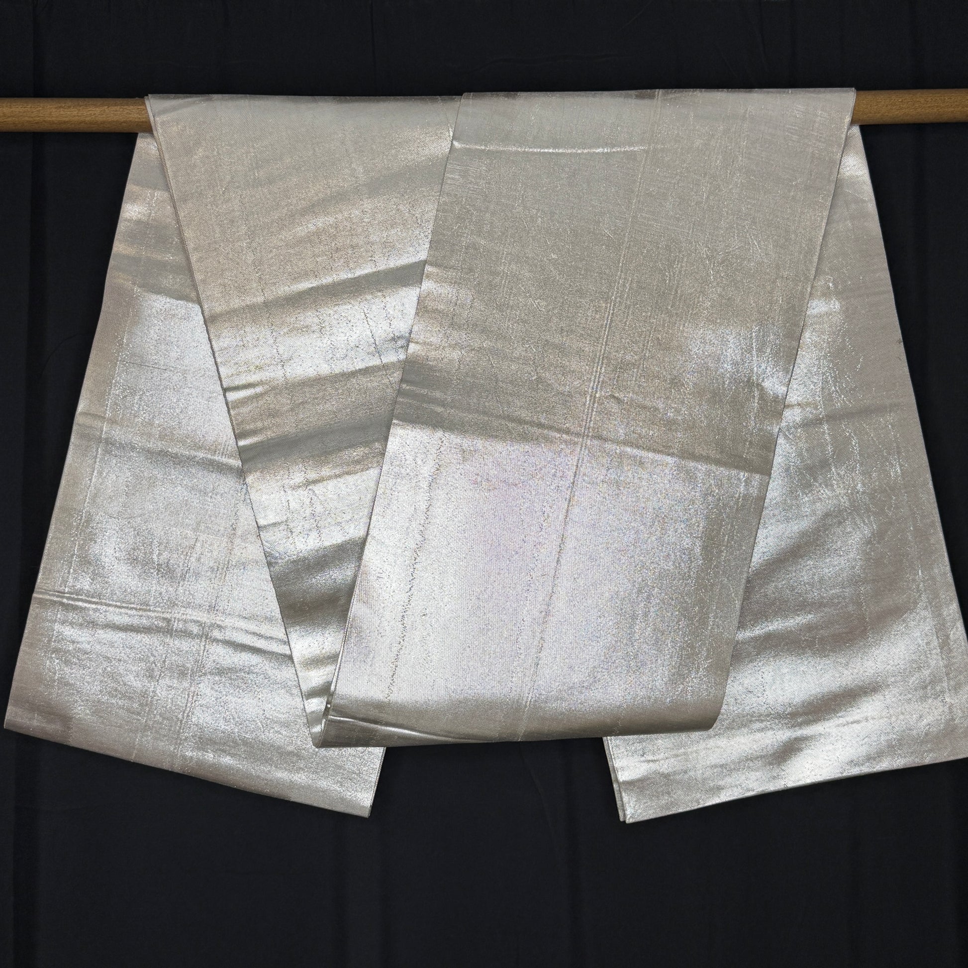 Proof that simplicity can be the boldest statement, this plain silver fukuro obi radiates modern elegance. The luminous metallic weave creates a liquid light effect that shifts beautifully with movement. Its clean, uninterrupted surface makes it endlessly versatile, perfect for balancing vibrant kimono.