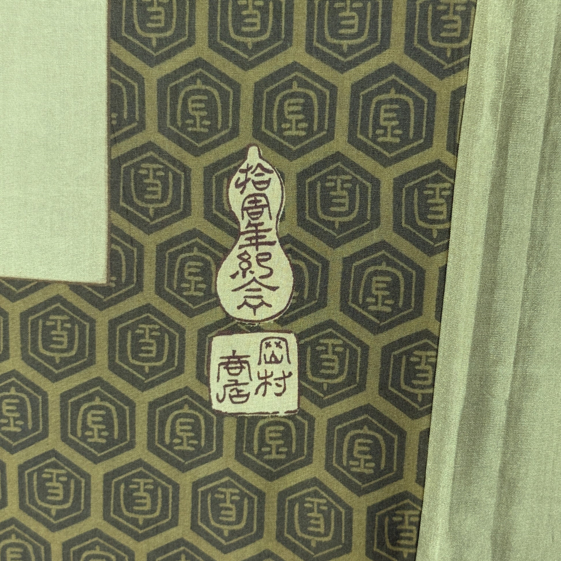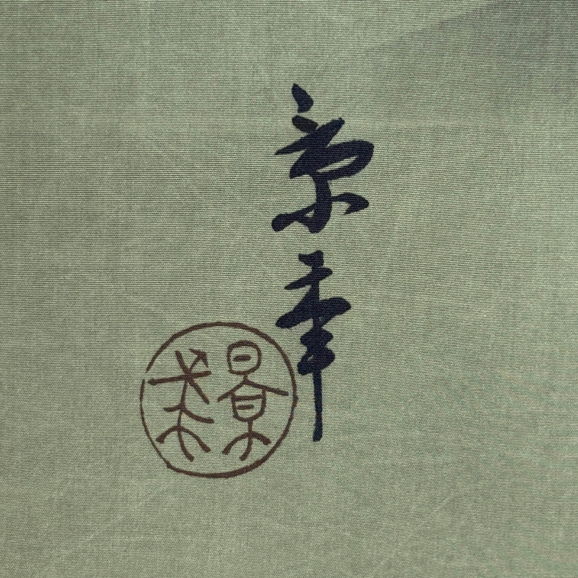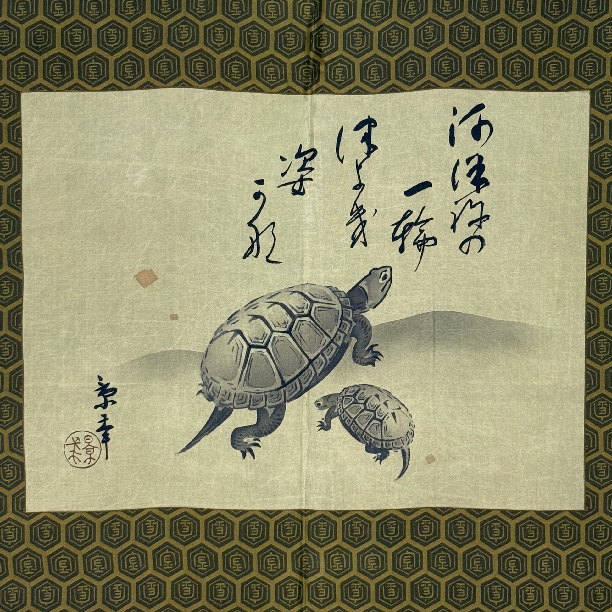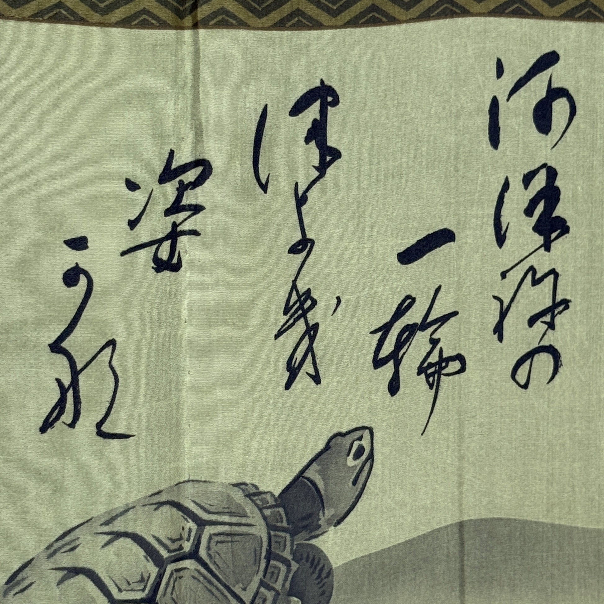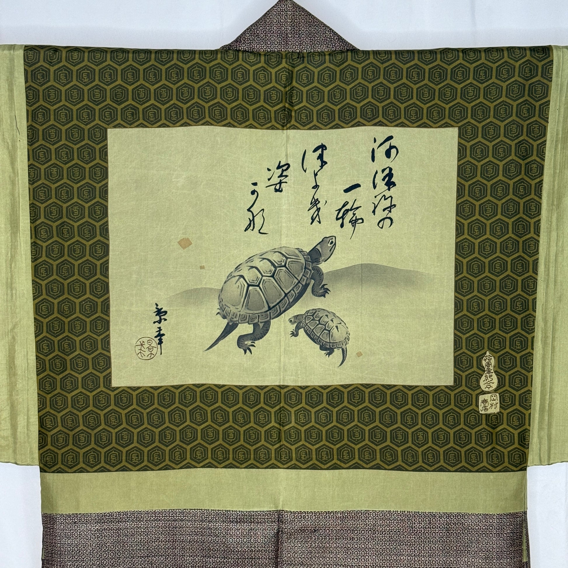This refined men's haori jacket celebrates endurance and wisdom through a serene ink-style design of two tortoises walking across a soft green landscape. Above them the calligraphy roughly translates to "the clear reflection of one bloom at Kawazu in Ise", a poetic image suggesting purity, longevity, and harmony with nature. The artwork is bordered by a hexgonal kikko (tortoiseshell) pattern reinforcing the theme of everlasting life. Signed by the artist Koko with a circular seal mark.
