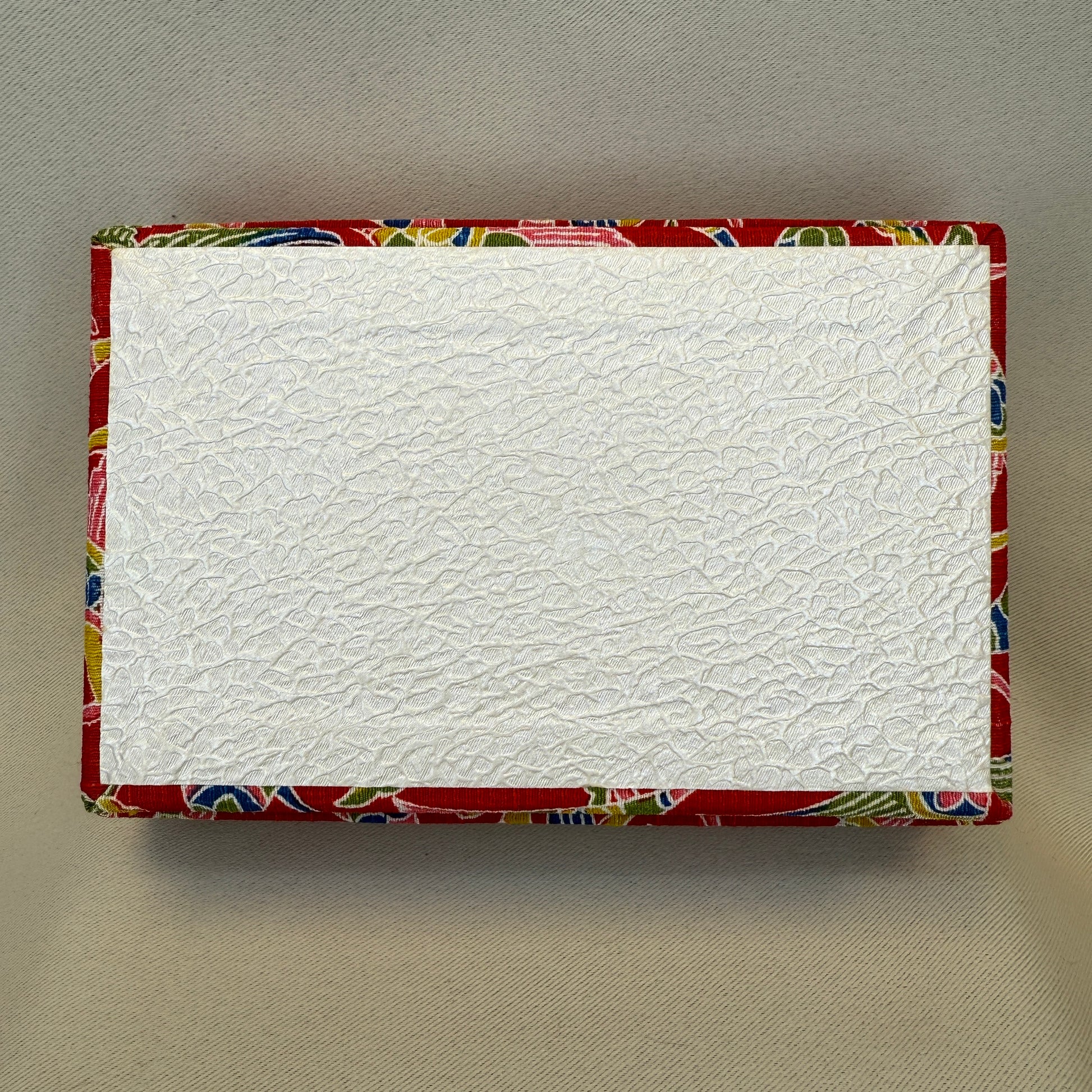Brimming with color and cultural charm, this traditional Japanese somebako box is wrapped in vivid red fabric patterned with stylized cranes or maybe fans. Lots of movement and celebration with bright and bold colors. The interior is paper lined in red making ideal for keepsakes, jewelry, or small treasures.