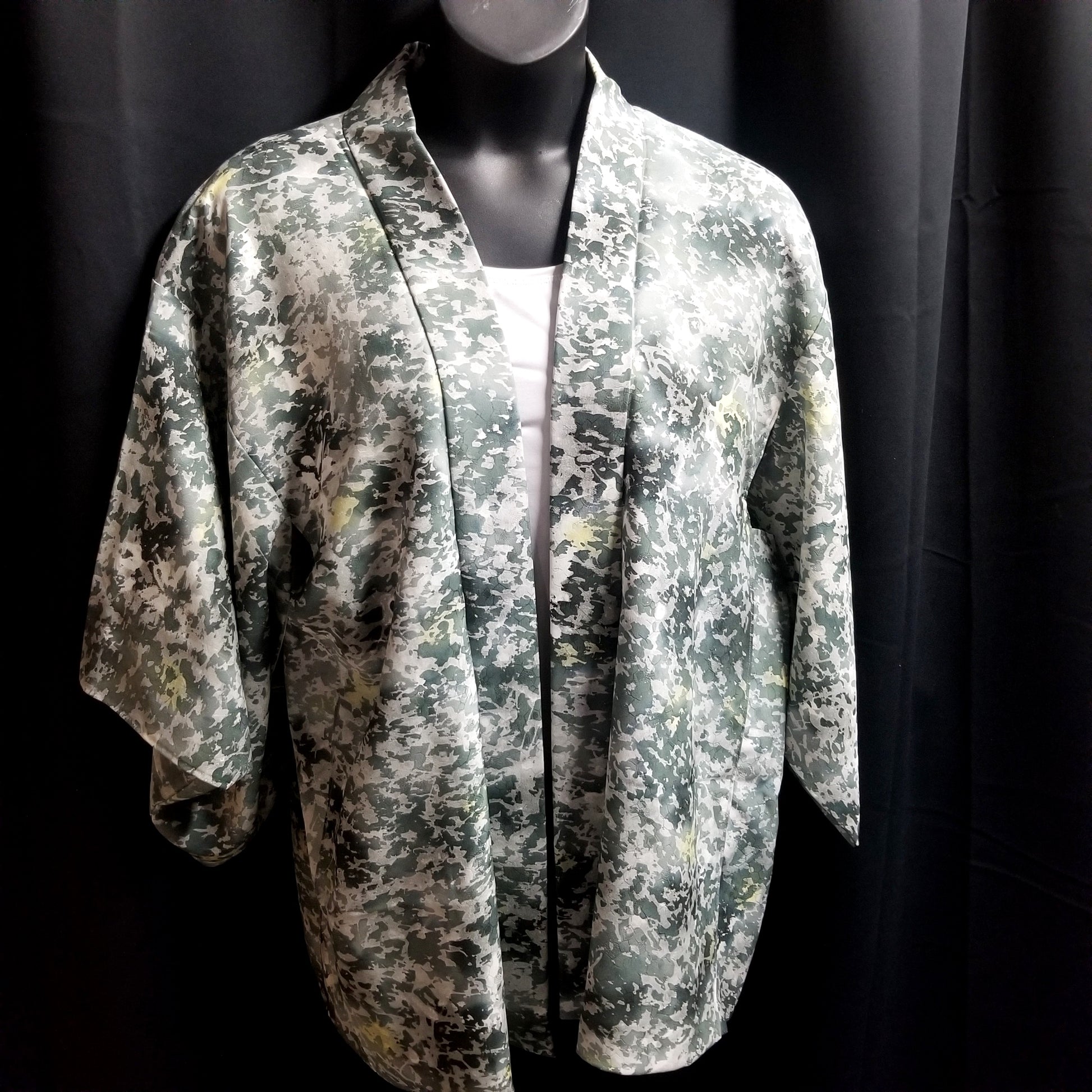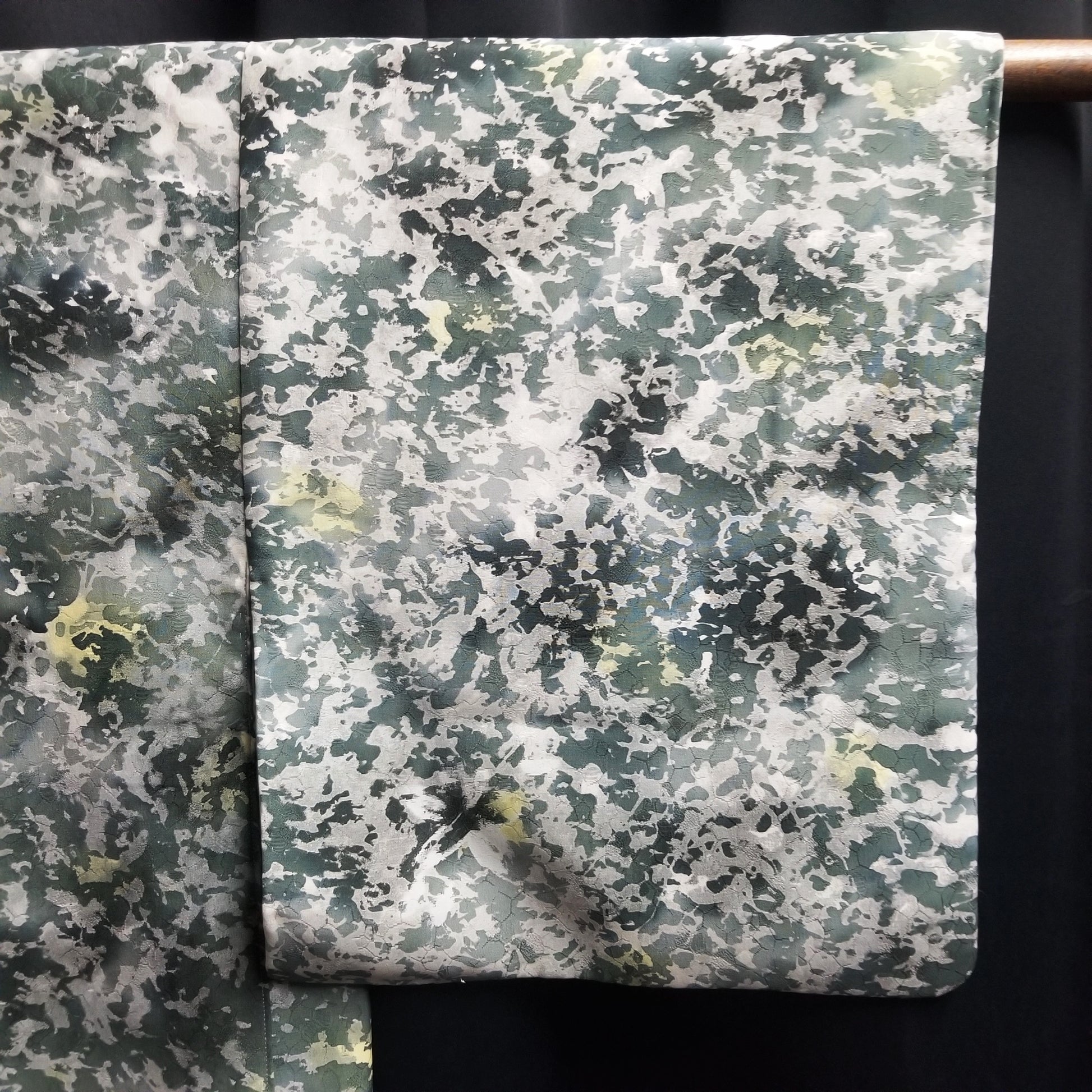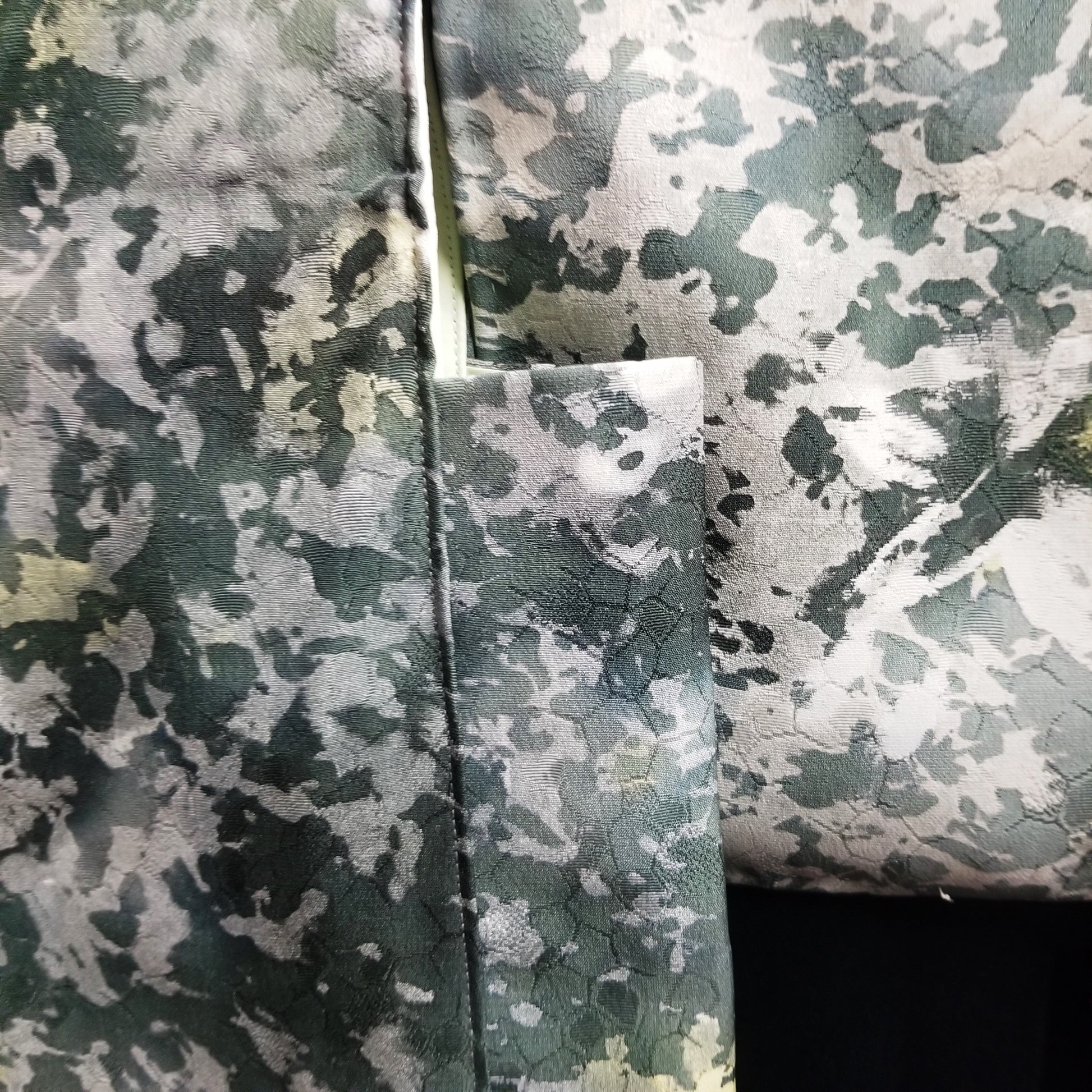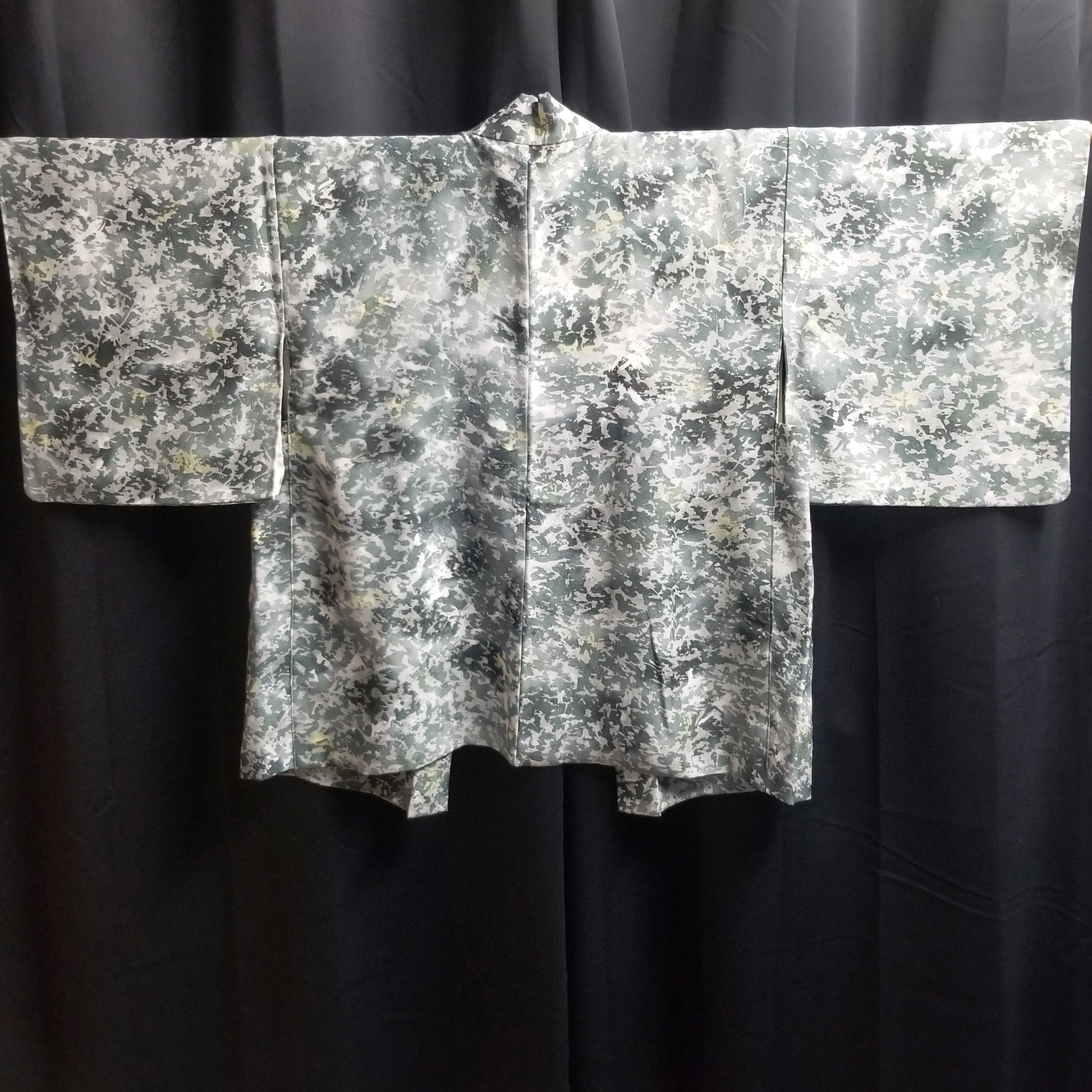 This Oki Haori features a fractured abstract pattern in shades of green with a touch of yellow! Beneath the dyework, the background silk also has a woven geometric design - perhaps honeycomb? - that can be seen when the fabric moves.