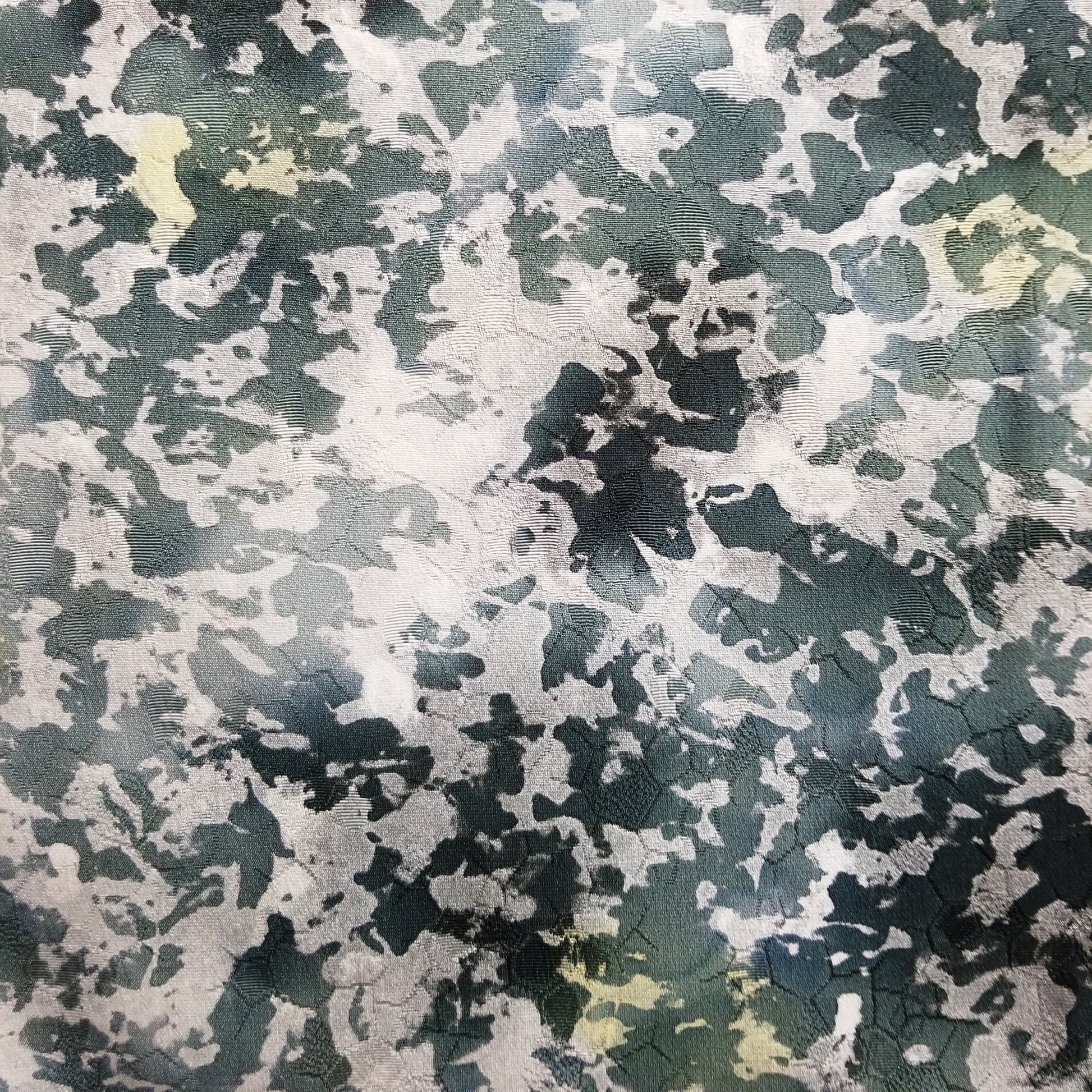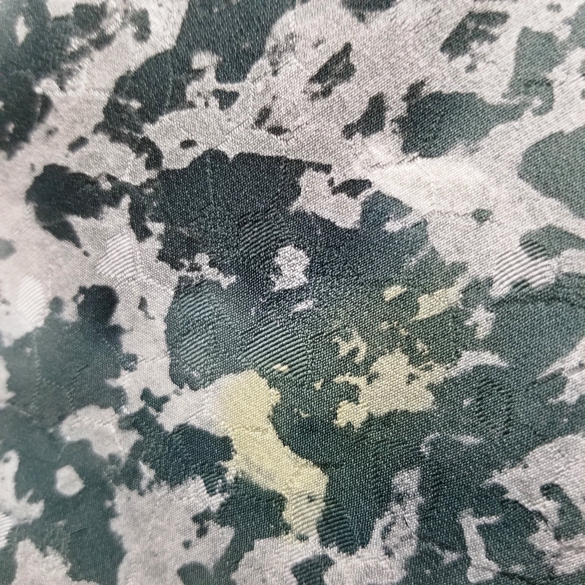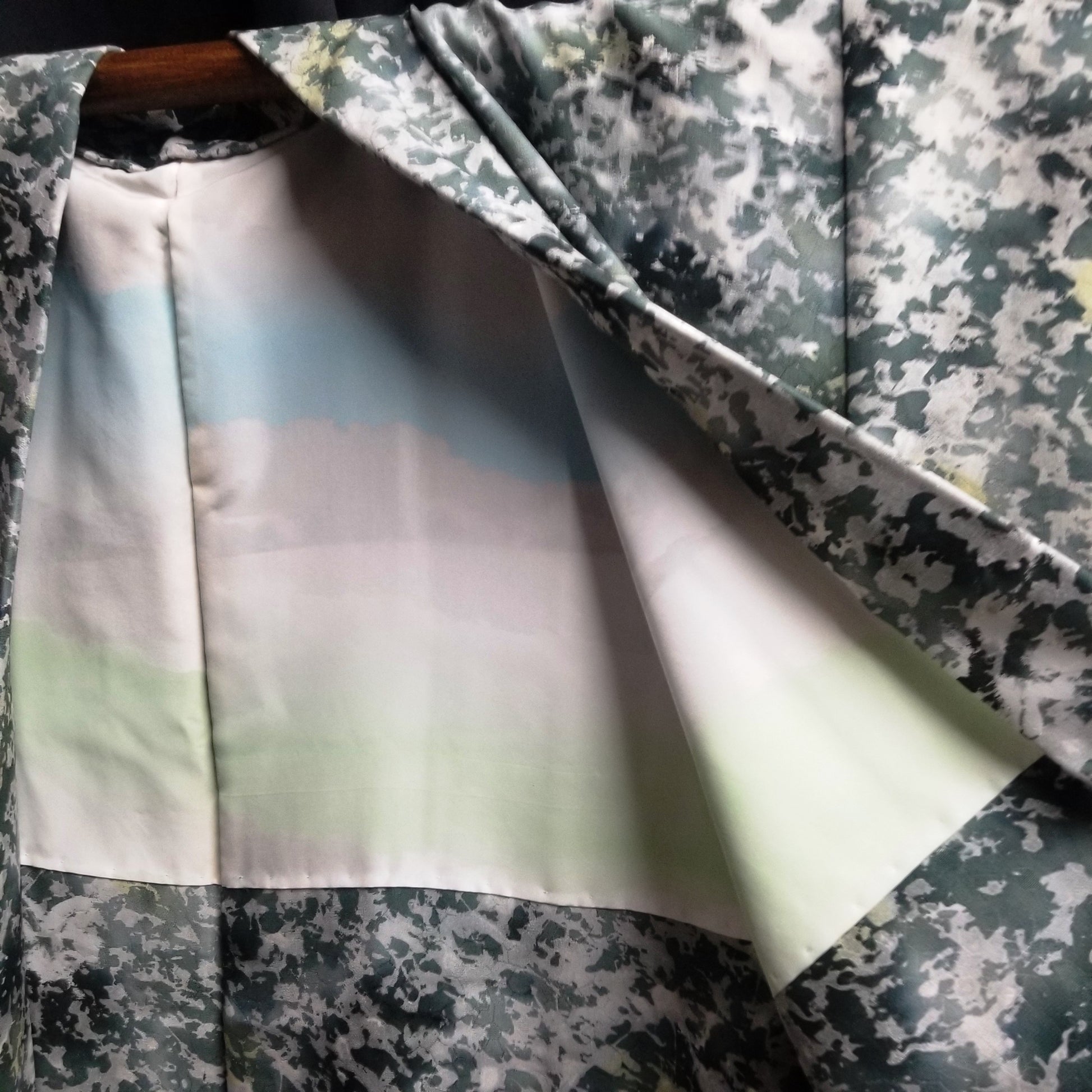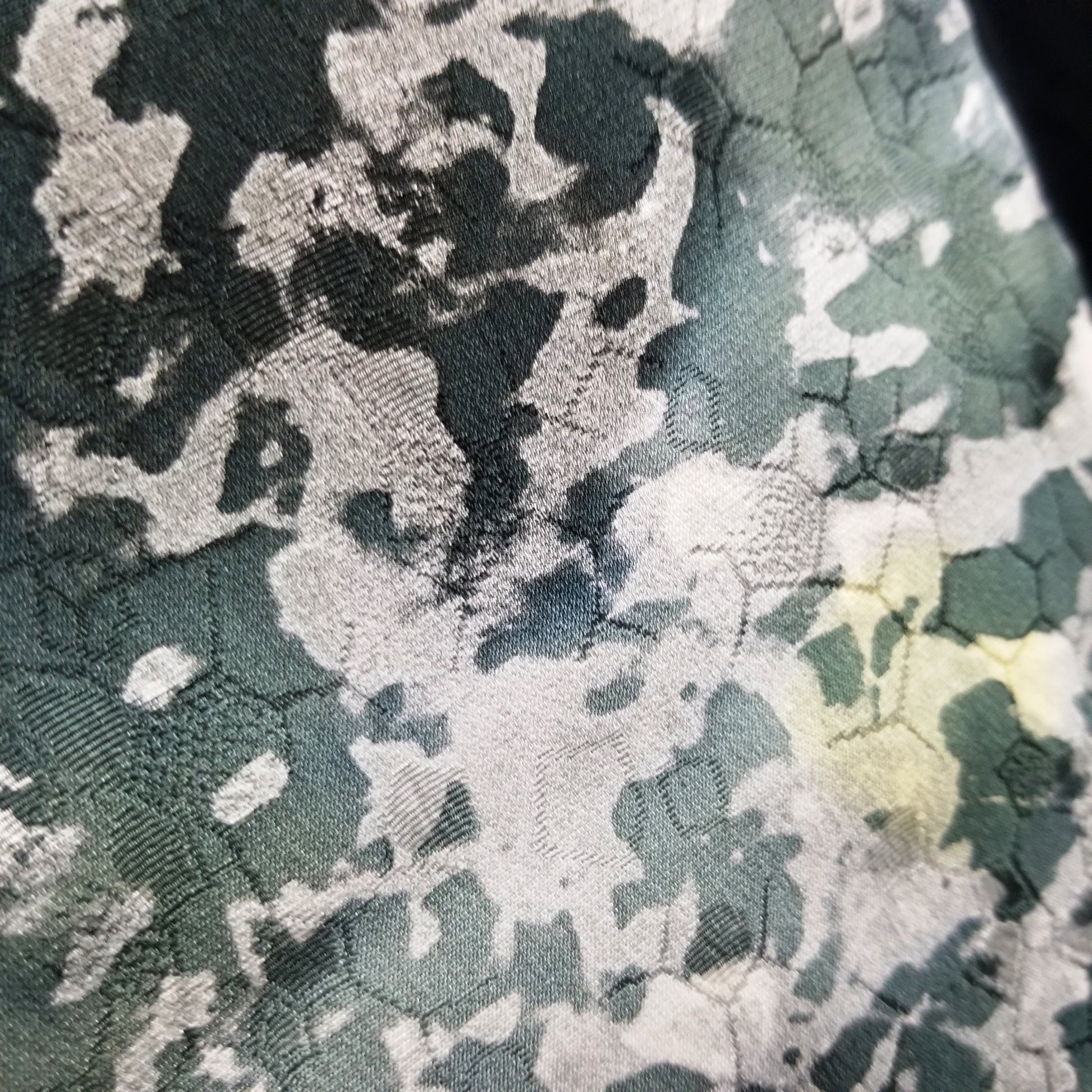 This Oki Haori features a fractured abstract pattern in shades of green with a touch of yellow! Beneath the dyework, the background silk also has a woven geometric design - perhaps honeycomb? - that can be seen when the fabric moves.