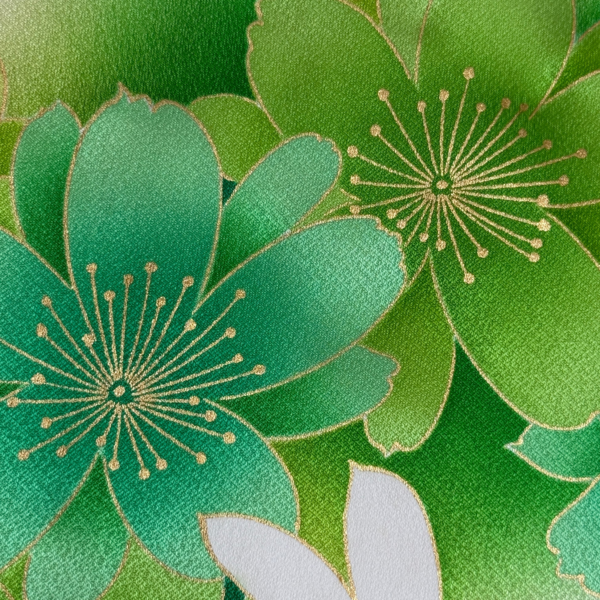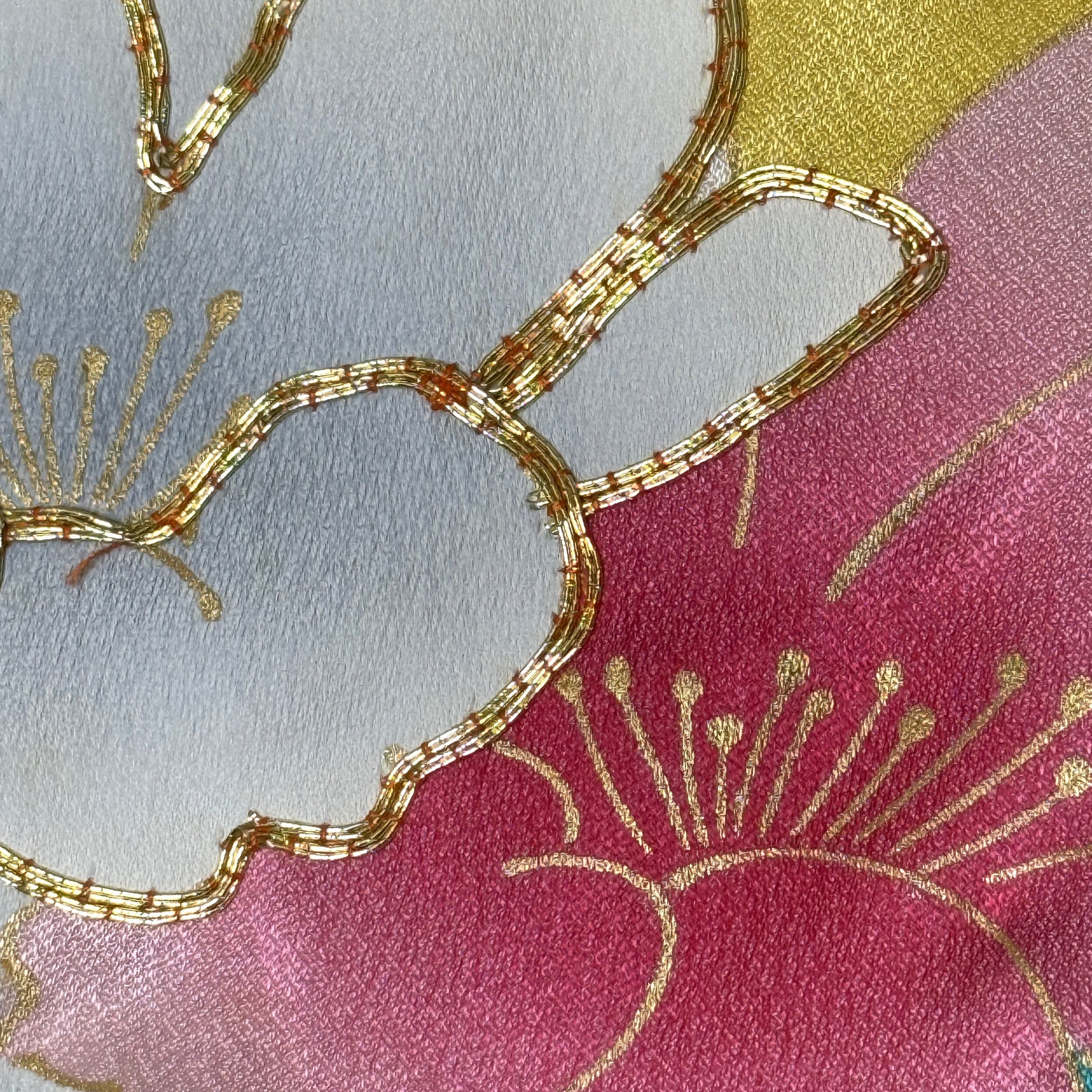 Fresh, luminous, and full of life, this vintage furisode kimono blooms across a soft cream silk background with sweeping clusters of seasonal flowers that seem to float in the air. Layered sprays of florals mingle with tender foliage, rendered in vivid greens, blues, yellows, and pinks. Beautiful and vivid shading suggests a garden in bloom after a refreshing spring rain. The design is enhanced with fine couching and subtle gold leaf outlining select petals, adding gentle sparkle and dimension.