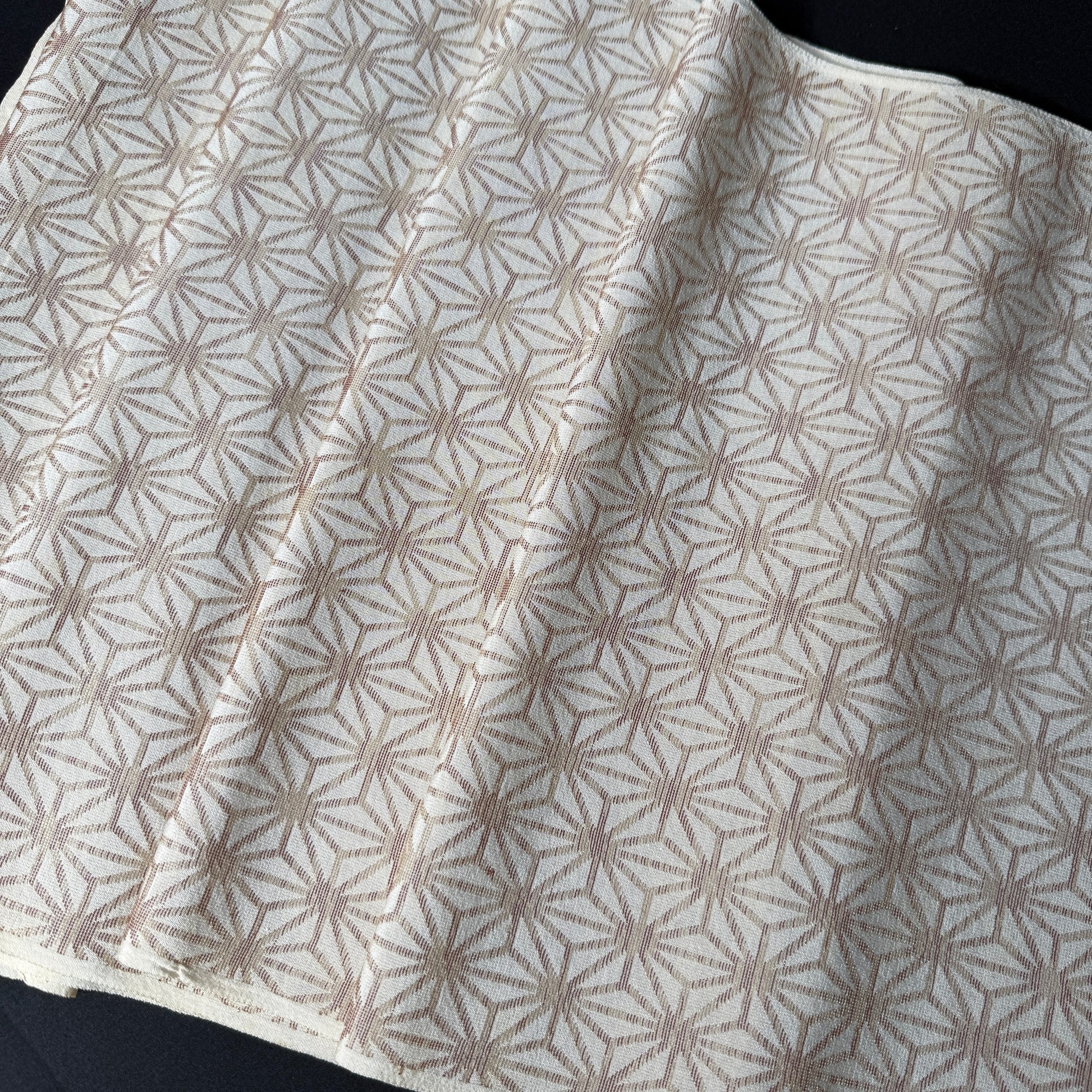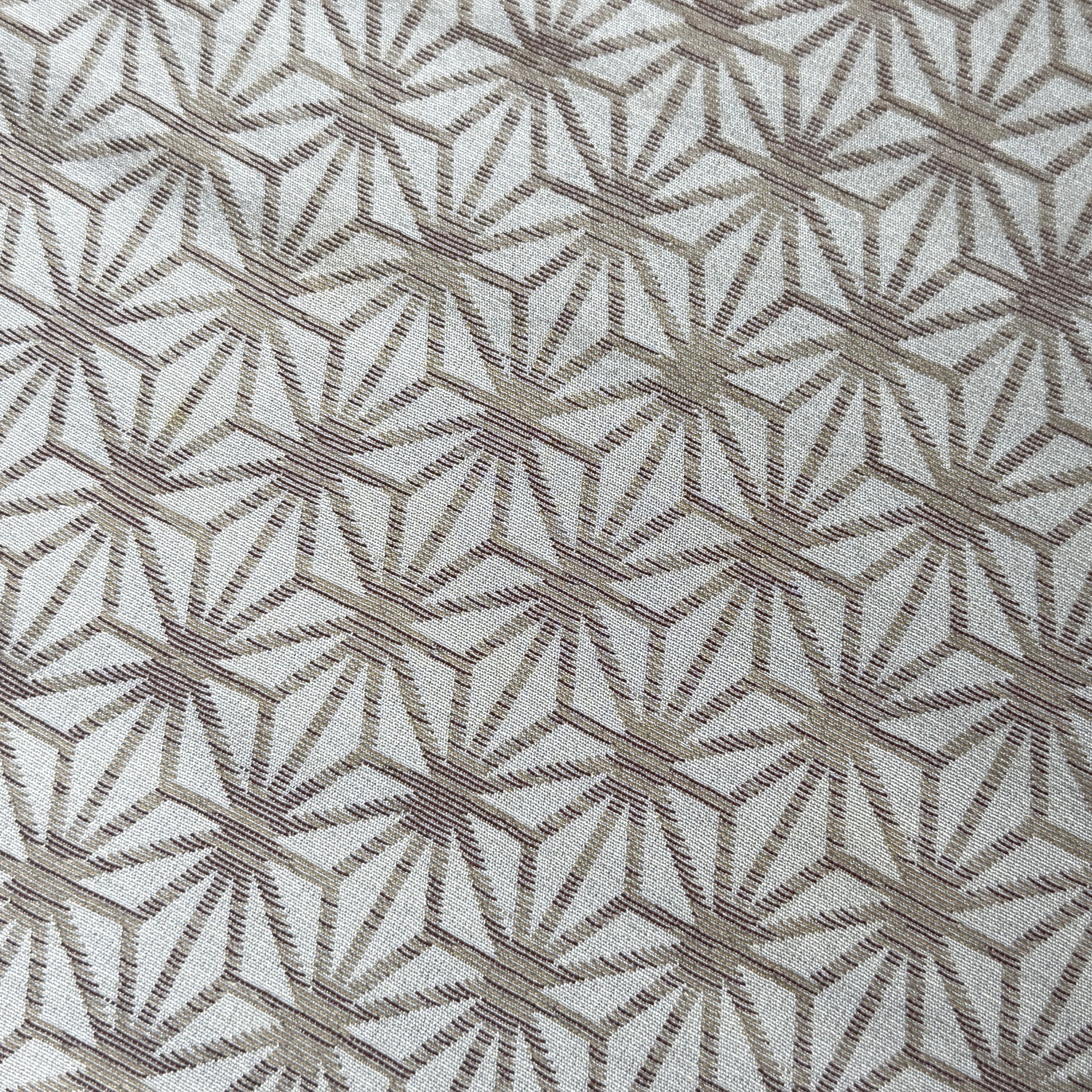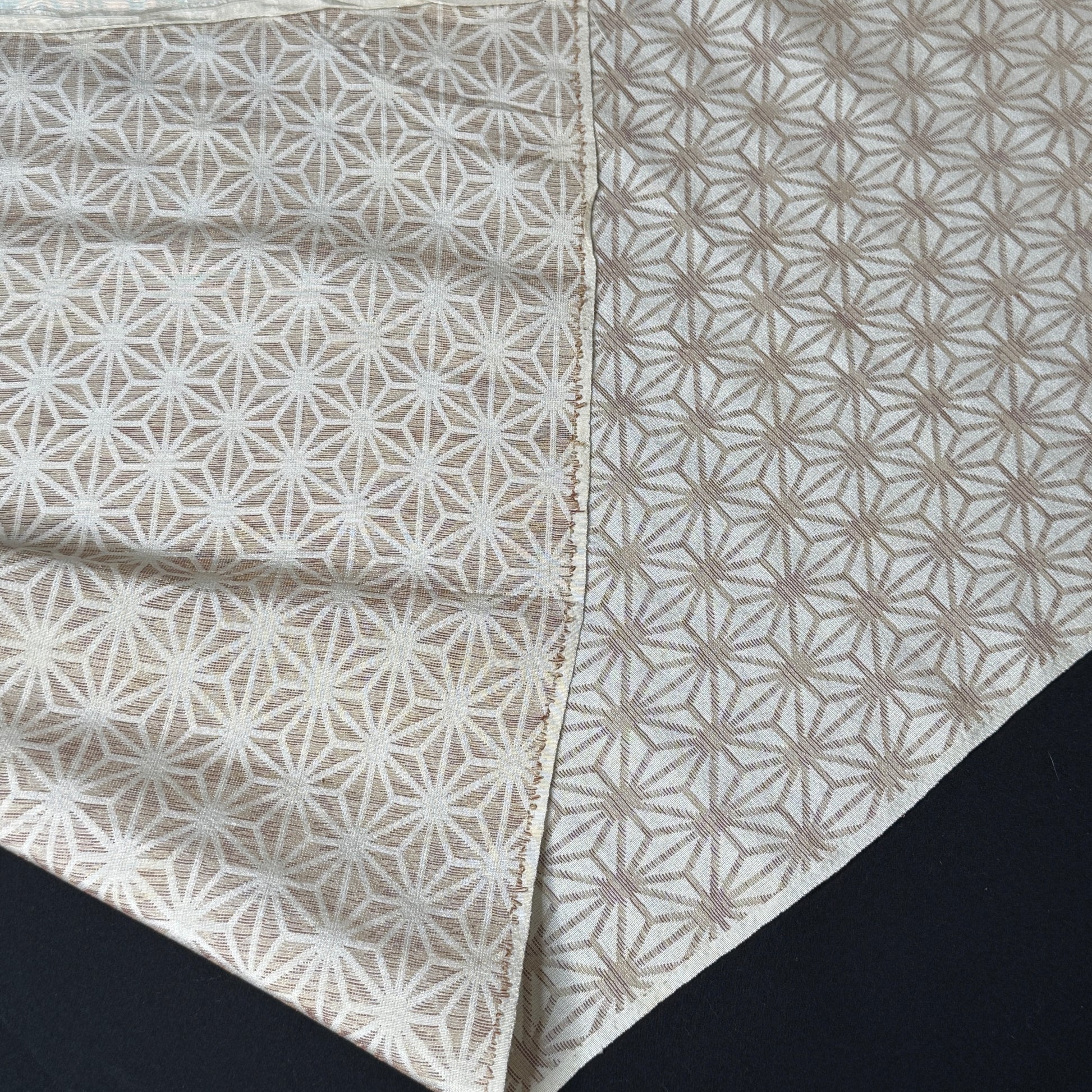 This kimono fabric features the classic asanoha (hemp leaf) motif, a timeless Japanese geometric pattern symbolizing growth, resilience, and protection. Soft beige and golden brown threads are woven to form interlocking star-like shapes. Tradition and elegant minimalism.