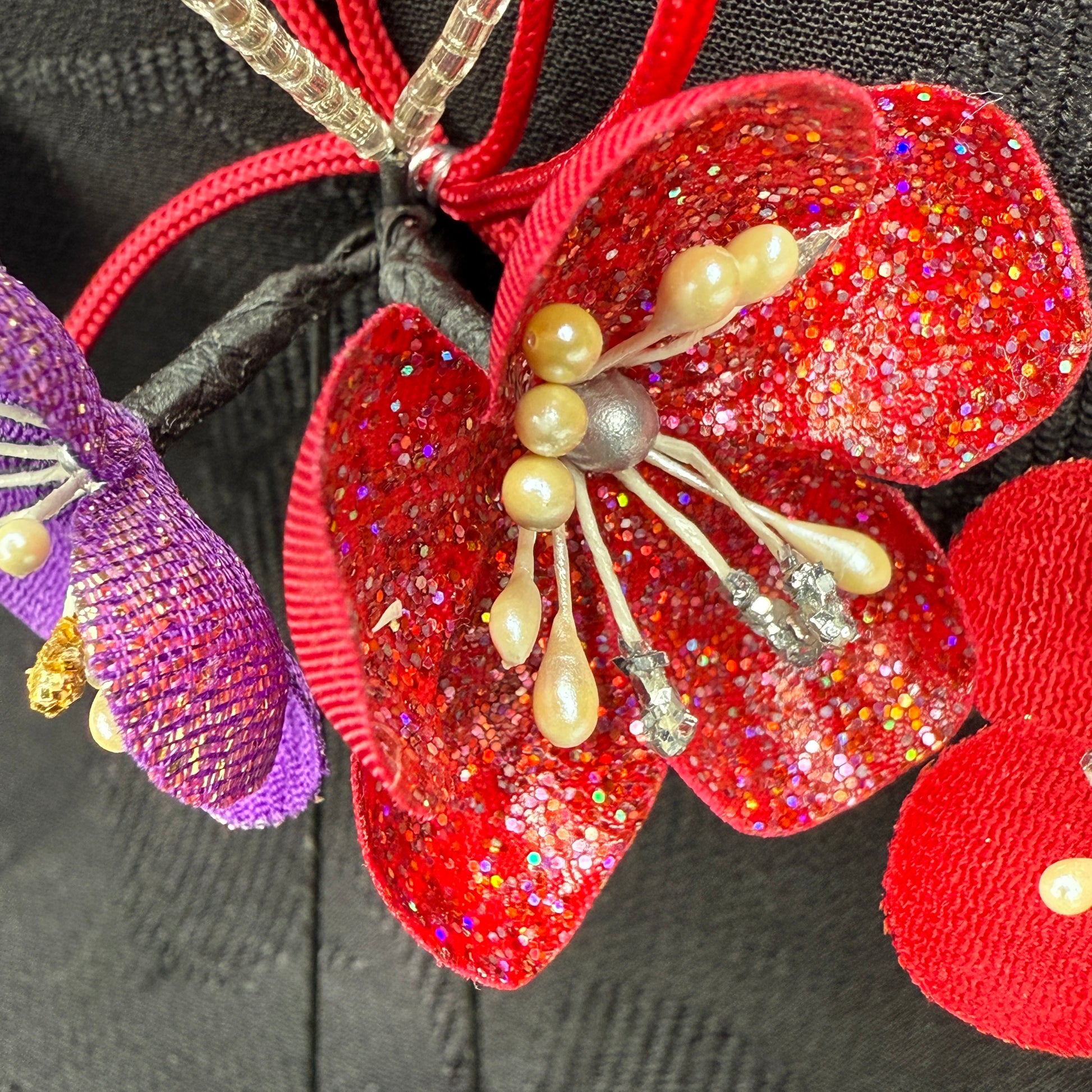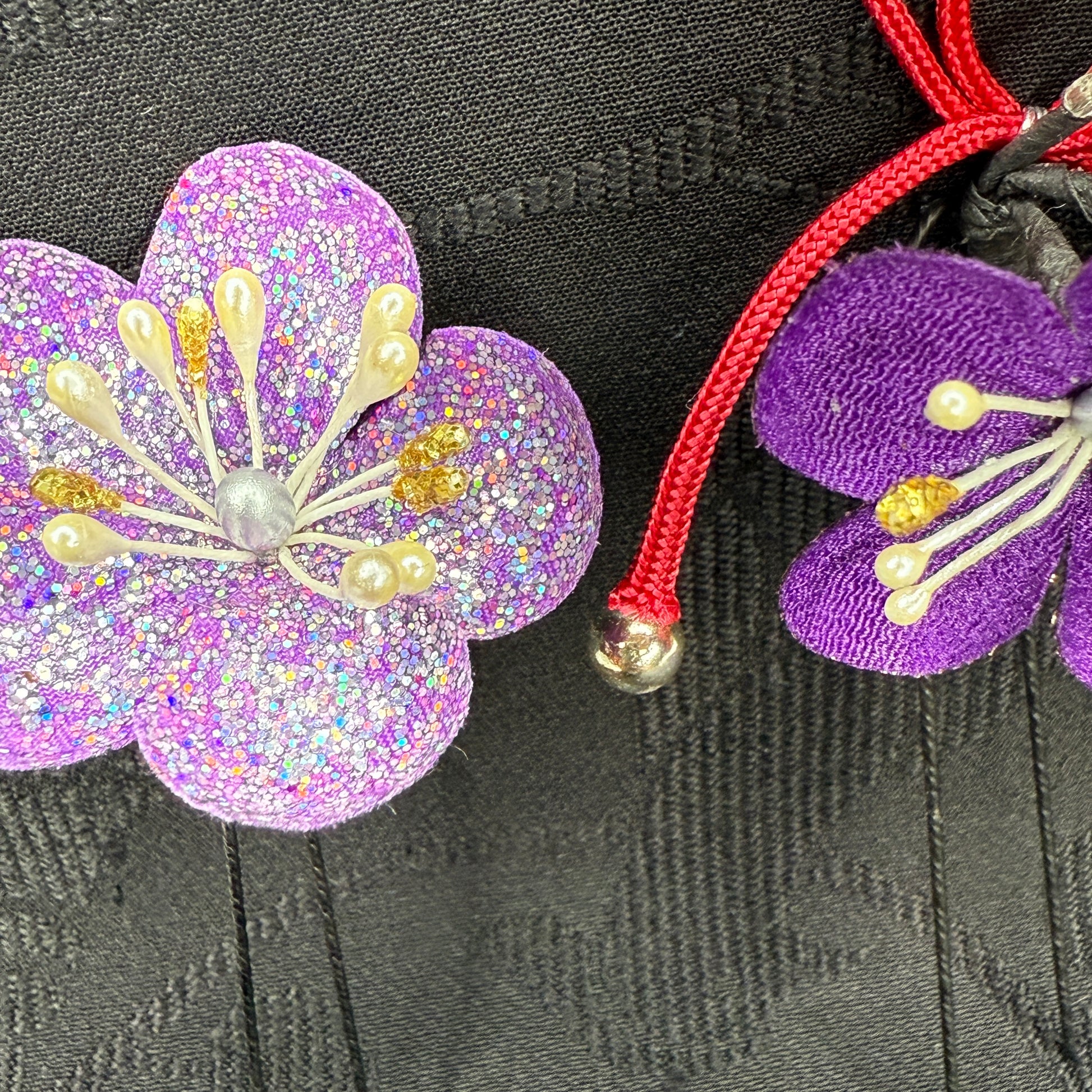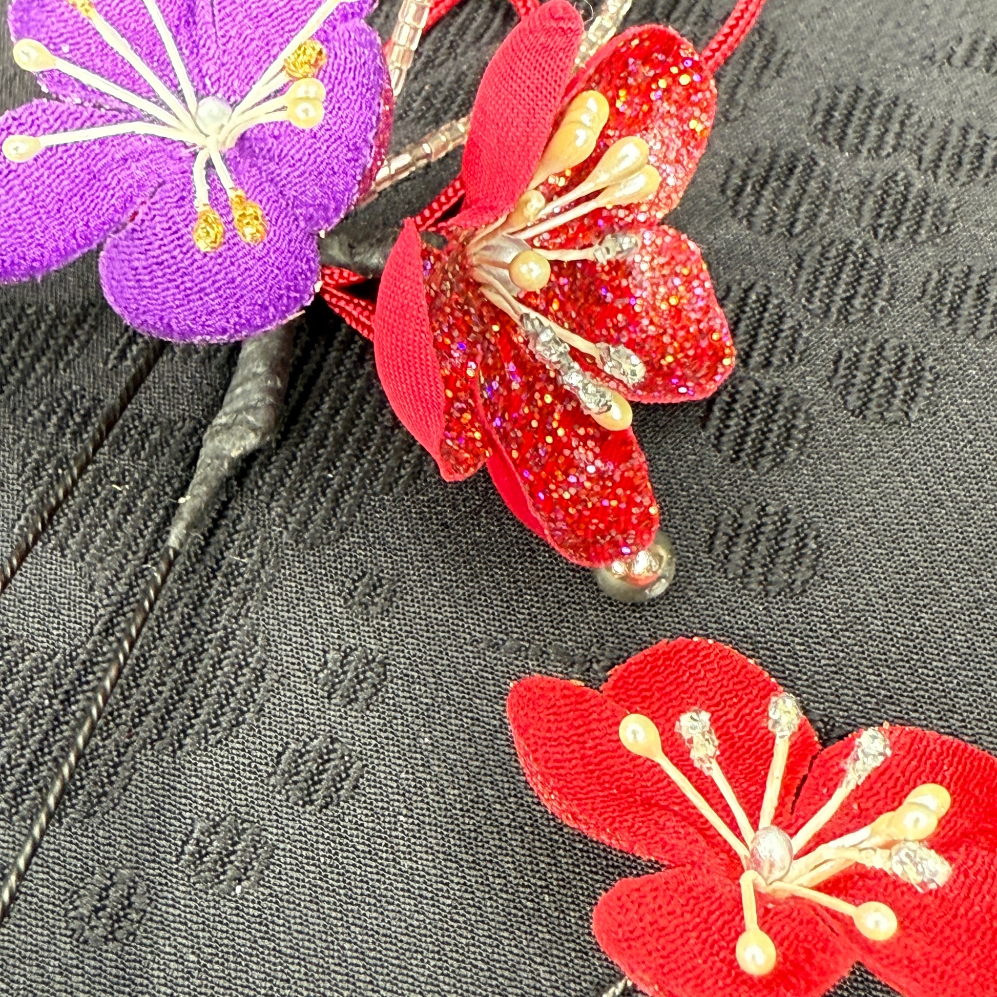 Playful and fun, this trio of vintage Japanese kanzashi hair pins celebrates the timeless beauty of the ume (plum blossoms) which is a symbol of renewal and courage in early Spring. Crafted in vivid red and deep purple fabric, the petals shimmer with fine glitter and pearlescent details that catch the light. Accented with red cords and tiny silver embellishments, each piece adds a festive sparkle reminiscent of matsuri nights and traditional dance performances.