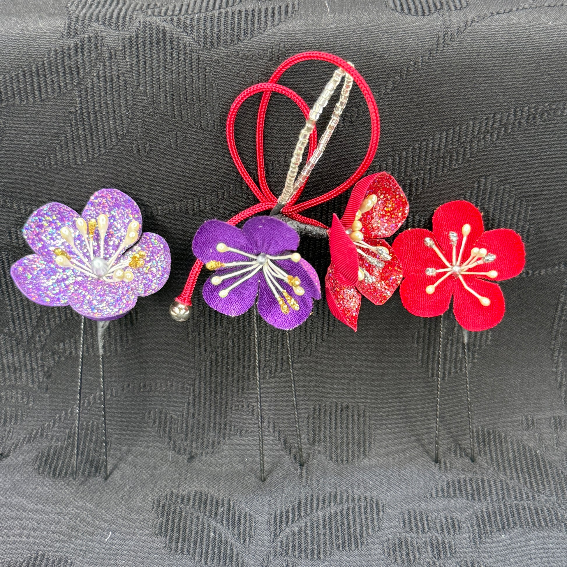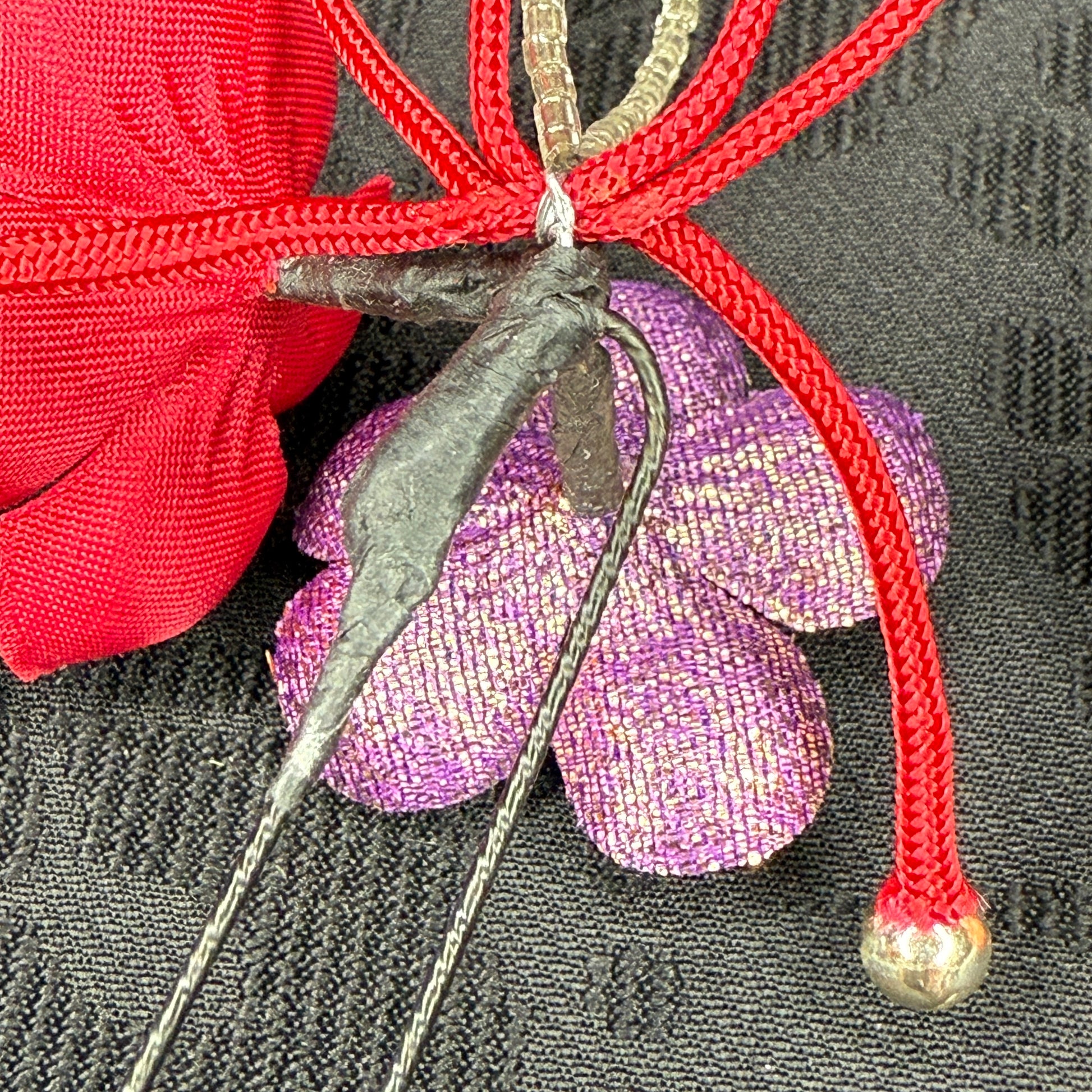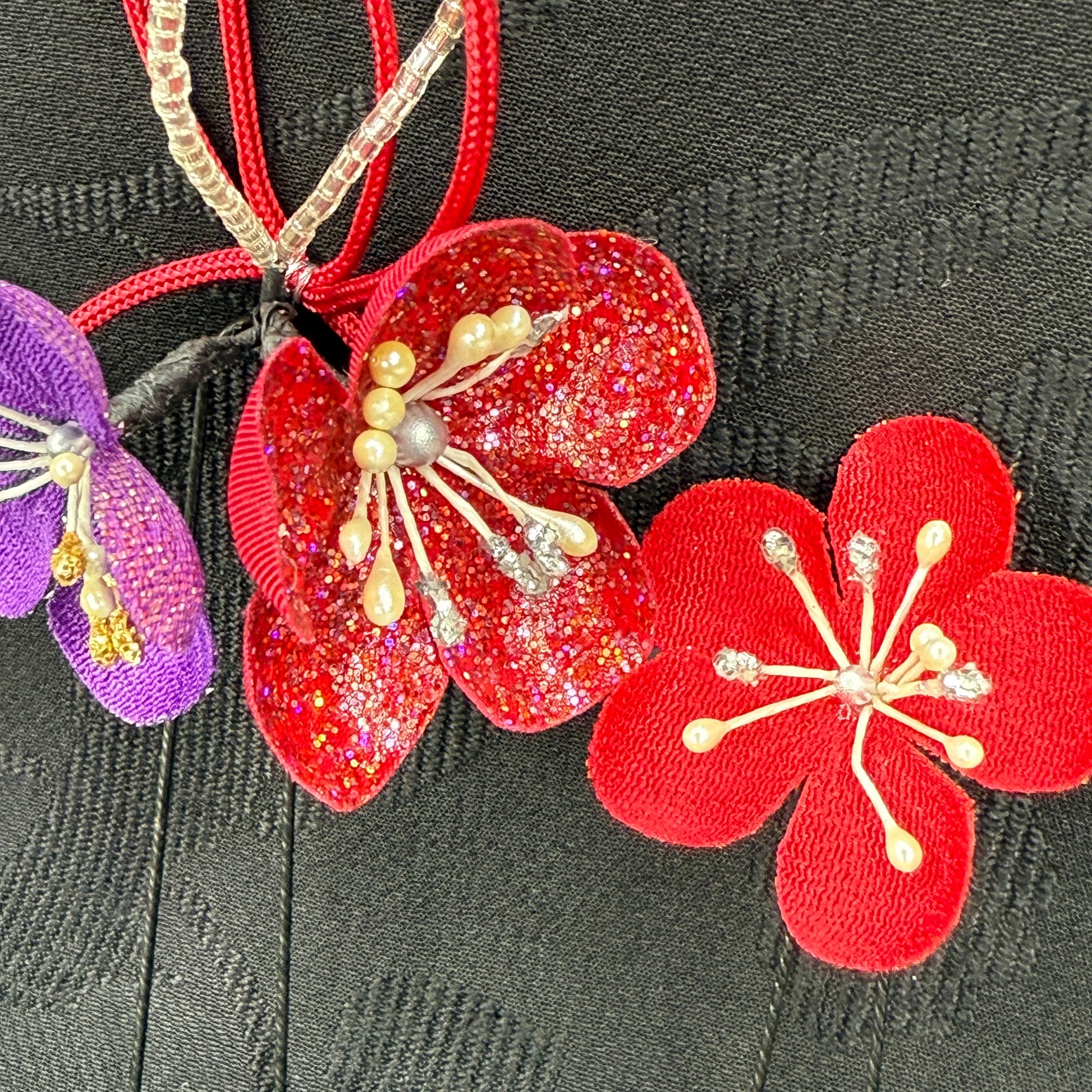 Playful and fun, this trio of vintage Japanese kanzashi hair pins celebrates the timeless beauty of the ume (plum blossoms) which is a symbol of renewal and courage in early Spring. Crafted in vivid red and deep purple fabric, the petals shimmer with fine glitter and pearlescent details that catch the light. Accented with red cords and tiny silver embellishments, each piece adds a festive sparkle reminiscent of matsuri nights and traditional dance performances.
