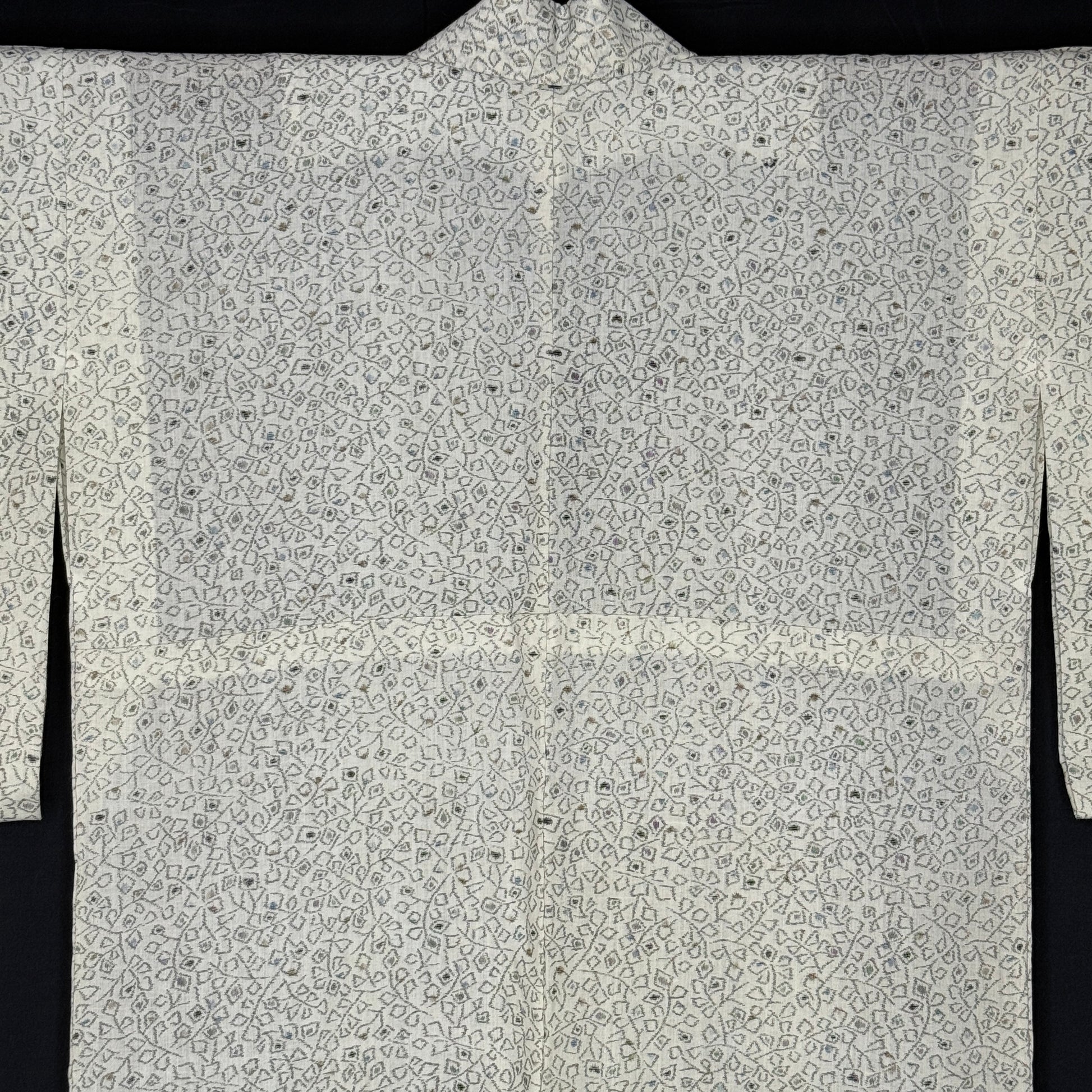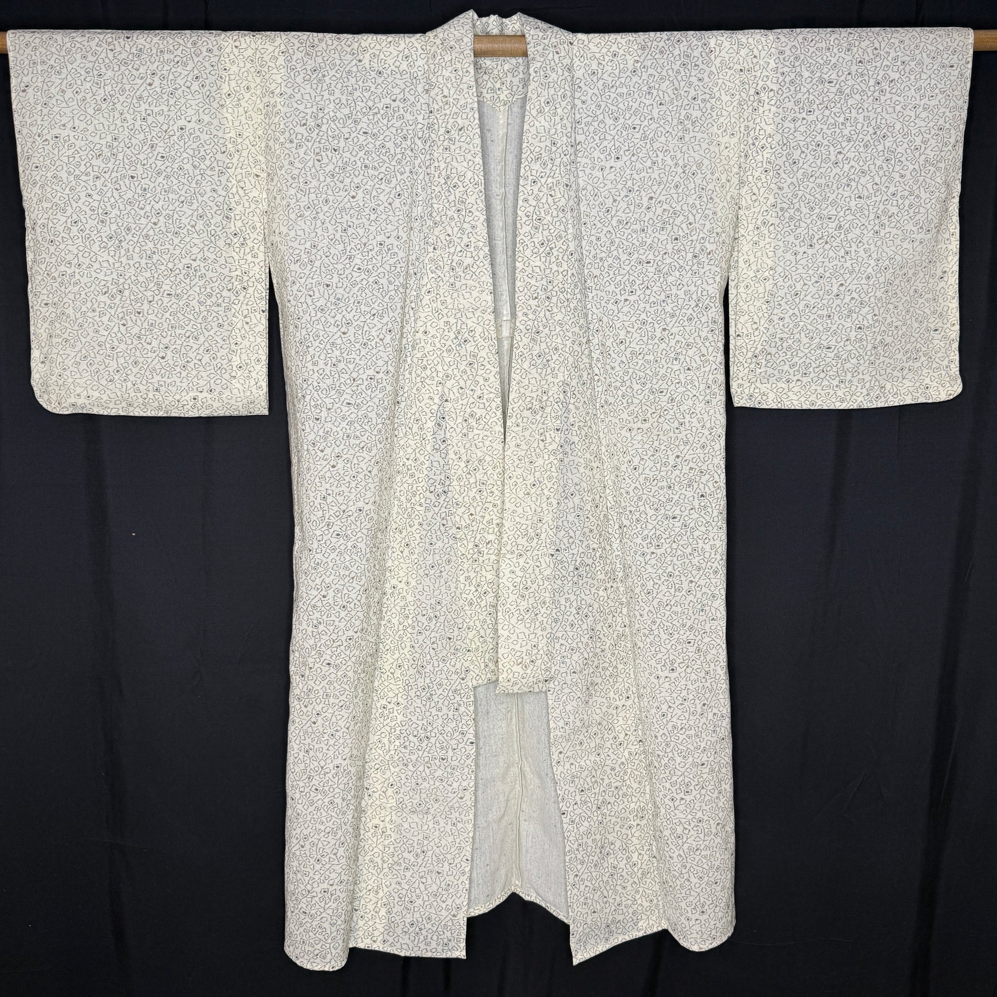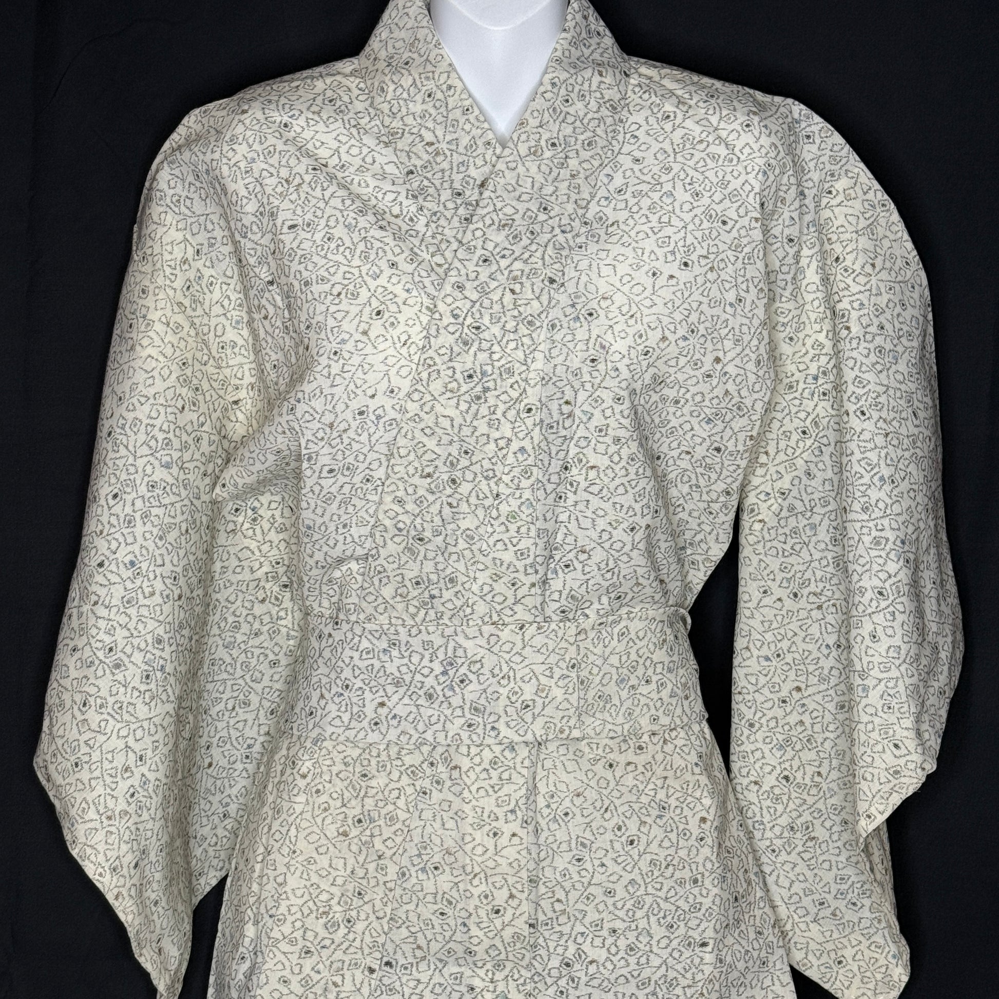 Soft understated colors and effortlessly wearable, this vintage kimono robe showcases a refined allover geometric pattern in neutral tones. The pattern is woven ikat against a cream background and a bit abstract -- a type of blocky foliage or floral. Ikat is a technique where the threads are resist-dyed before weaving, creating softly blurred lines and patterning that has depth and movement.