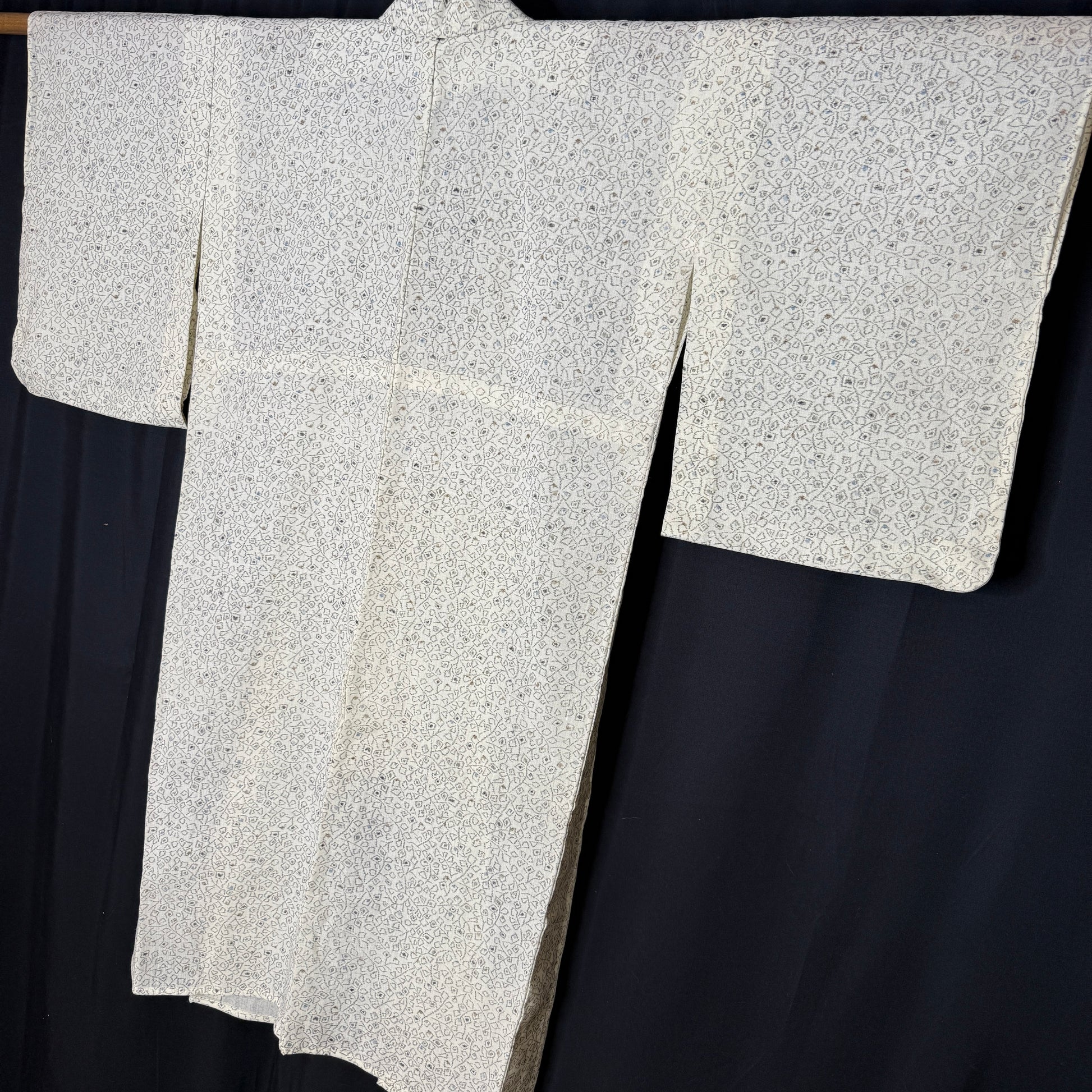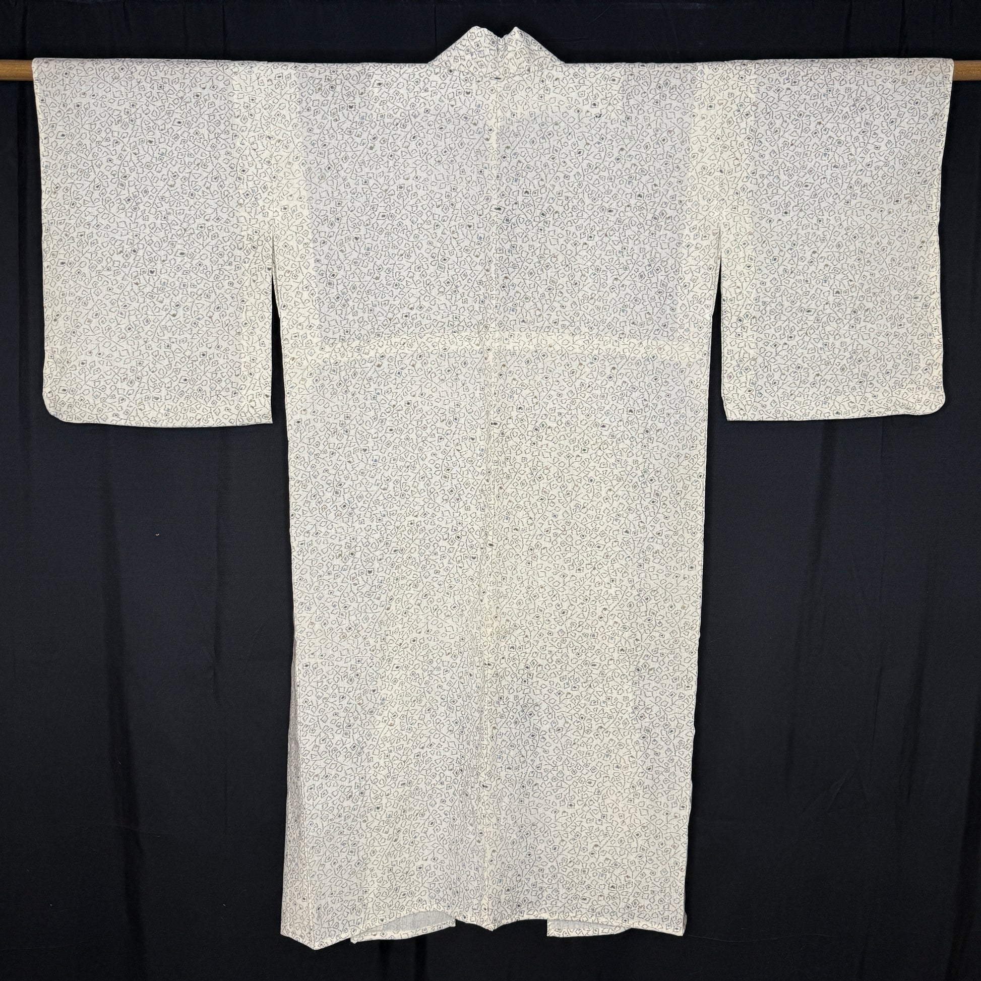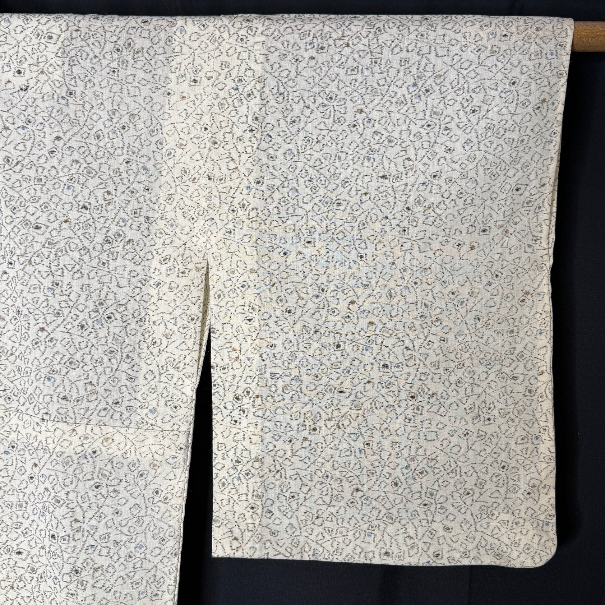 Soft understated colors and effortlessly wearable, this vintage kimono robe showcases a refined allover geometric pattern in neutral tones. The pattern is woven ikat against a cream background and a bit abstract -- a type of blocky foliage or floral. Ikat is a technique where the threads are resist-dyed before weaving, creating softly blurred lines and patterning that has depth and movement.