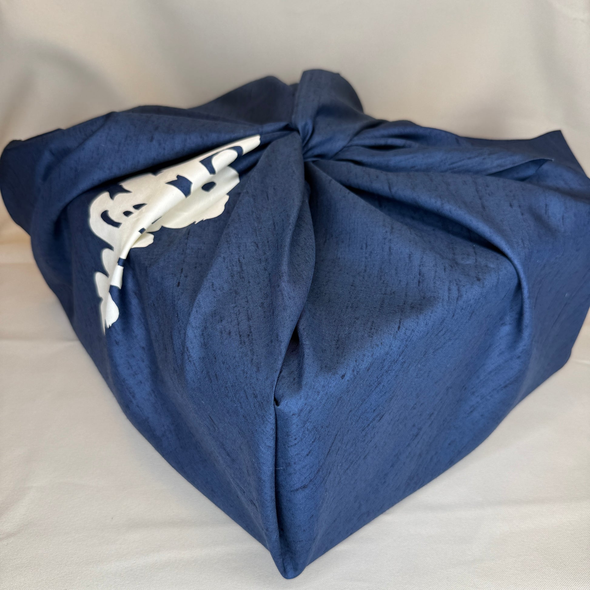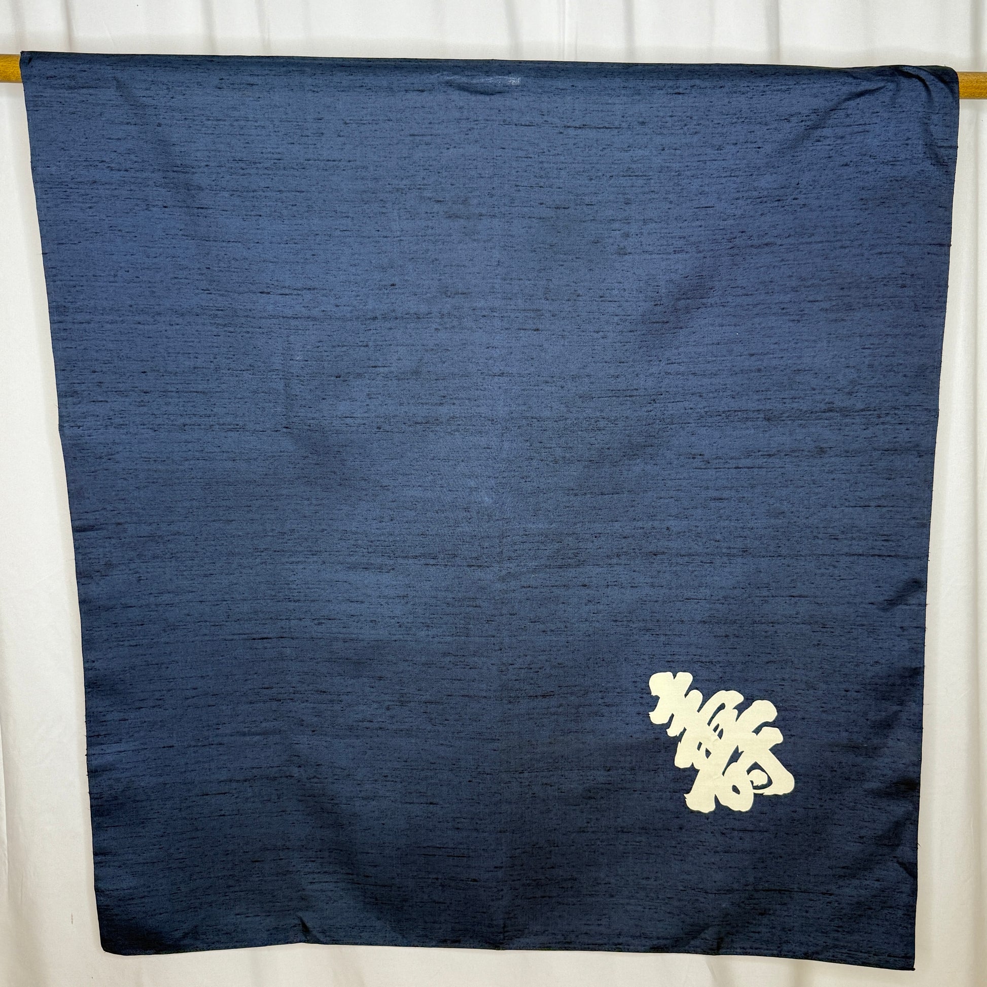 This vintage furoshiki has a bold presence that instantly elevates any gift or display with its deep blue color and dynamic white calligraphic kanji that translates to congratulations or good fortune. The cloth is a nubby silk that drapes beautifully making it perfect for wrapping boxes, bottles, or decor pieces.