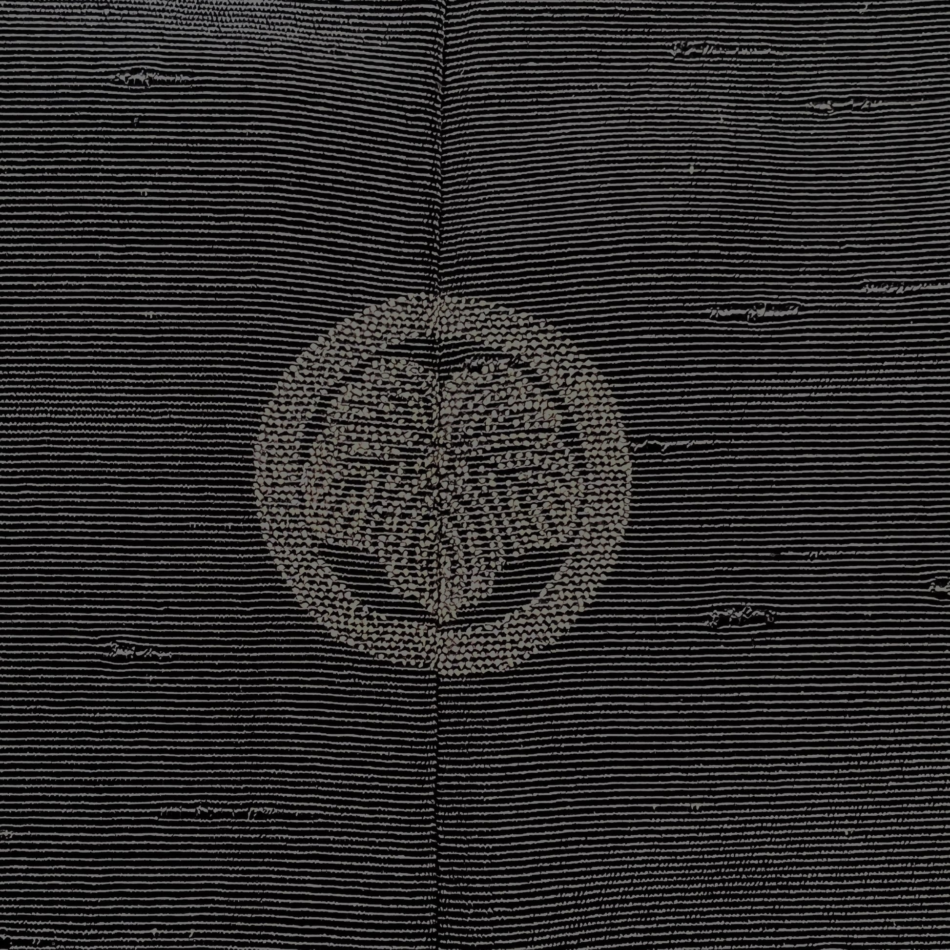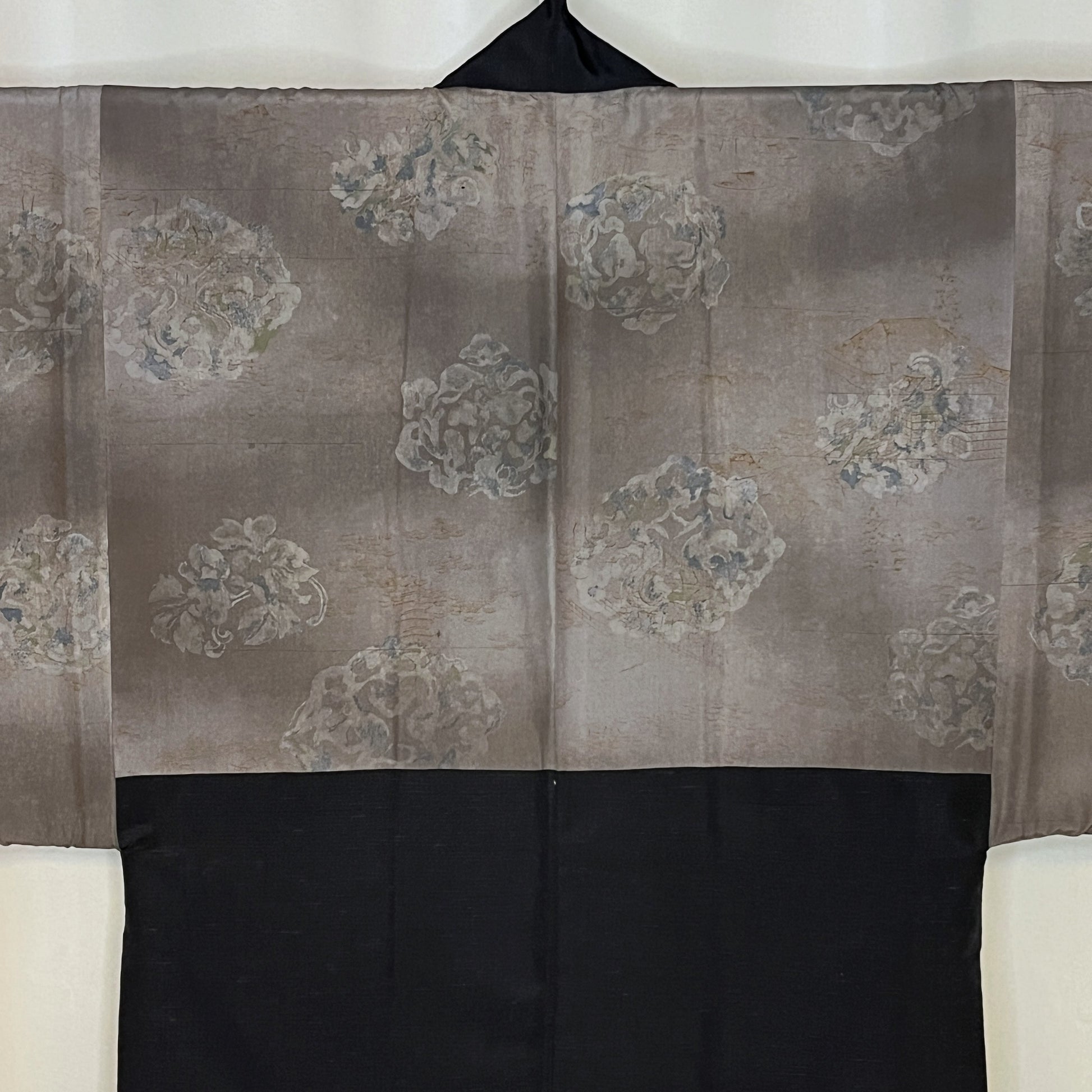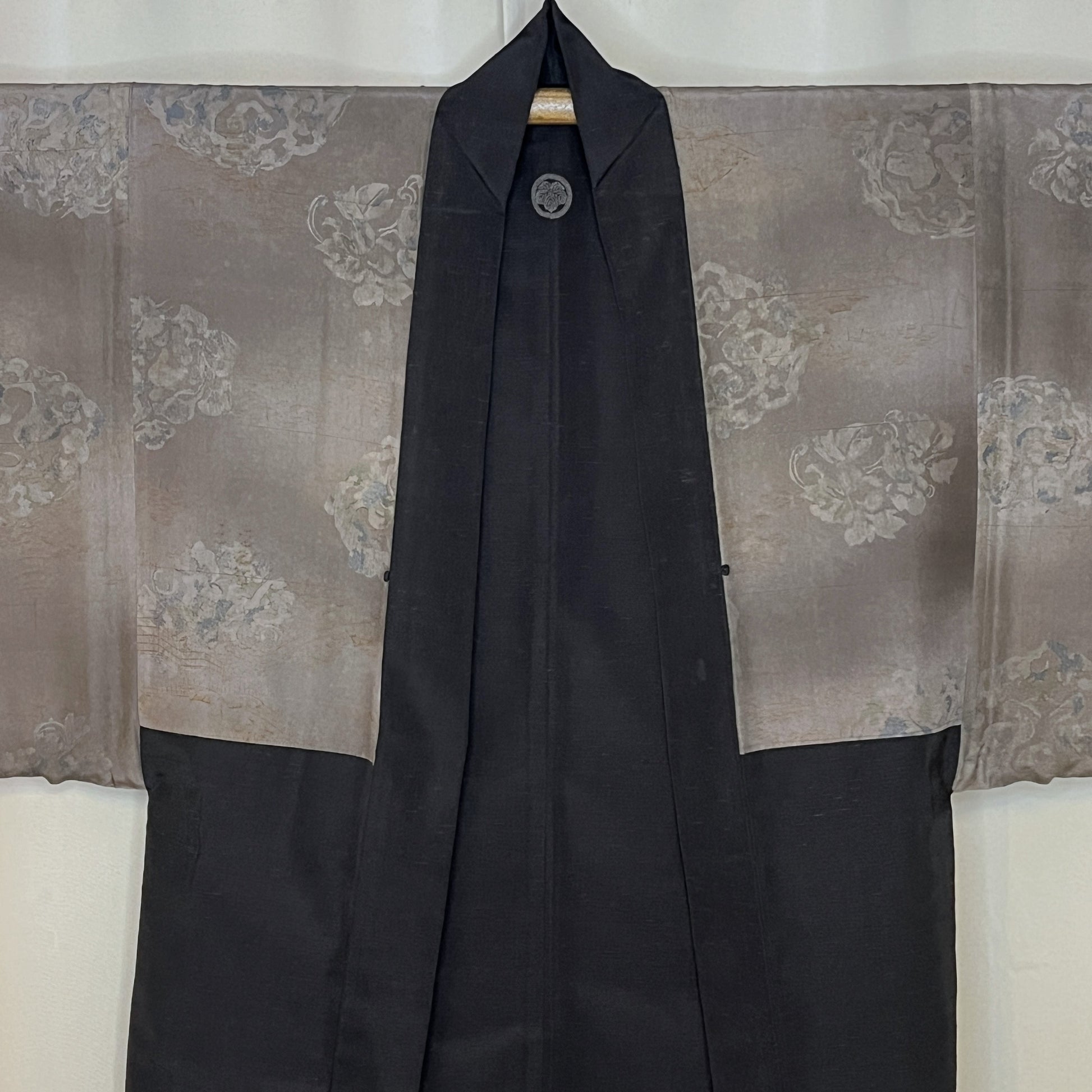 The outer silk is solid black with a heavy nubby texture to weave. A single ivy crest is stenciled at the back neckline.