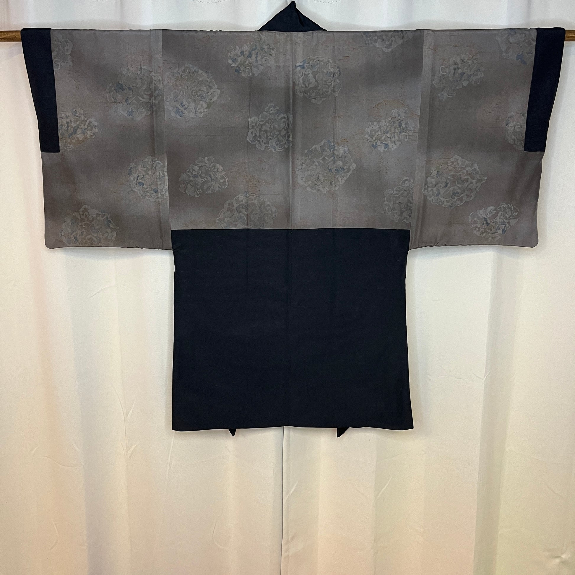 We display these haori inside out to feature the lining when it is unique. All of the stitching is hidden, so these jackets can normally be displayed or worn (in the West, at least) either way.