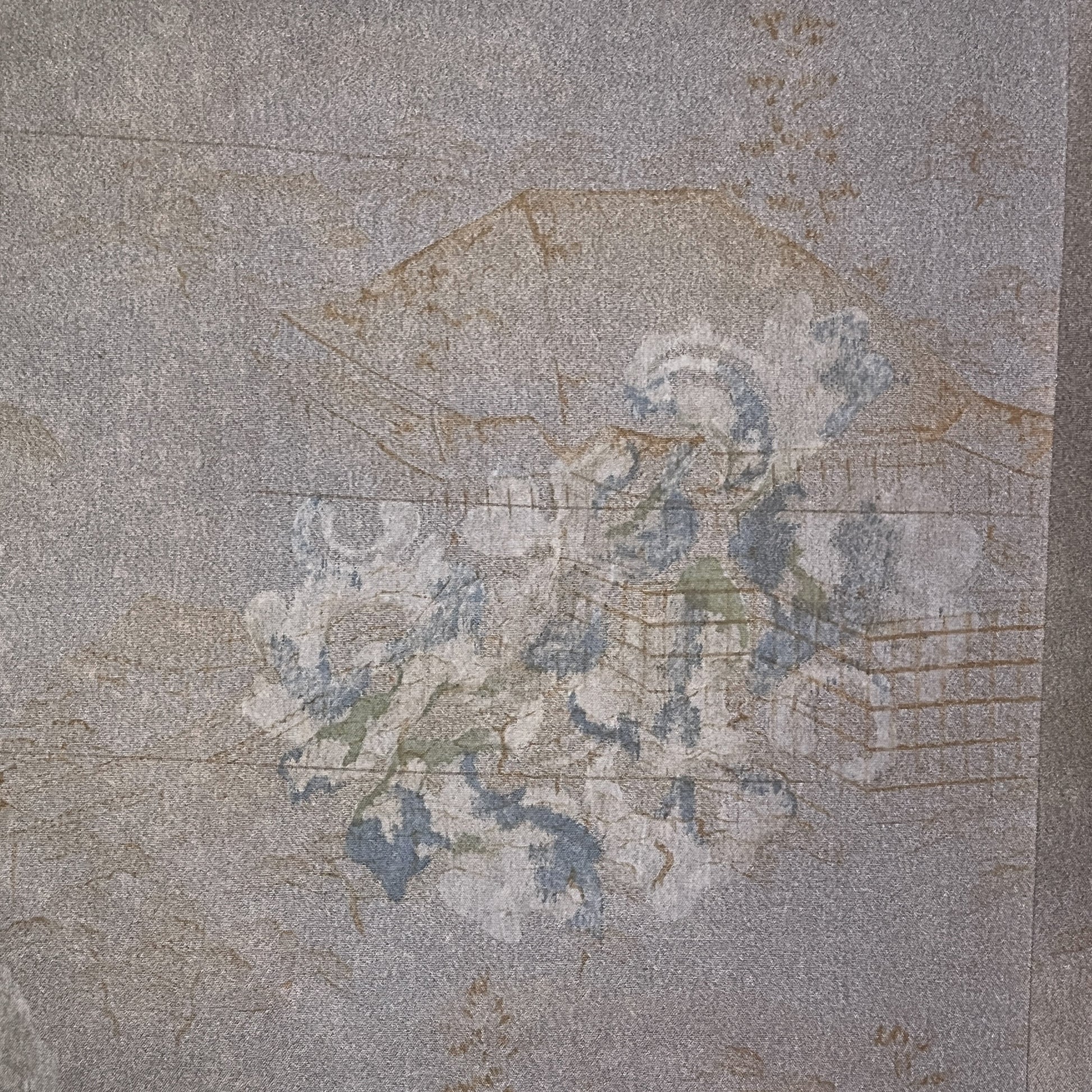 The lining of this man's kimono jacket features a design that you have look at closely to see all the details. From afar you can see the rounded (floral?) wreaths, but a closer look shows that behind them are drawings of what seems to be outlines of pagodas, bridges, huts, and more - almost like a blueprint. Quite unusual.