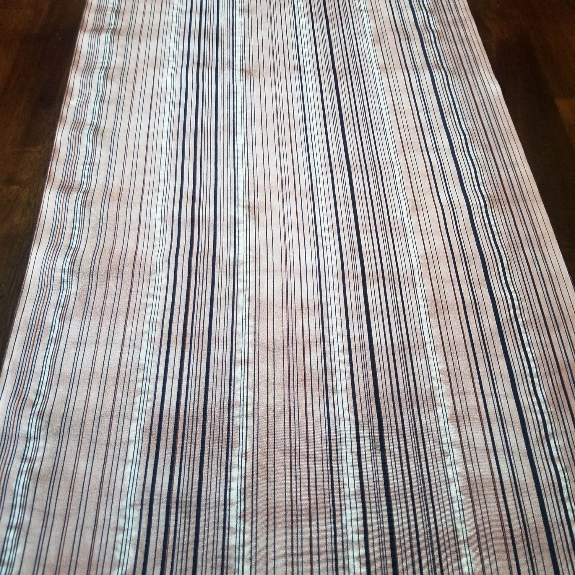 Thin black lines run the length of the fabric, alternating with wider pink and white lines.