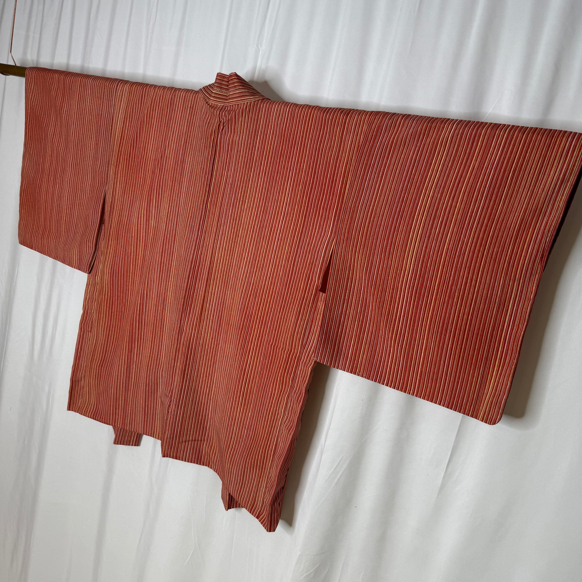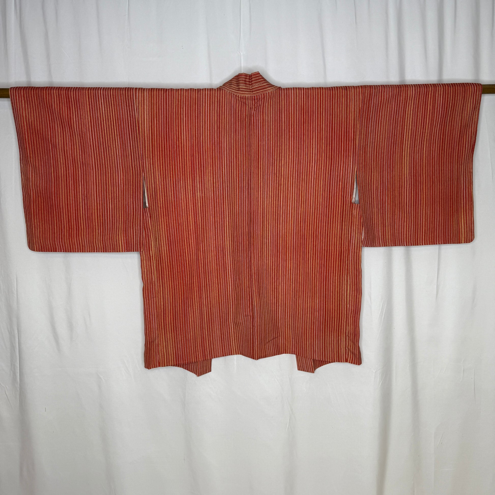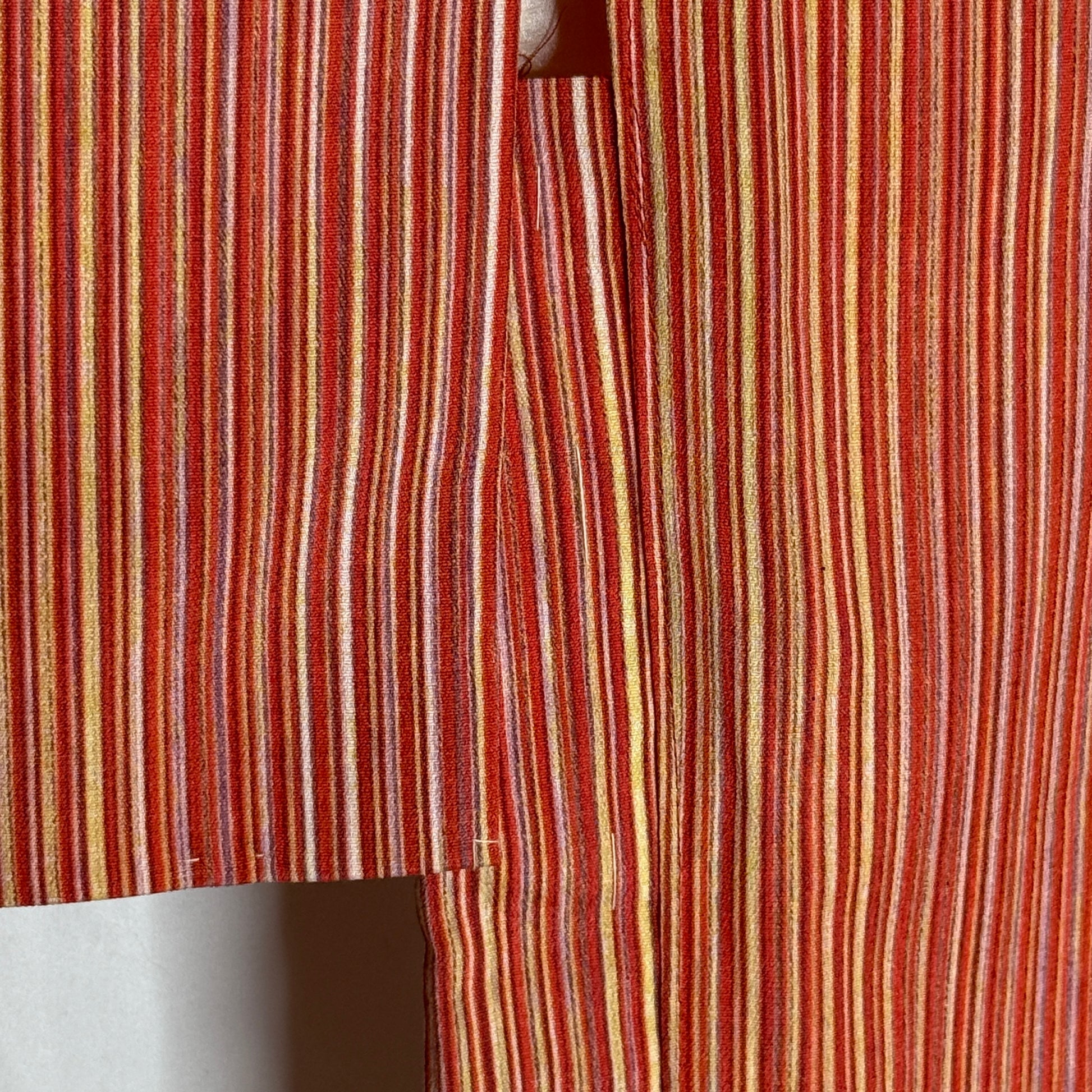This haori jacket features a glowing palette of red, orange, gold, and pink in thin, hand-painted (!) stripes that create a variation of color - like sunrise captured in fabric. The narrow stripes create a rhythmic visual flow that moves beautifully across the body, giving this garment a lively sense of motion while still feeling grounded and cozy. It layers comfortably for everyday wear.