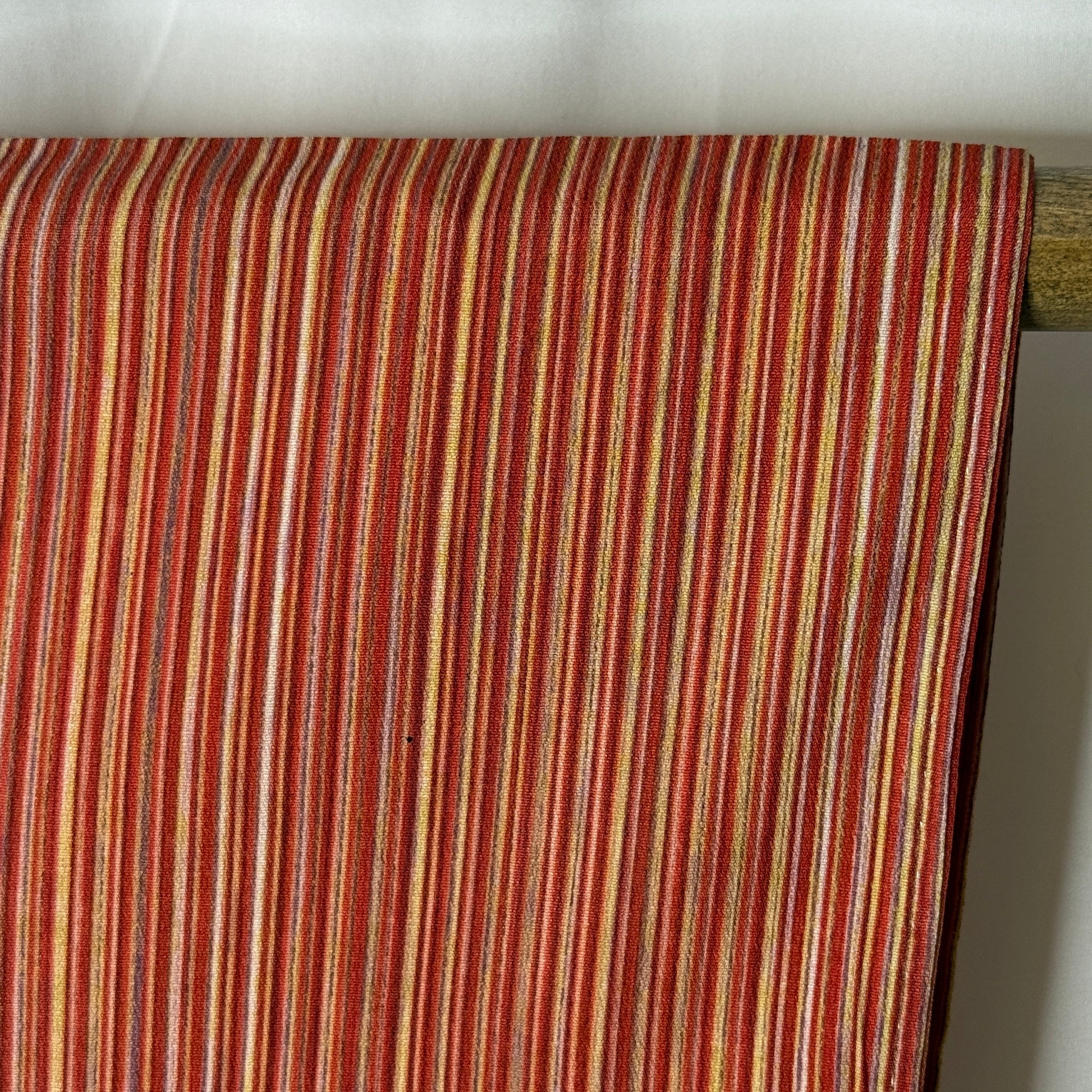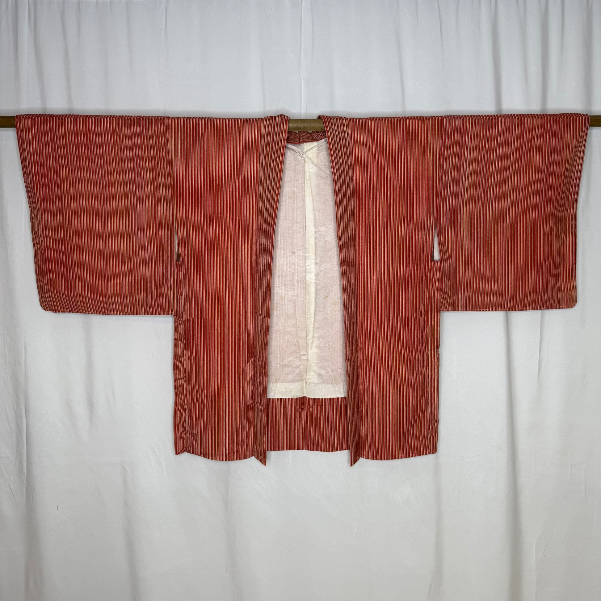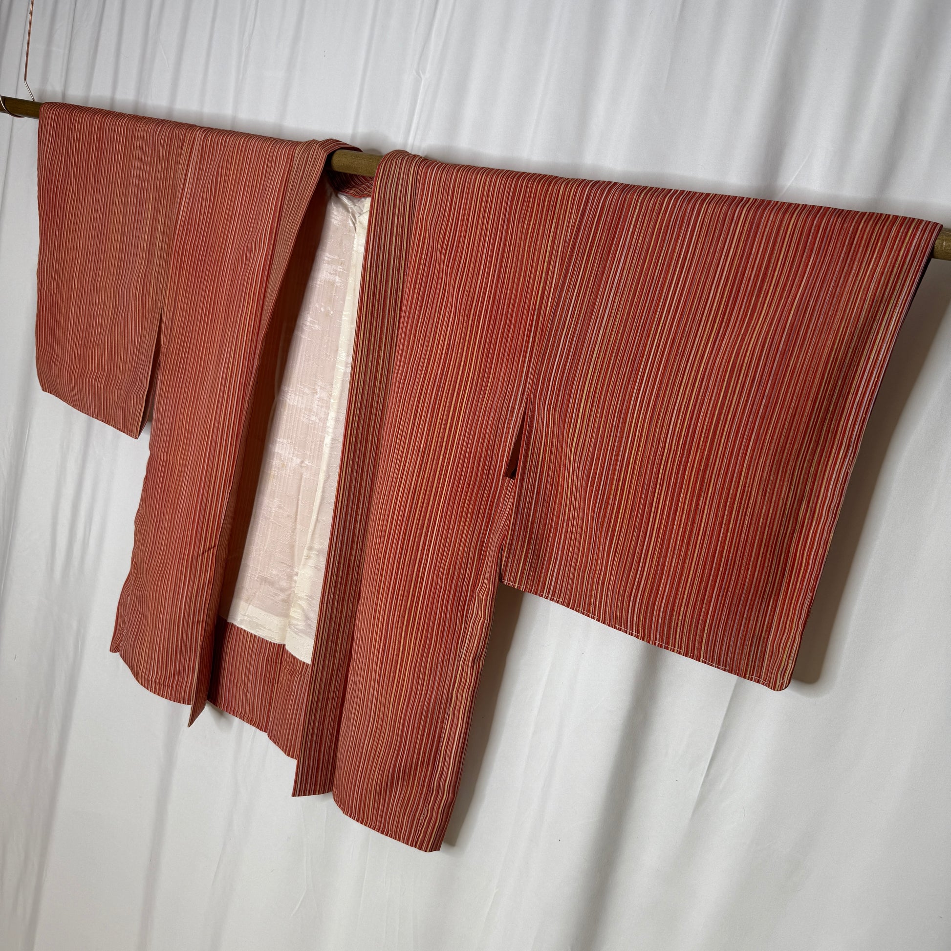 This haori jacket features a glowing palette of red, orange, gold, and pink in thin, hand-painted (!) stripes that create a variation of color - like sunrise captured in fabric. The narrow stripes create a rhythmic visual flow that moves beautifully across the body, giving this garment a lively sense of motion while still feeling grounded and cozy. It layers comfortably for everyday wear.