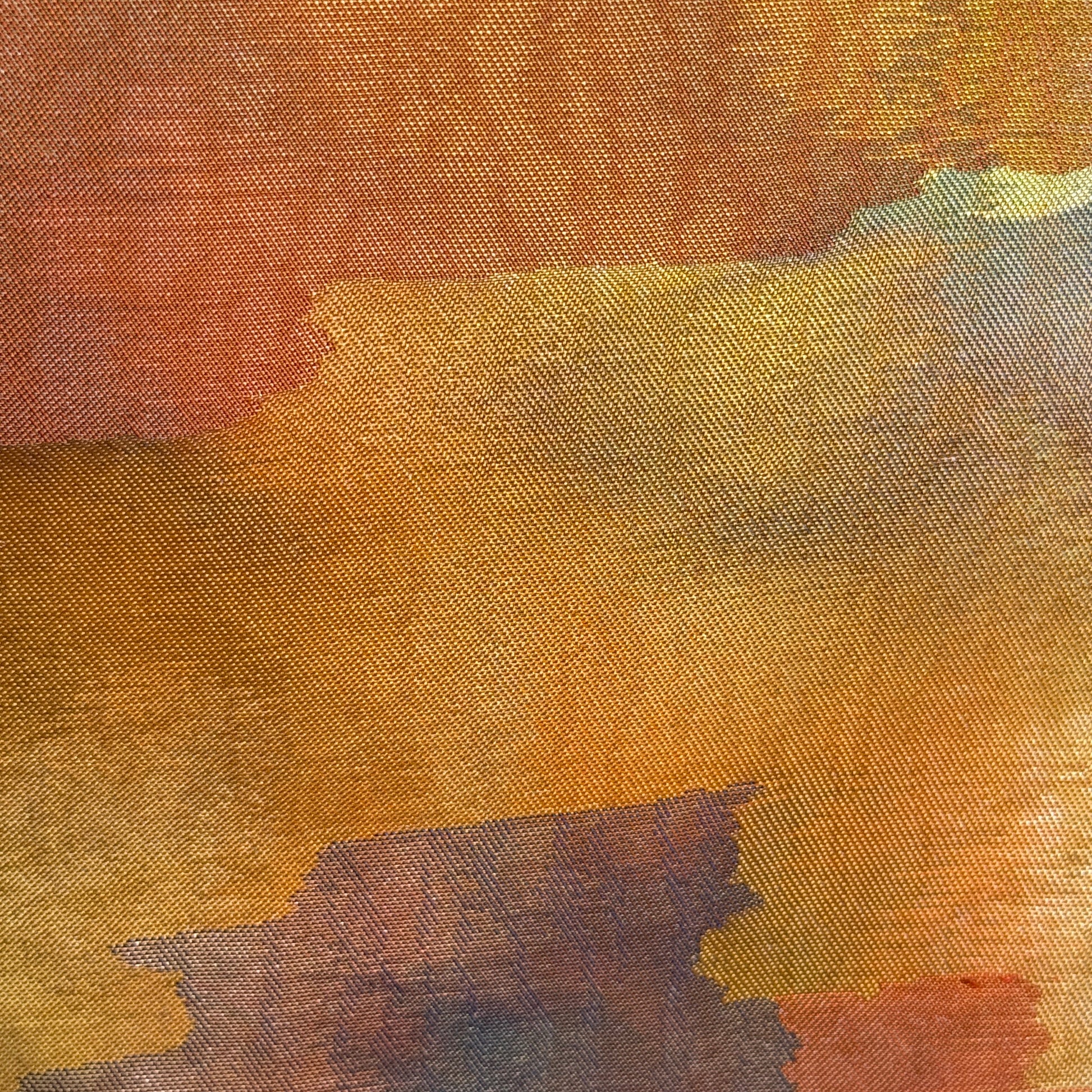Warm tones stretch across this piece like a shifting landscape, where layered color fields suggest horizon, earth, and fading light. This design leans into abstraction, letting rich gold, amber, and rust tones create depth through subtle transitions and woven texture. Without a defined motif, it invites interpretation, reading as a quiet landscape, a sunset, or simply a study in color and form.
