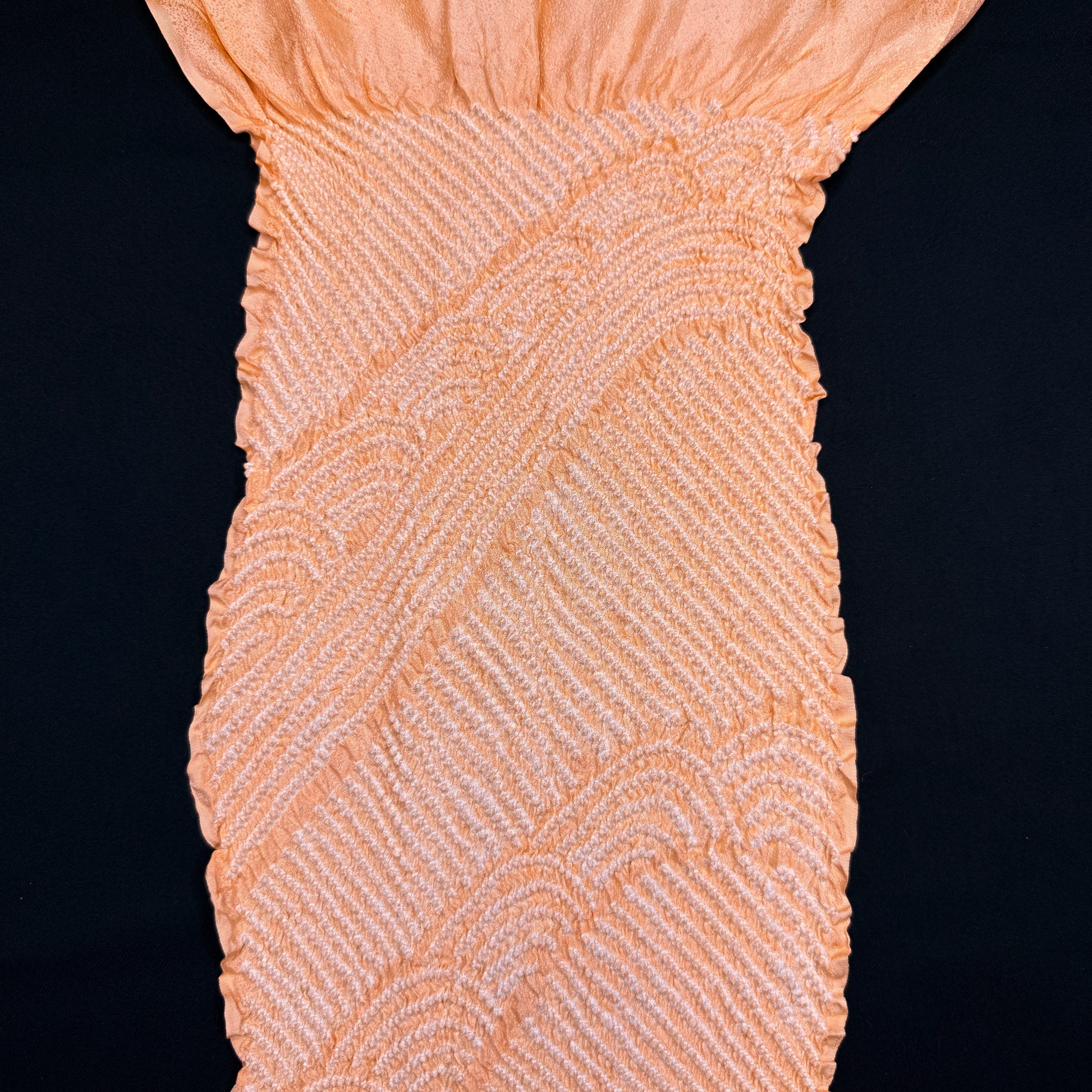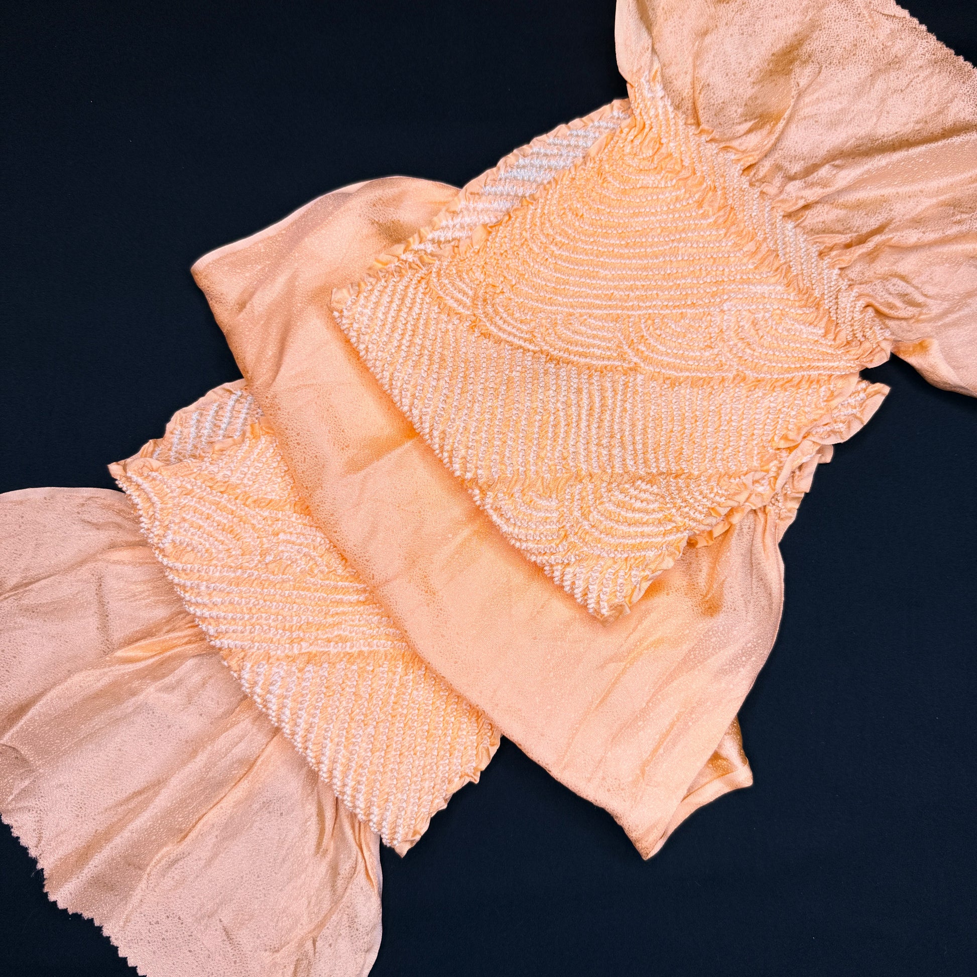 Like the last light of day shimmering across warm water, this peachy pink obiage and obijime set brings a soft glow to any kimono. The obiage features white puckered shibori waves layered over a subtle speckled jacquard. Paired with a matching flat woven obijime accented with fine gold threads, the set feels harmonious and refined with being overpowering. Adds a touch of warmth!