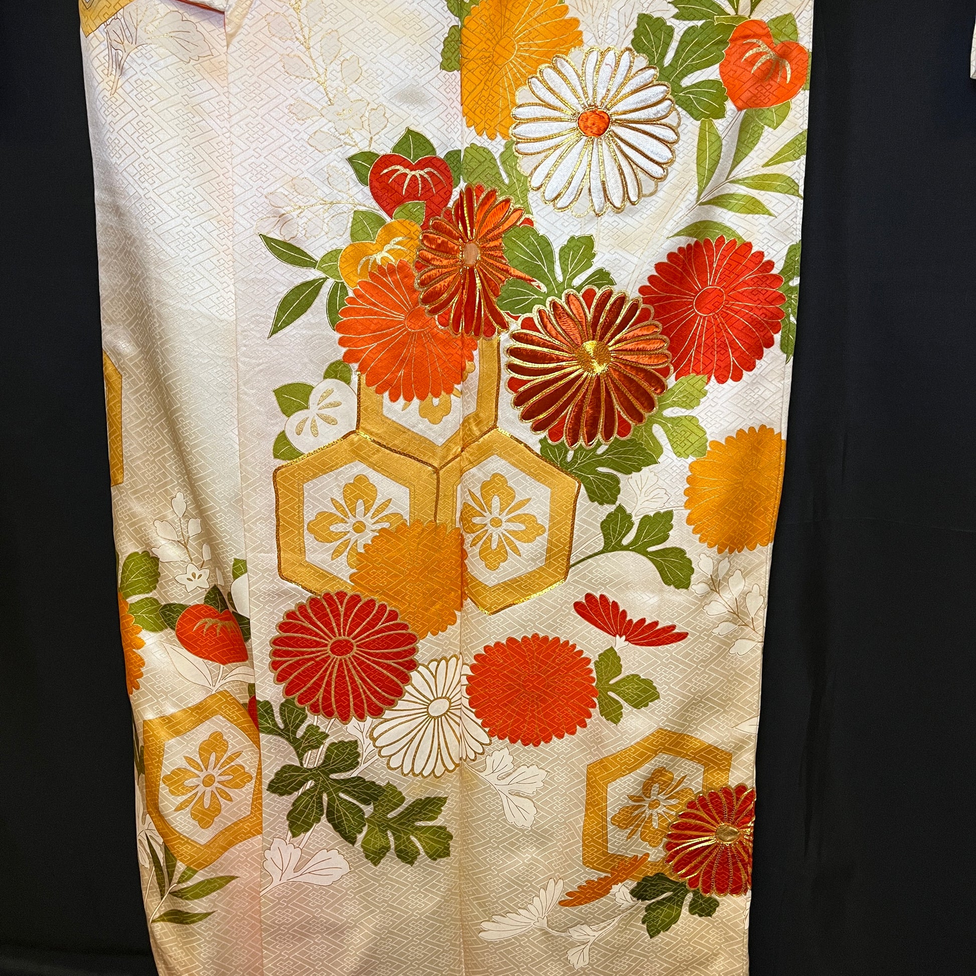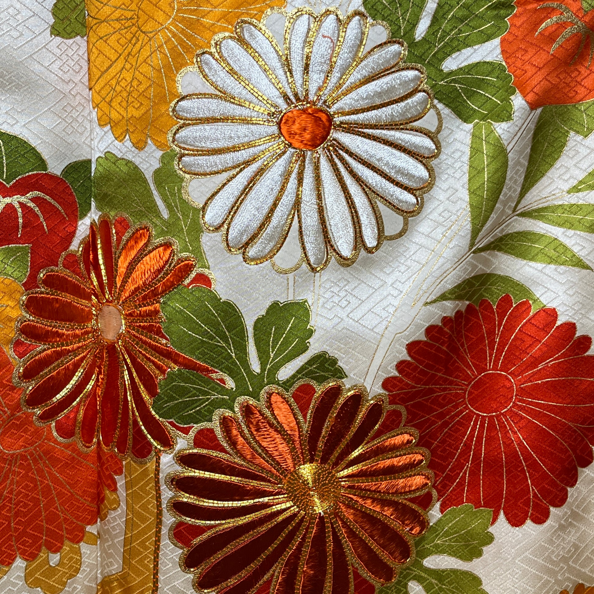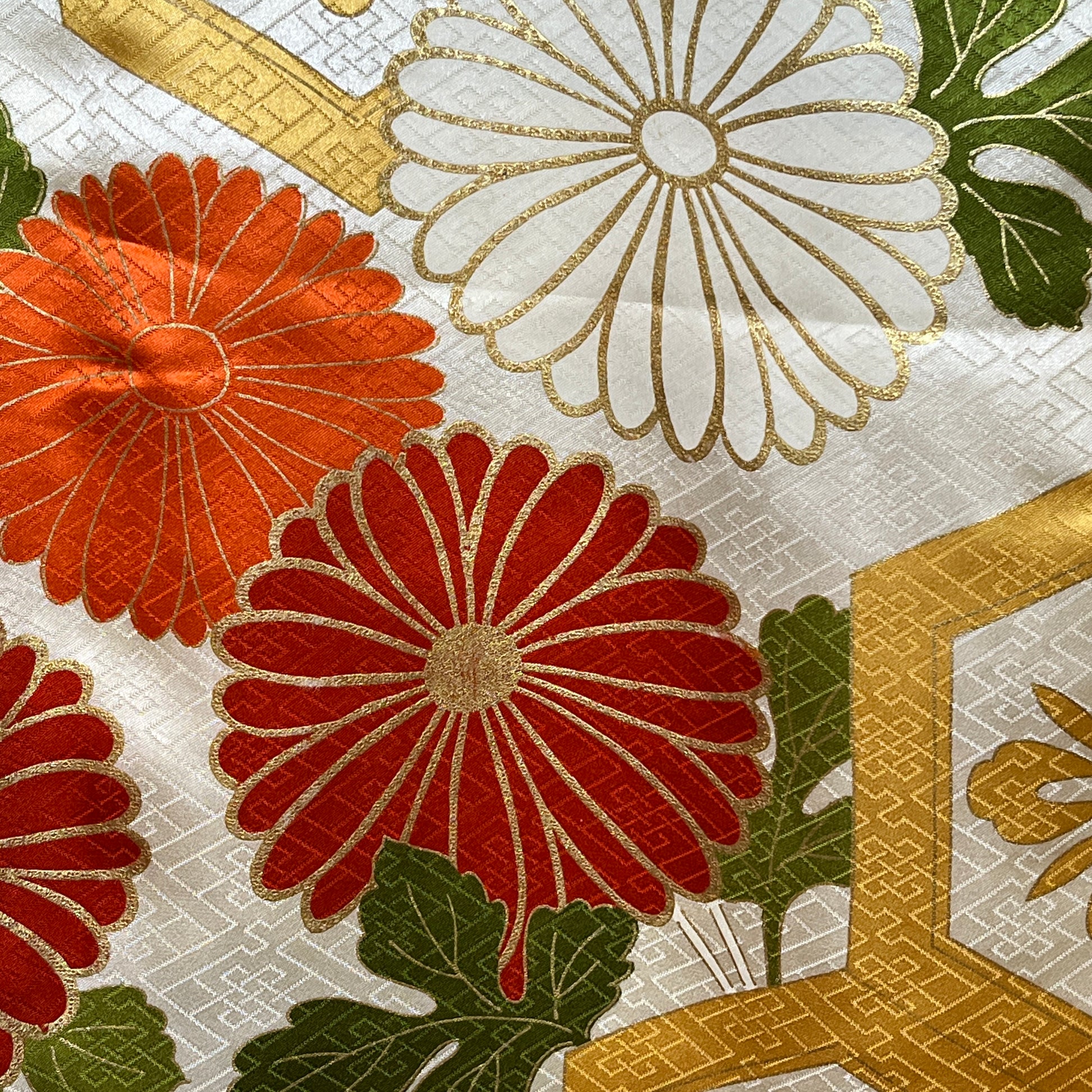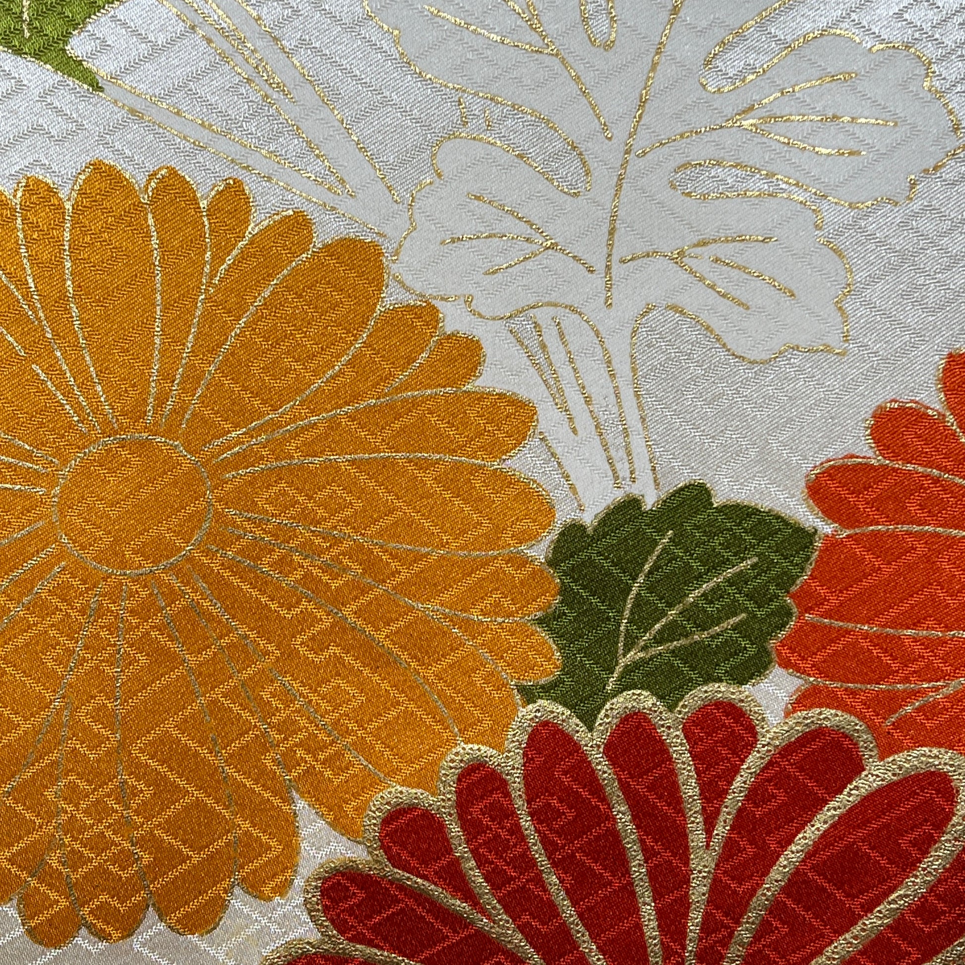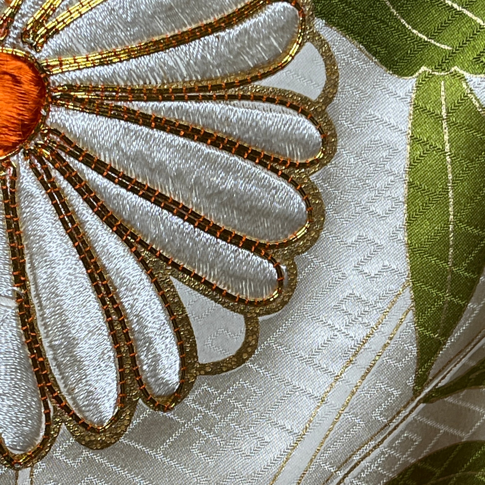 This kimono features a creamy silk with an abundance of autumn-palette chrysanthemums and tachibana (citrus fruit) blossoms. Beautiful shades of orange, yellow, and green with highlights of gold in the gold leaf and couched embroidery. Look closely to see the unique knot-like geometric jacquard design. See videos below on all the techniques.